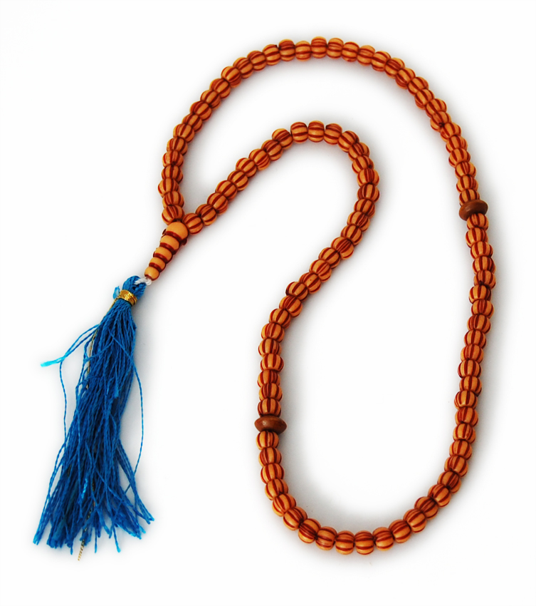 Chapelet "Sebha" à 99 grains de couleur marron clair avec motif sous formes de lignes longitudinales, et avec pompon bleu.