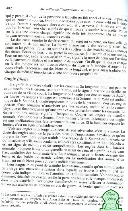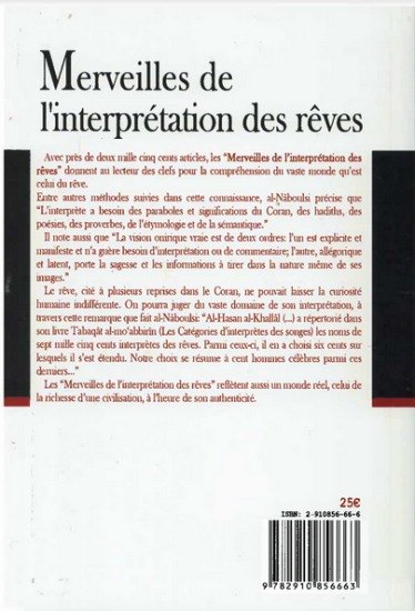 Le Grand Dictionnaire de l’interprétation des rêves selon la tradition musulmane Avec près de deux mille cinq cents (2500) articles, les “Merveilles de l’interprétation des rêves” représente un dictionnaire très complet sur l’interprétation des rêves selon la tradition musulmane. Il donne au lecteur les clefs pour la compréhension du vaste monde qu’est celui du rêve.