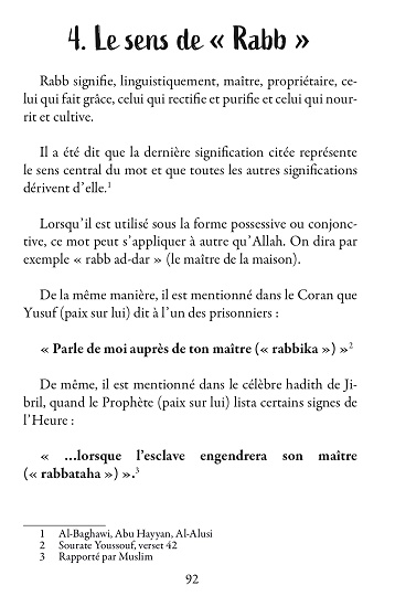 la reconnaissance du fait que Lui seul mérite l’éloge et l’adoration, que Lui seul doit être appelé en secours, que Lui seul doit être craint, que l’on doit espérer en Lui seul, que Lui seul doit être invoqué, que le Jour du Jugement existe avec certitude, que la guidance nous est venue et qu’il nous est demandé de la suivre.