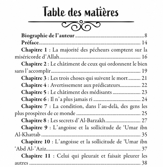 C’est pour cette raison que j’ai collecté, dans cet ouvrage, des récits terrifiants, des avertissements contre les péchés, des narrations décrivant les châtiments et des histoires qui mettent le cœur dans un état inconfortable. Tout cela dans le but de rendre le confiant anxieux, d’attendrir les cœurs durs, de faire naitre des larmes dans les yeux secs, et de motiver le paresseux.