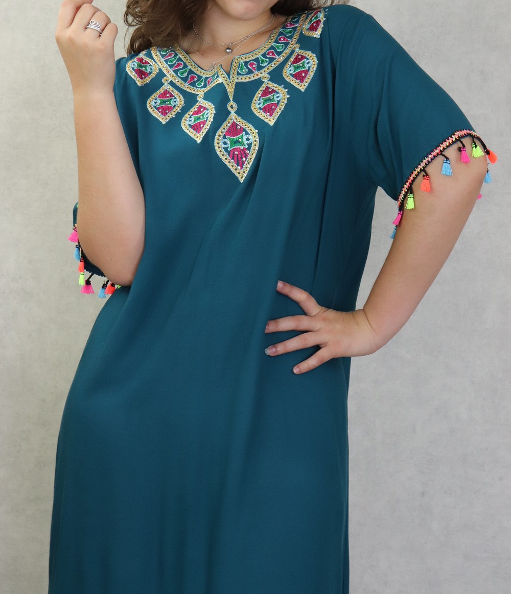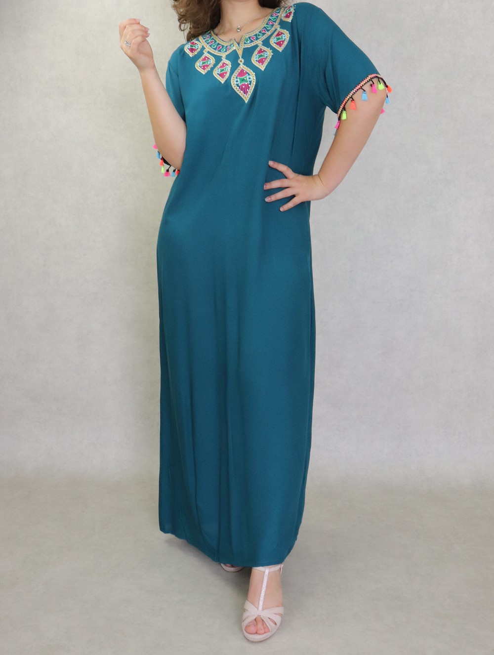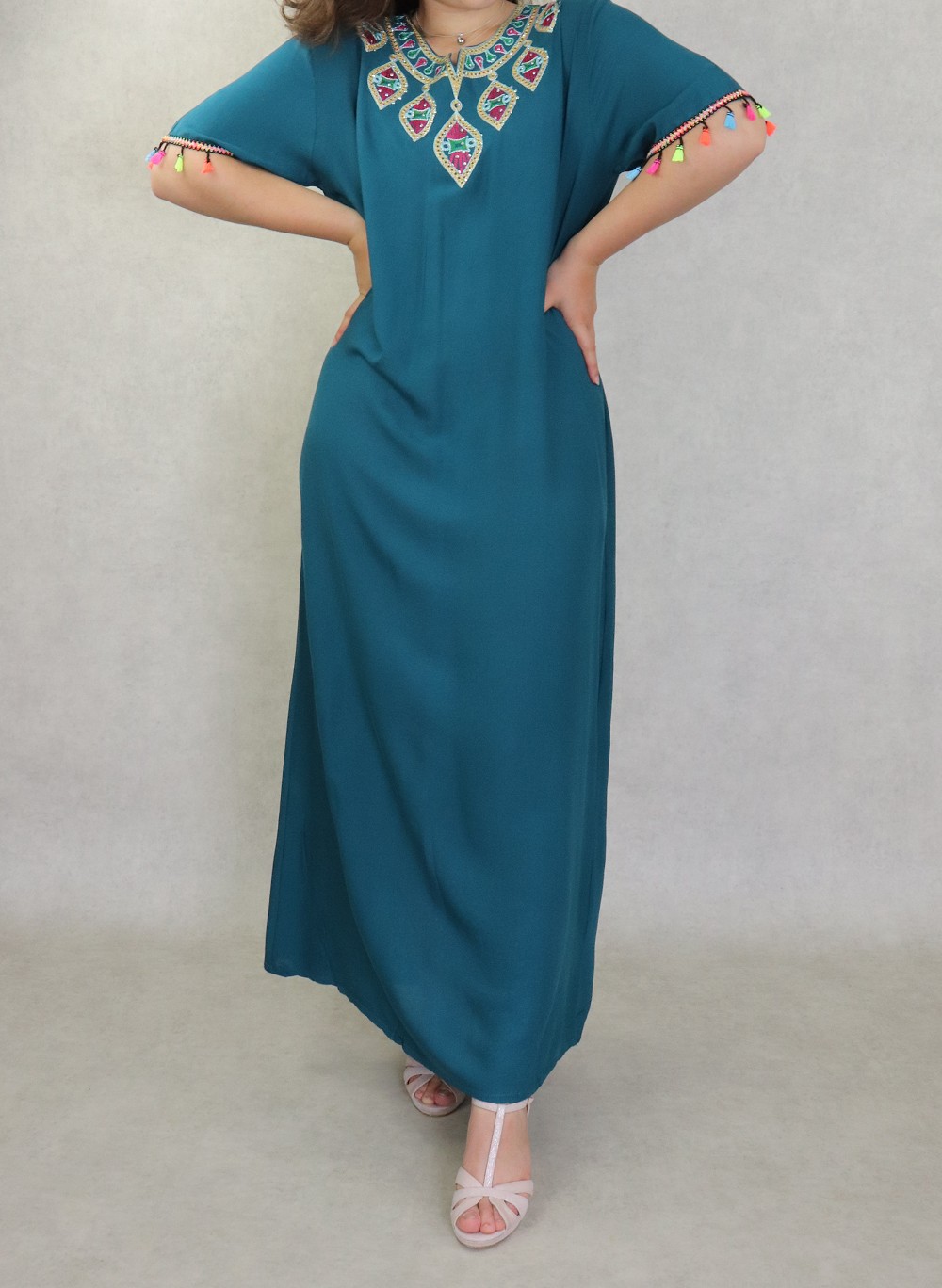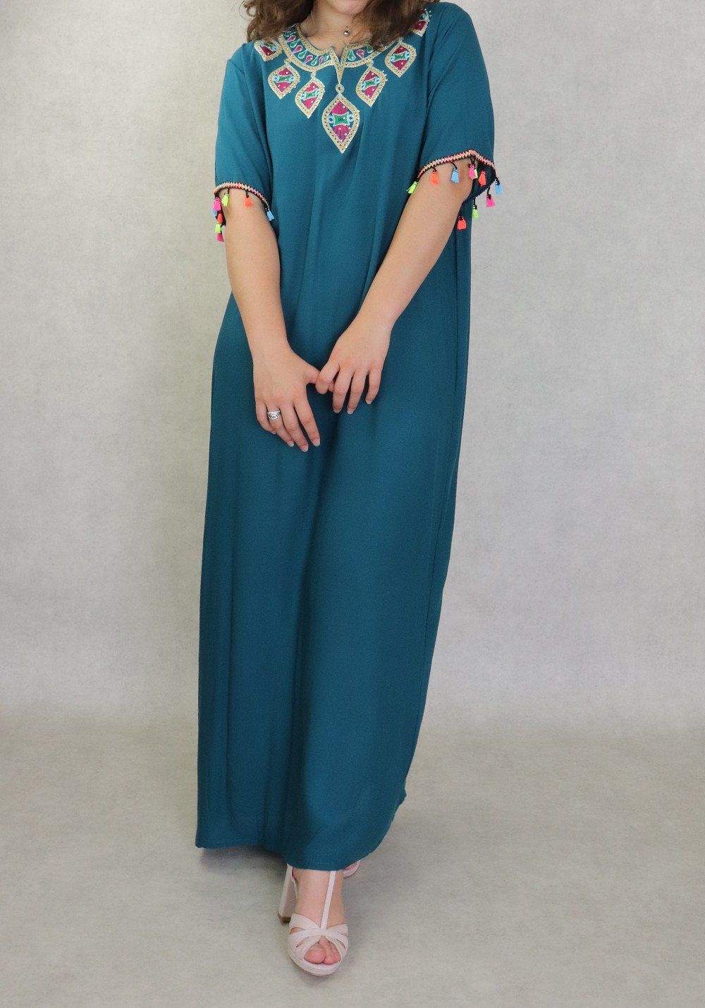 Découvrez cette belle robe et craquez pour ses jolis strass et ses motifs berbères, col rond semi ouvert, manches courtes avec des pompons multi-couleur. La coupe de cette gandoura ainsi que sa matière faciliteront une décontraction évidente.