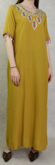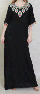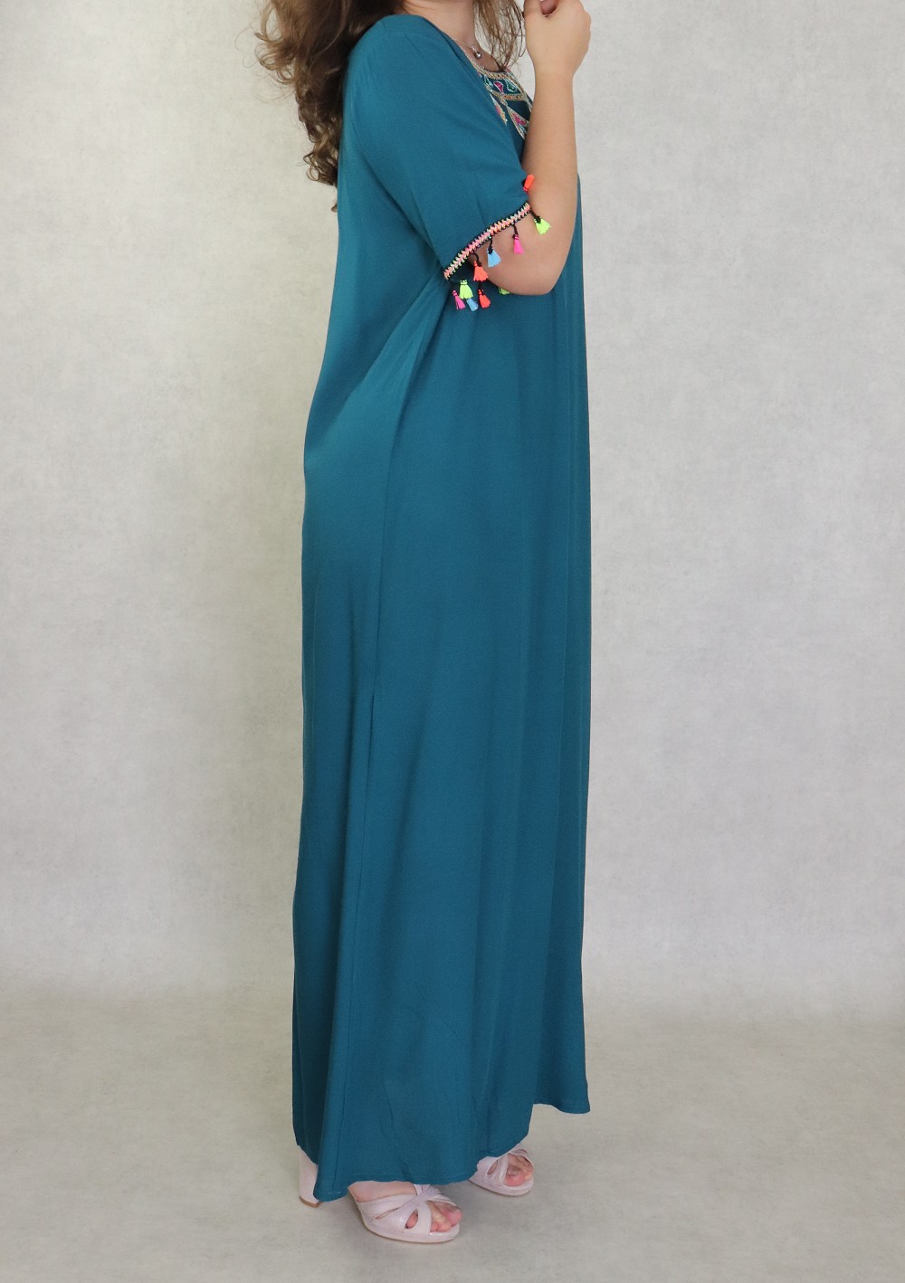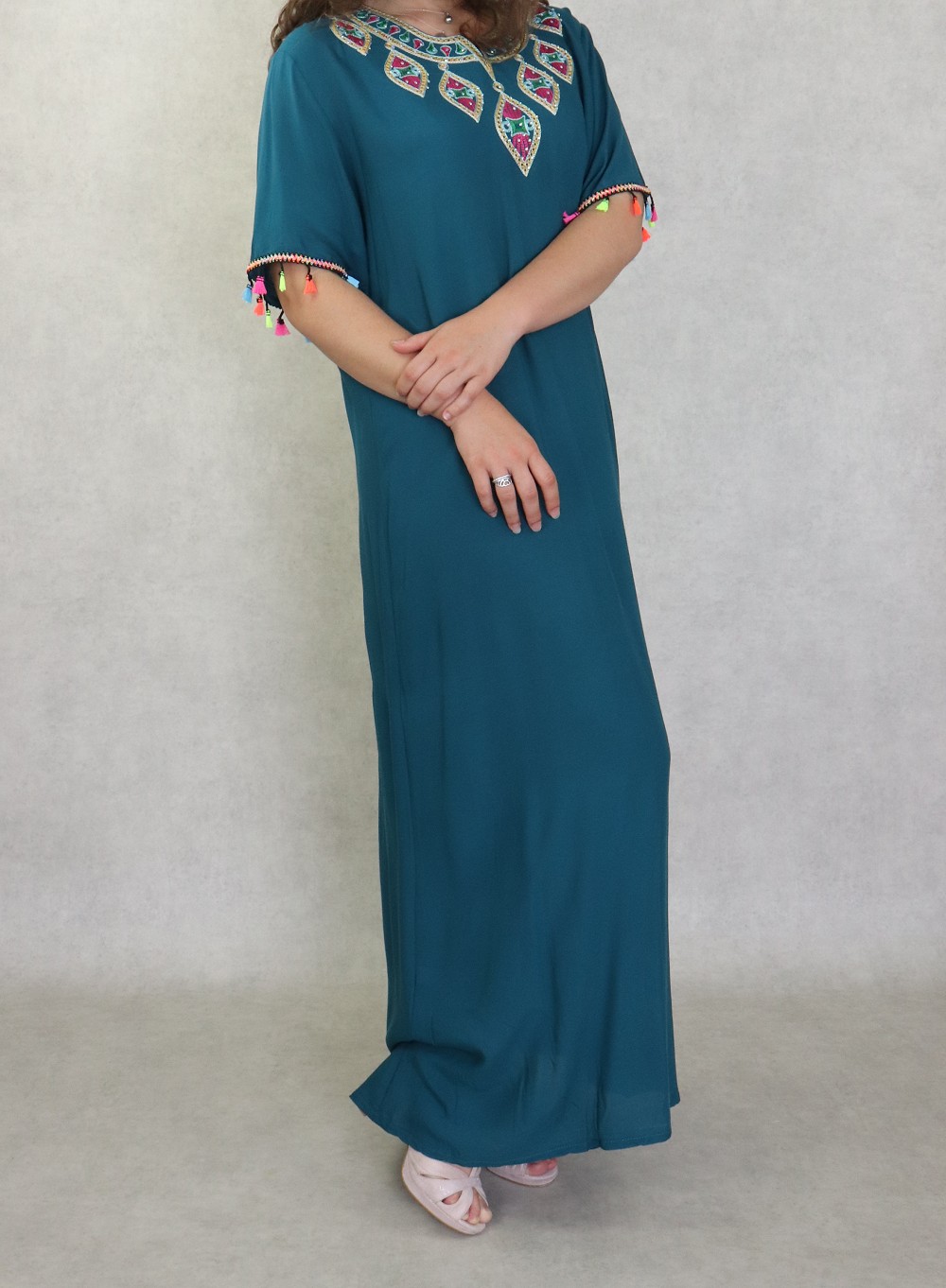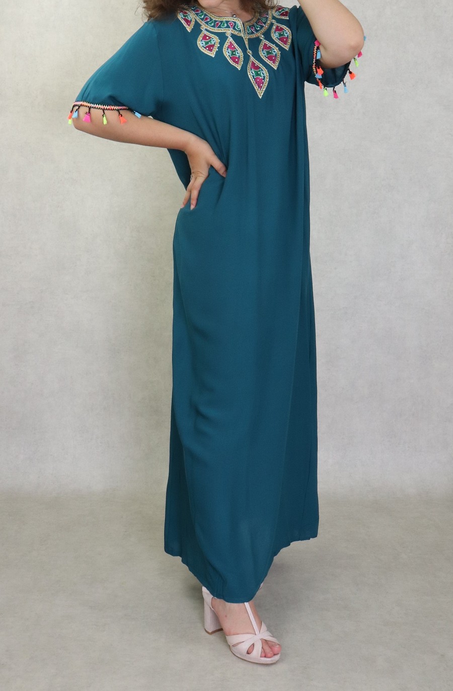 Découvrez cette belle robe et craquez pour ses jolis strass et ses motifs berbères, col rond semi ouvert, manches courtes avec des pompons multi-couleur. La coupe de cette gandoura ainsi que sa matière faciliteront une décontraction évidente.