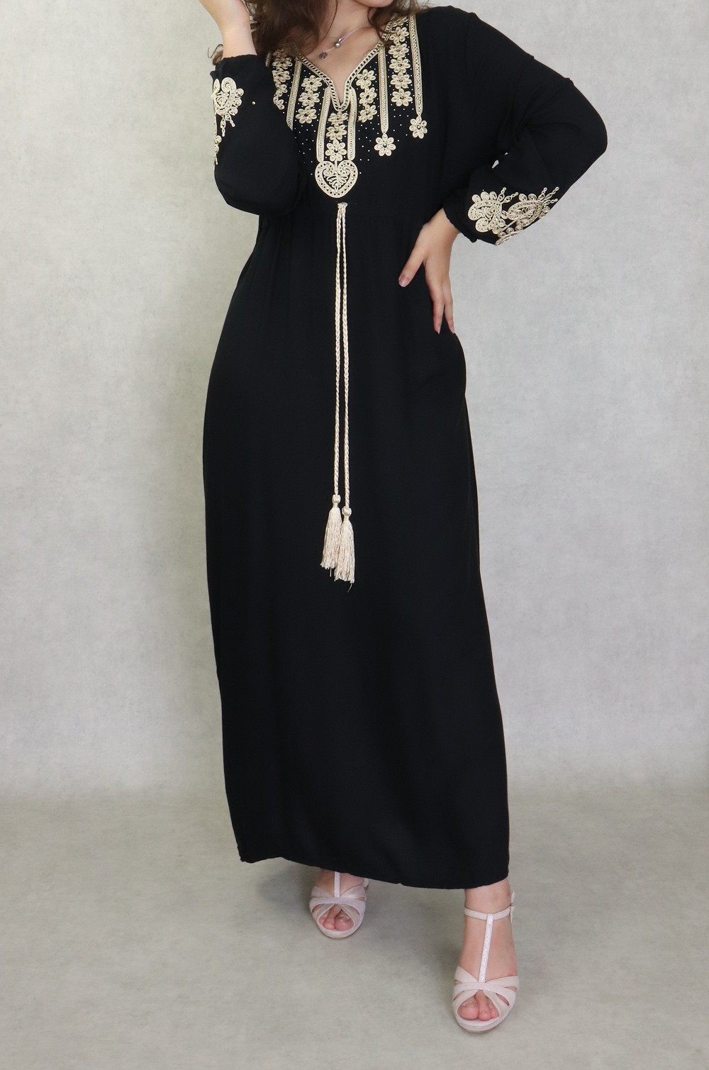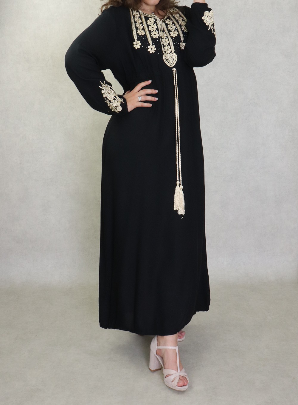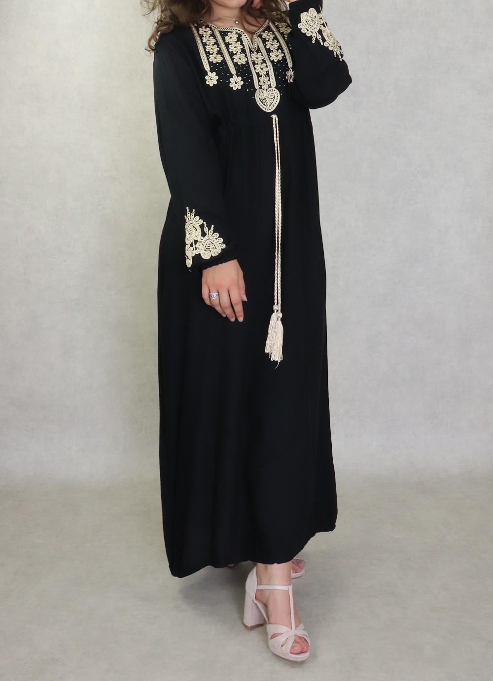 Robe longue, élégante avec strass et broderie, tissu épais (non transparent), col semi ouvert, taille à ajuster avec un jolie lien de serrage à pompons, manches longues brodées finition élastiques aux poignets.