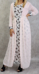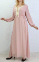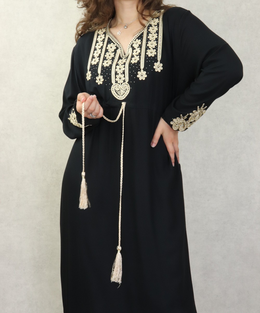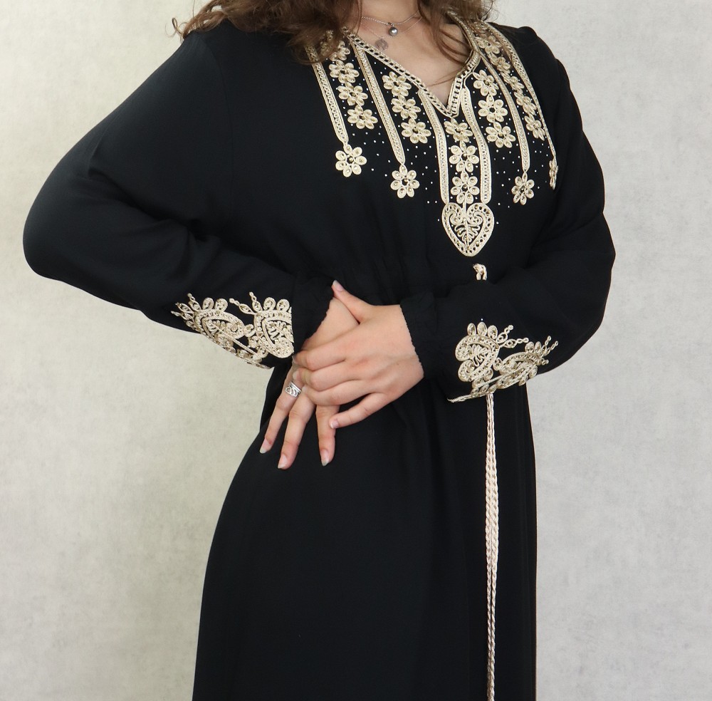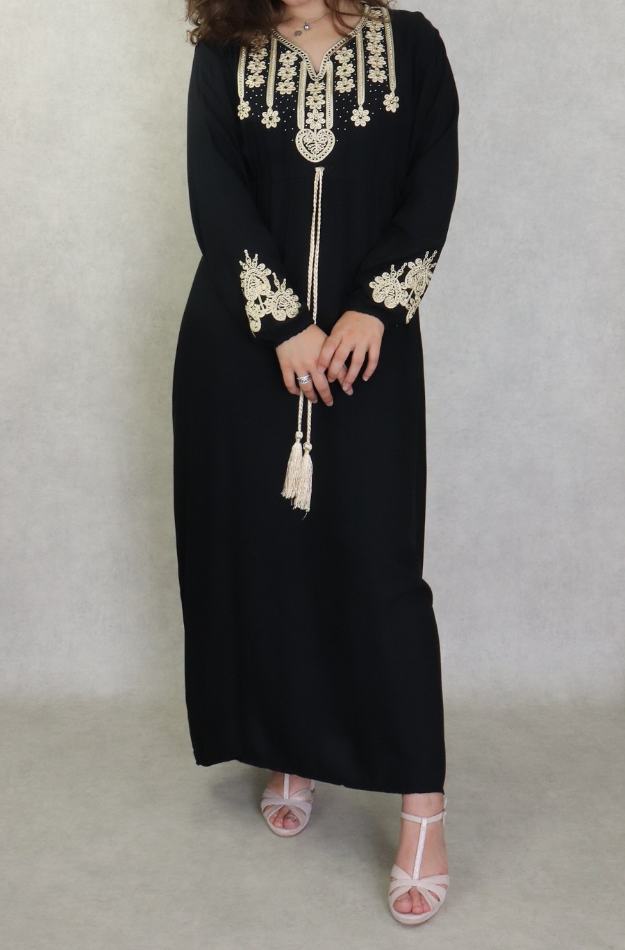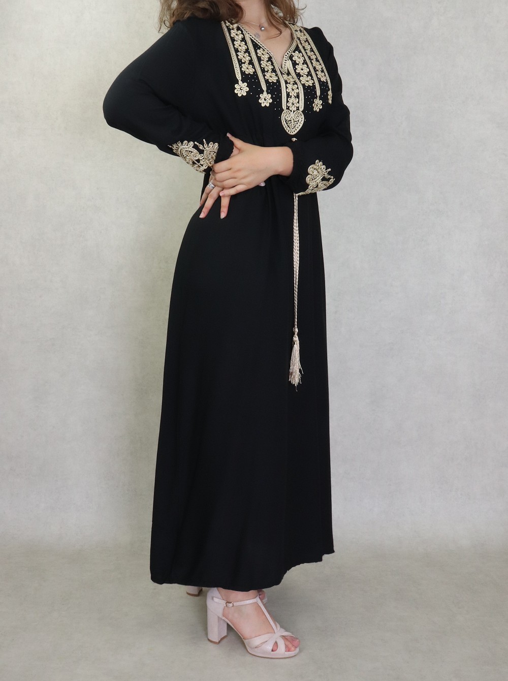 Robe longue, élégante avec strass et broderie, tissu épais (non transparent), col semi ouvert, taille à ajuster avec un jolie lien de serrage à pompons, manches longues brodées finition élastiques aux poignets.