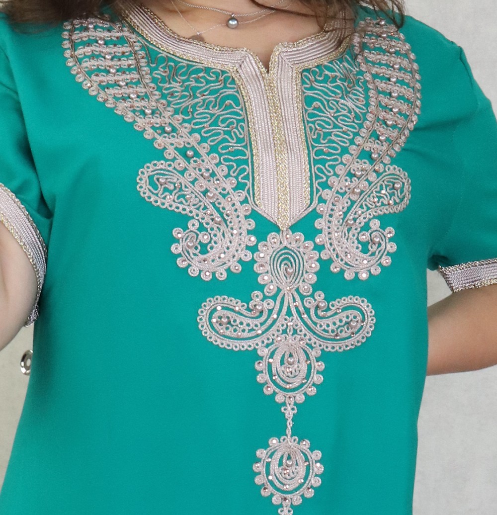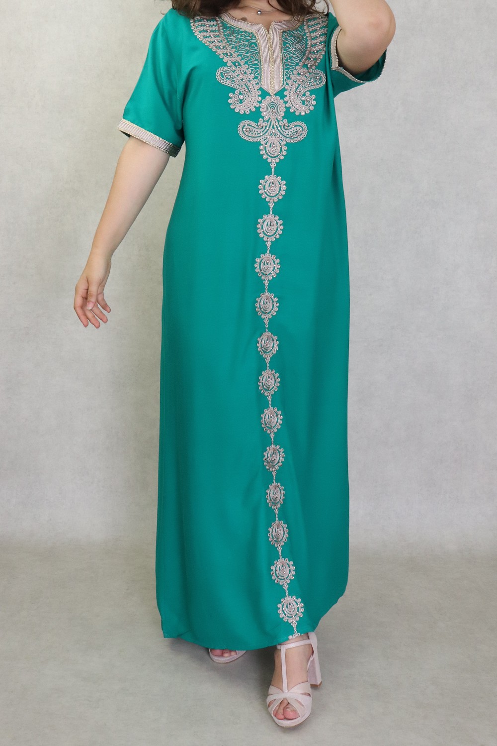 Robe orientale longue manche courte avec belles broderies pour femme - Couleur Vert émeraude - REF. 32856 (25.00 €)