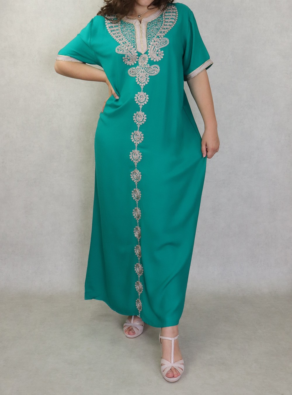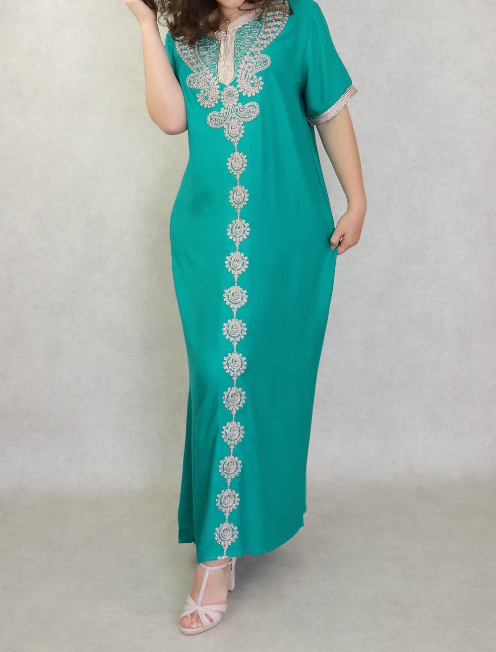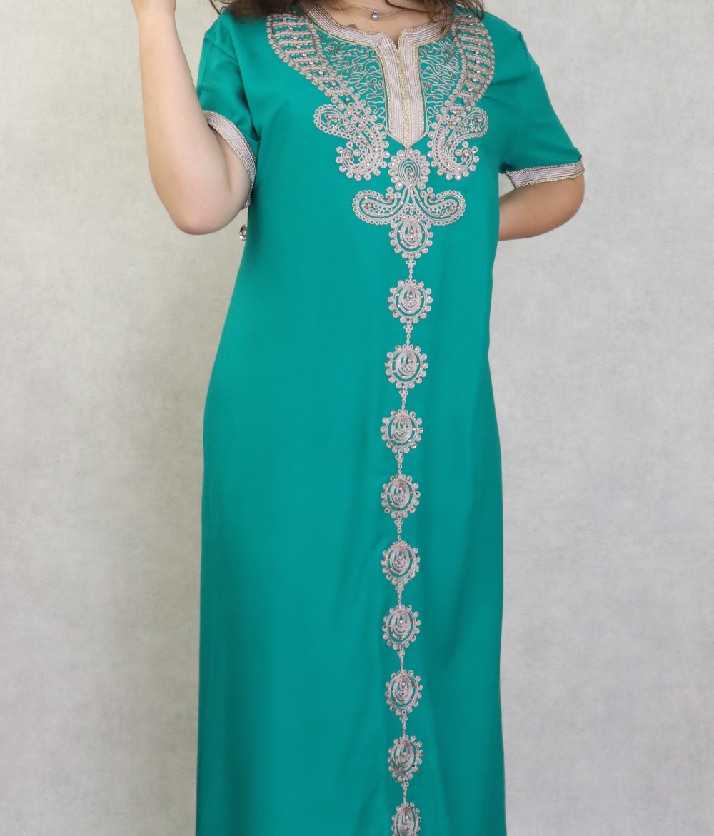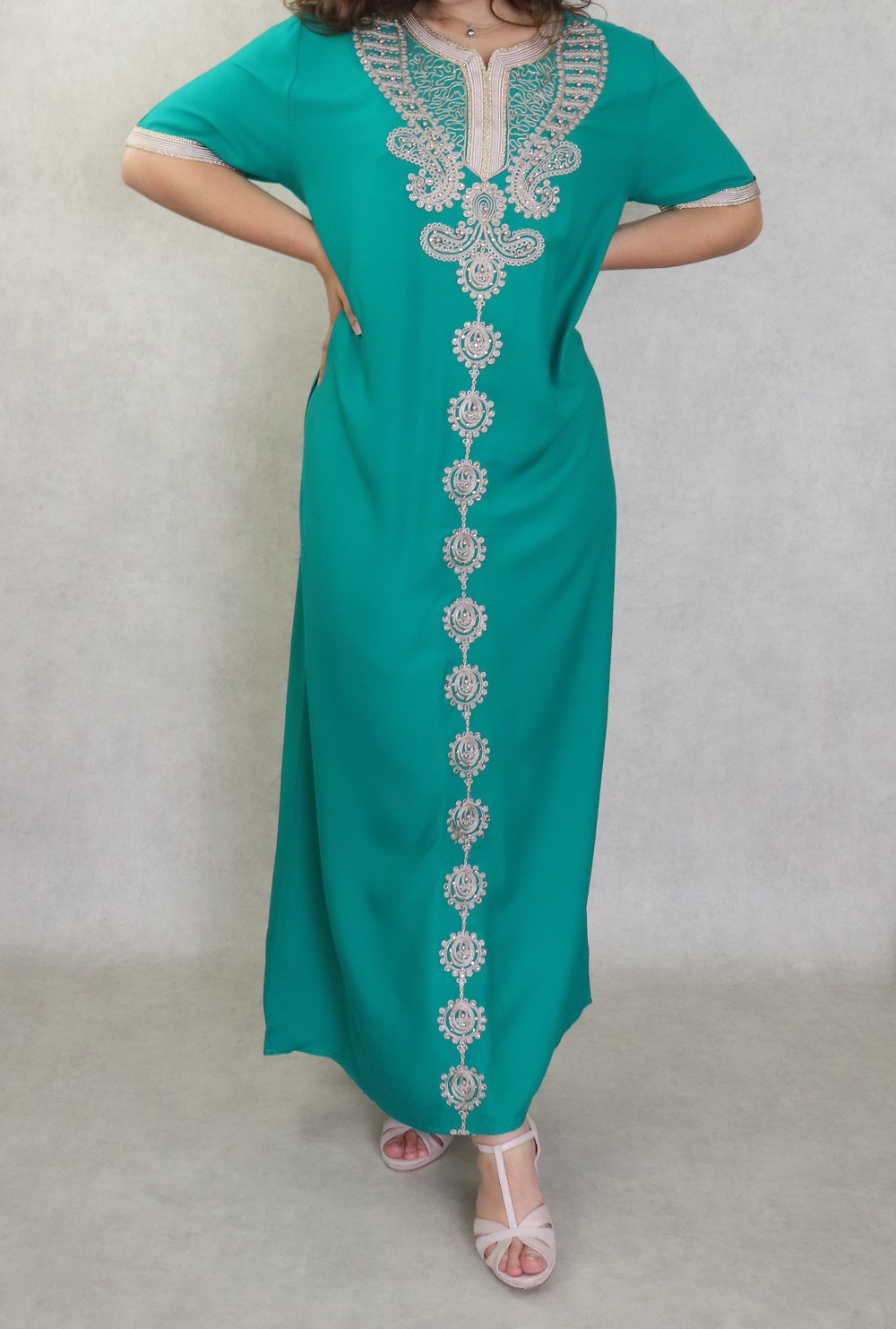 Robe orientale longue manche courte avec belles broderies pour femme - Couleur Vert émeraude - REF. 33580 (25.00 €)