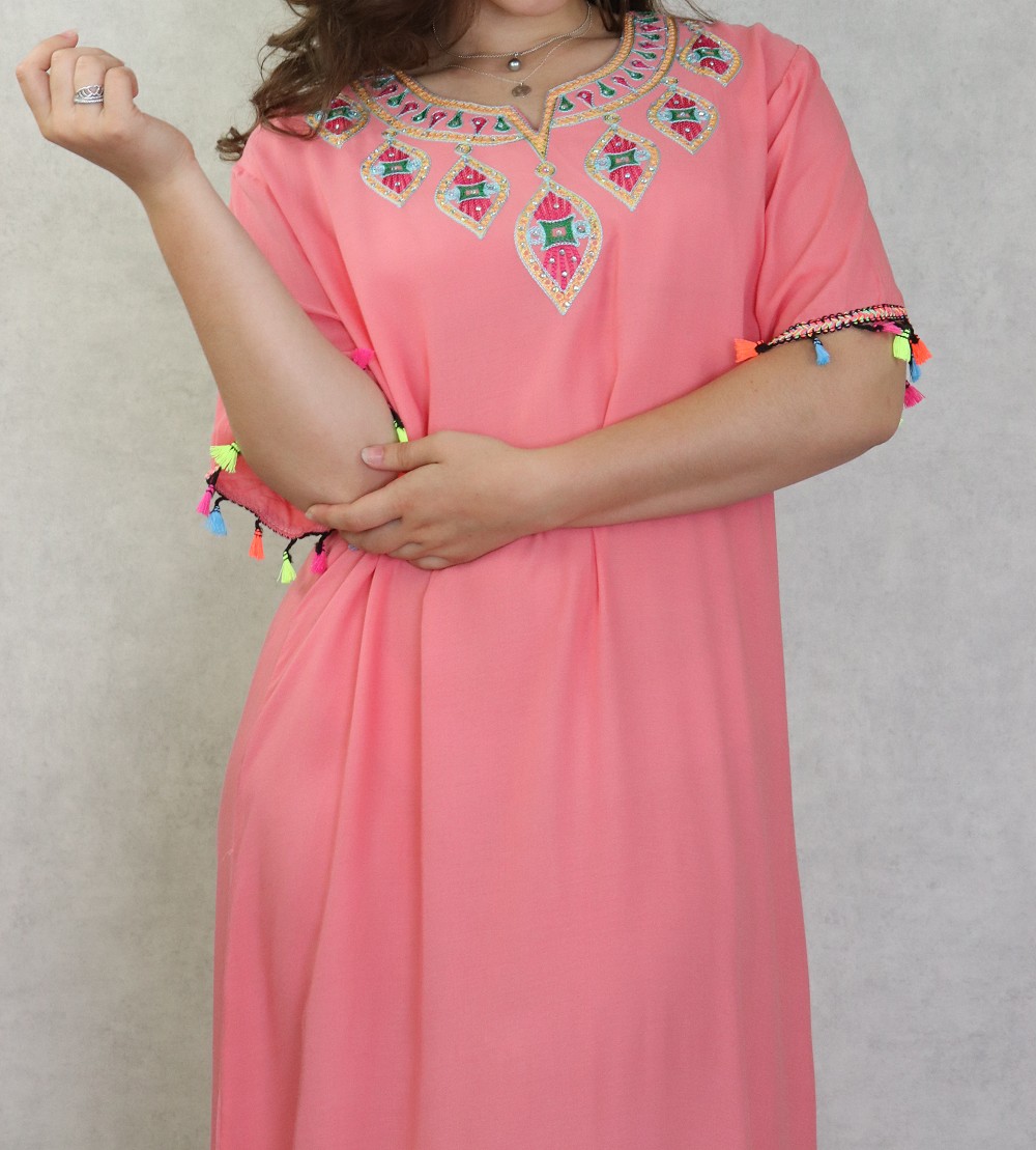 Découvrez cette belle robe et craquez pour ses jolis strass et ses motifs berbères, col rond semi ouvert, manches courtes avec des pompons multi-couleur. La coupe de cette gandoura ainsi que sa matière faciliteront une décontraction évidente.
