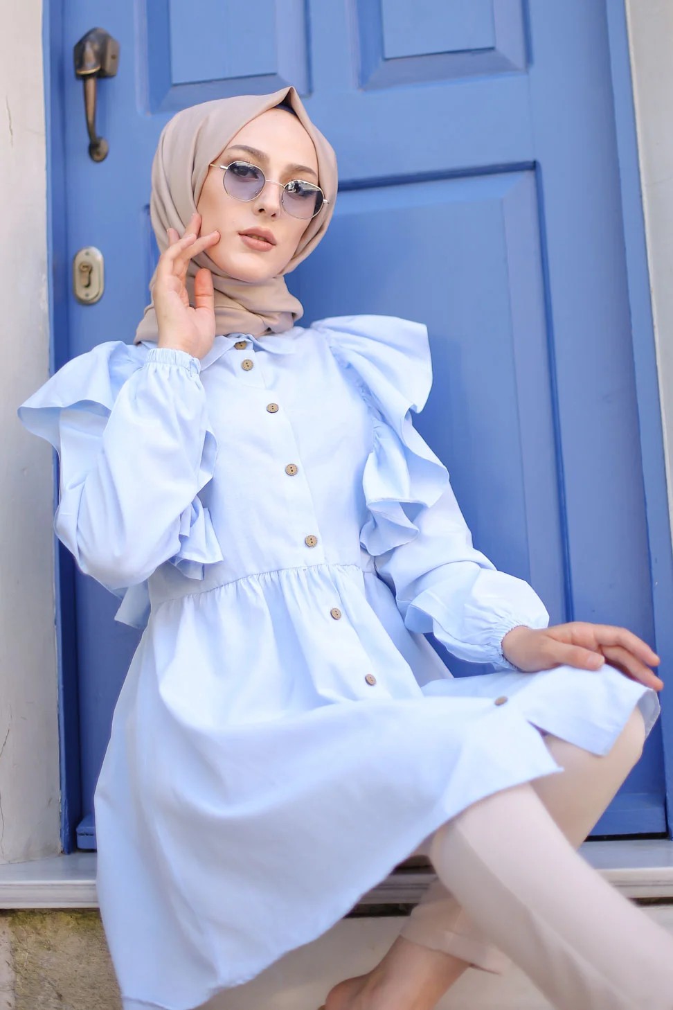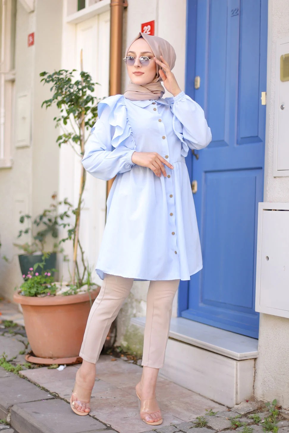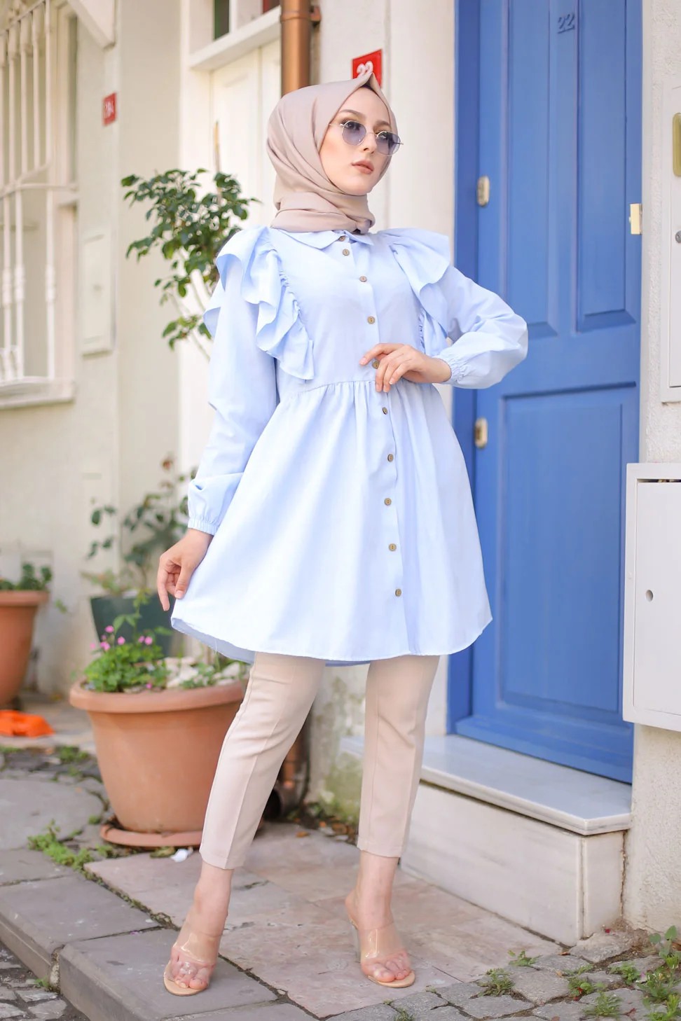 Chemise à froufrou (Vetement femme voilée chic) - Couleur bleu ciel Vetement & Accessoire
