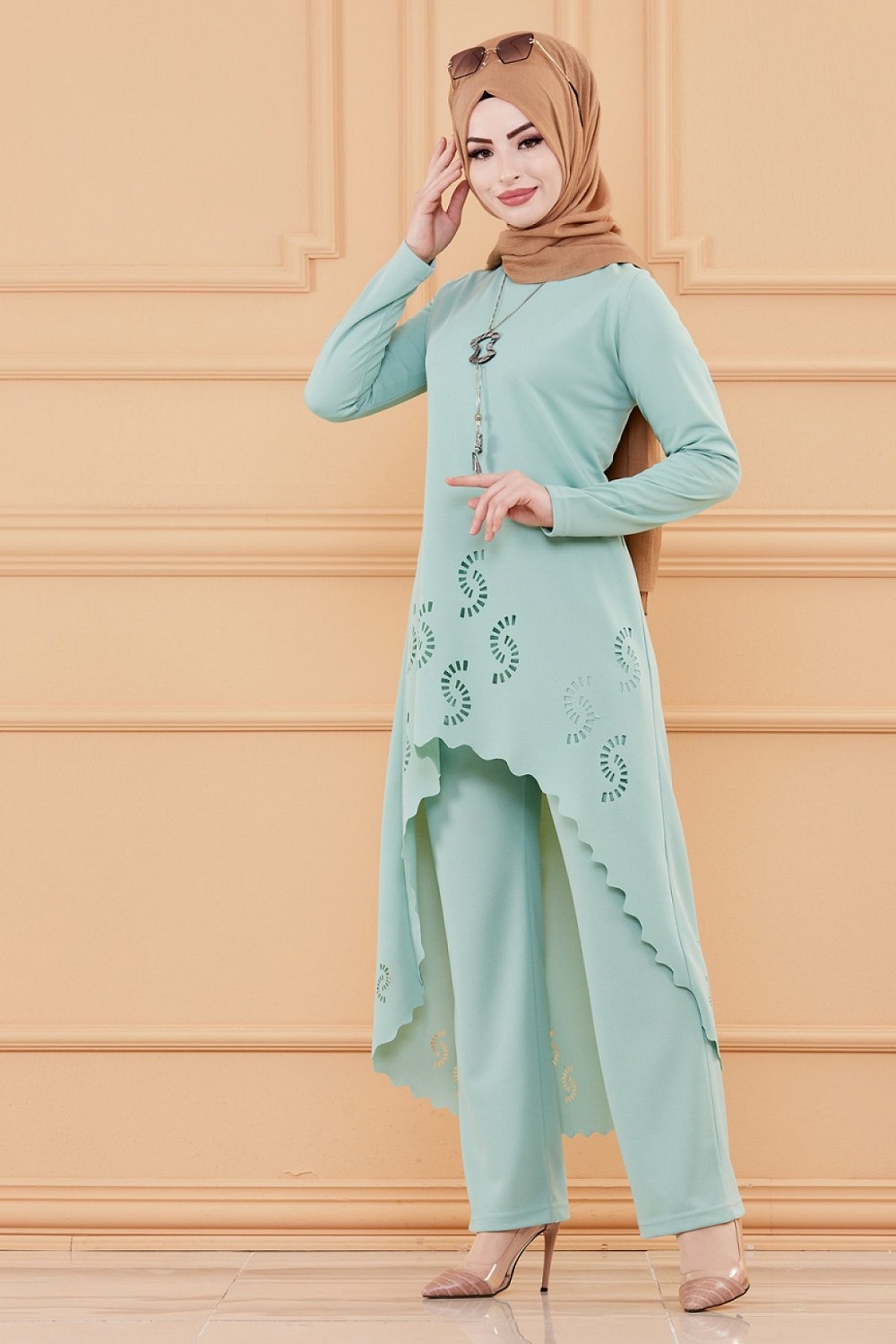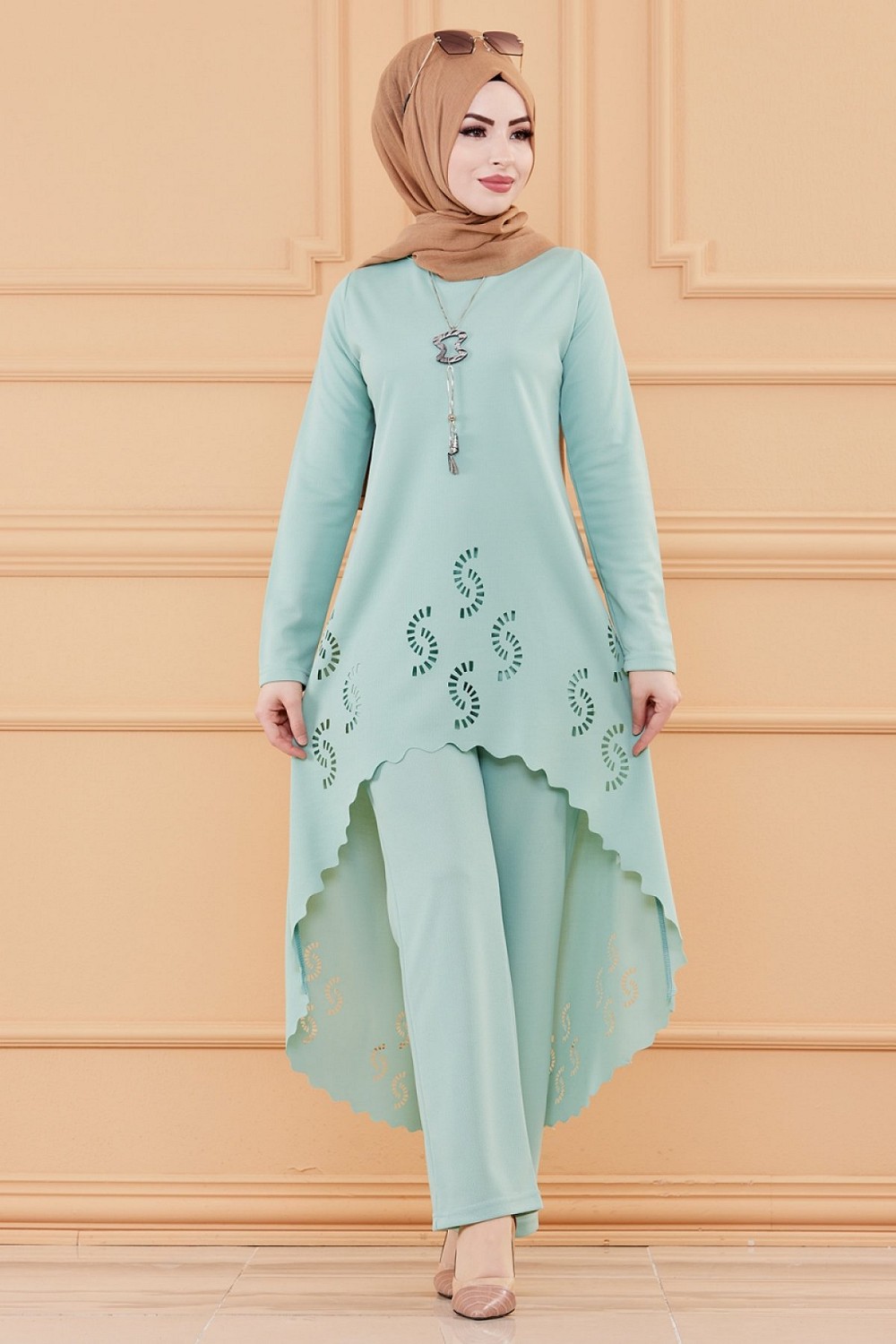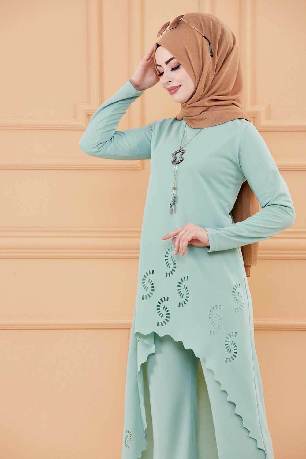 Ensemble découpé au laser : Tunique et pantalon assorti pour femme (Vêtement hijab classe) - Couleur menthe Vetement & Accessoire