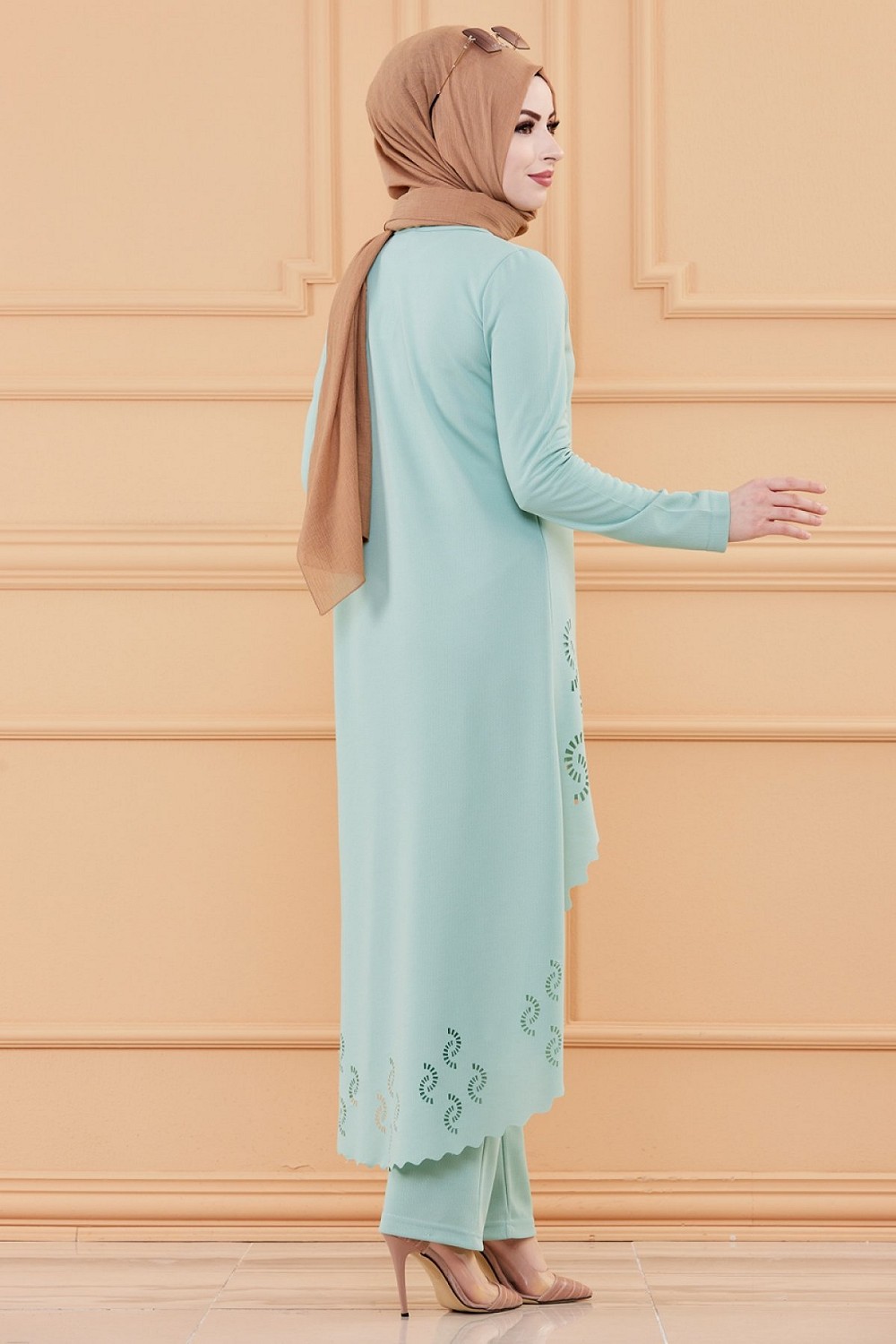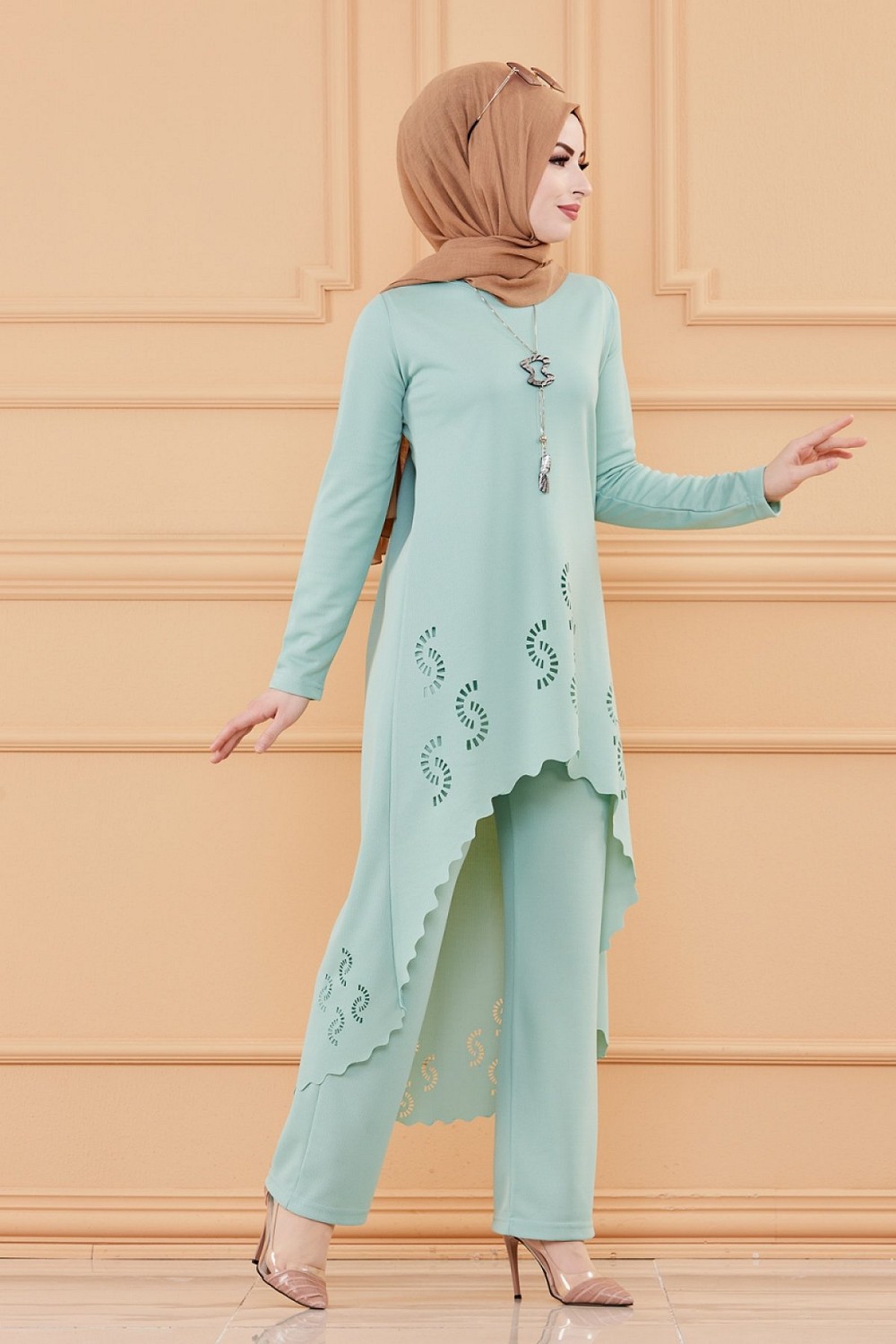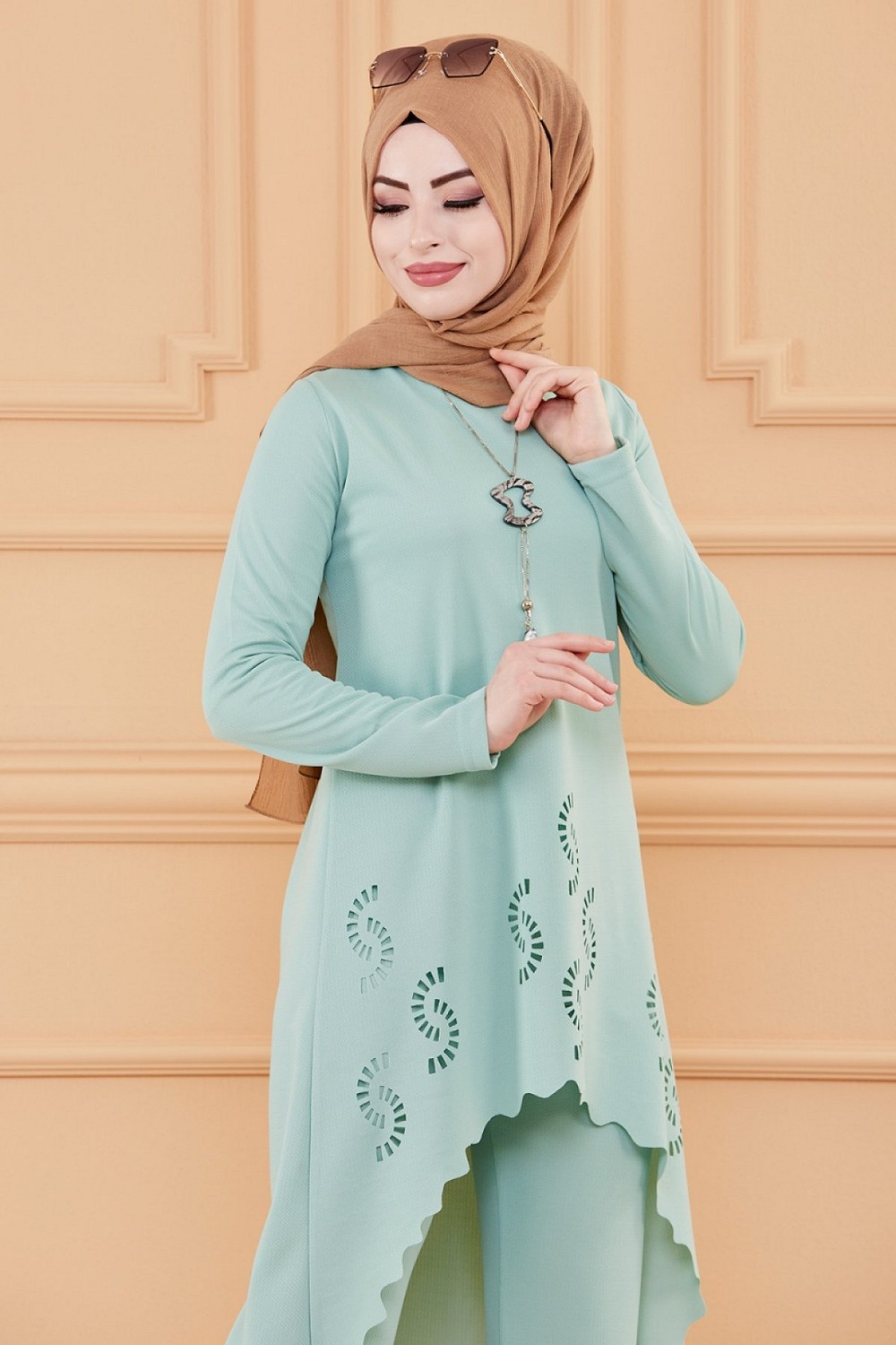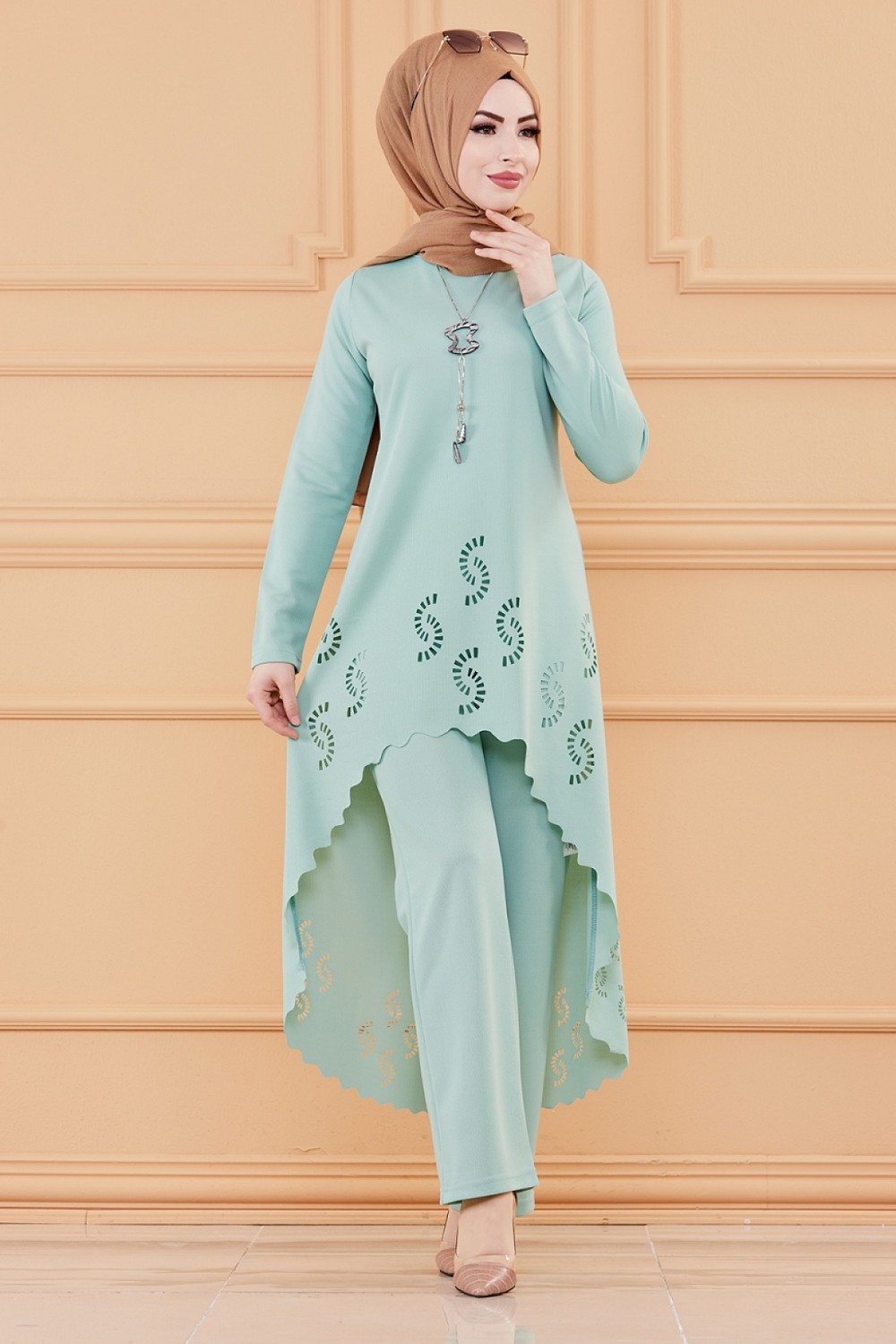 Ensemble découpé au laser : Tunique et pantalon assorti pour femme (Vêtement hijab classe) - Couleur menthe Vetement & Accessoire