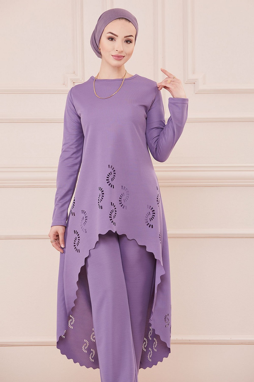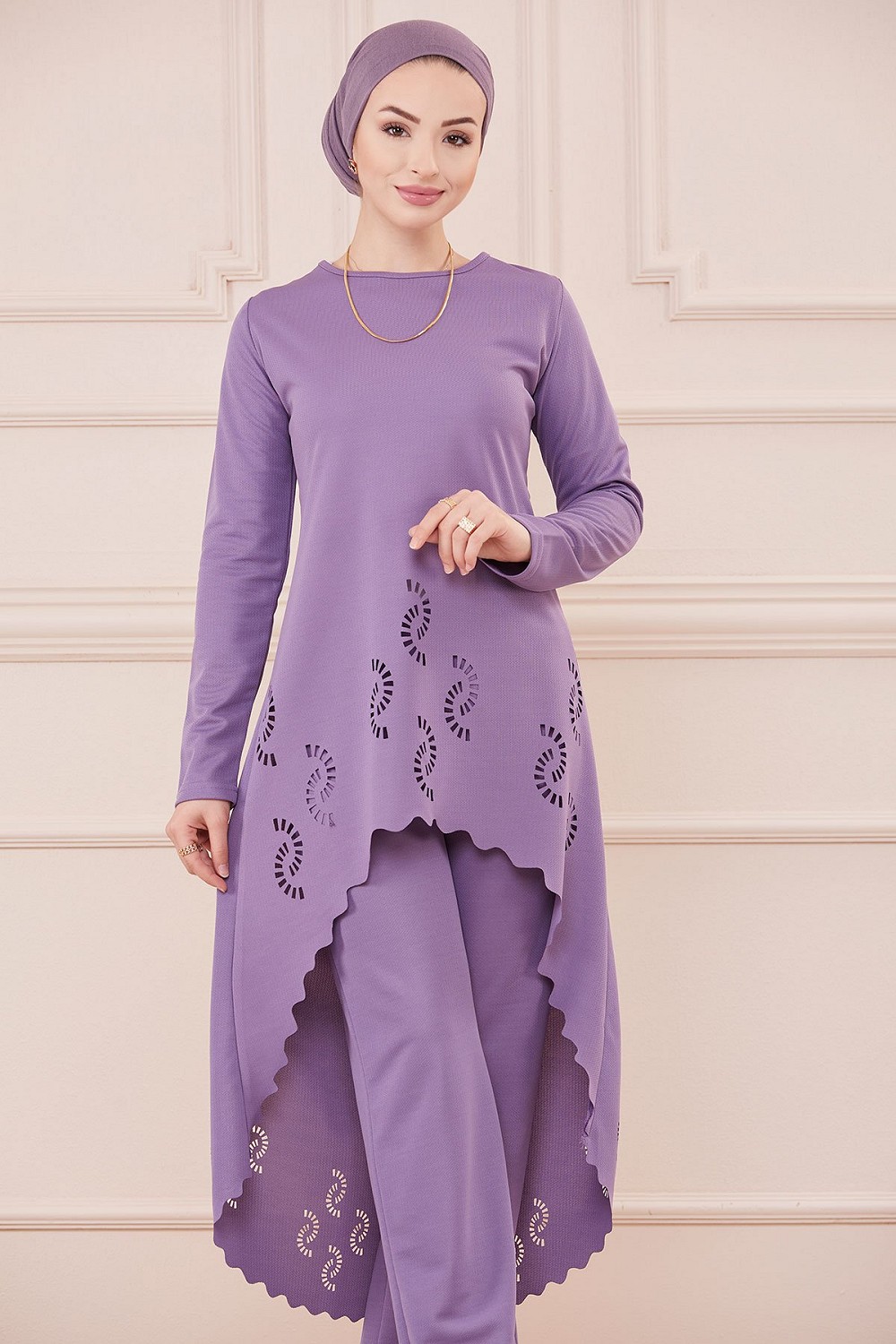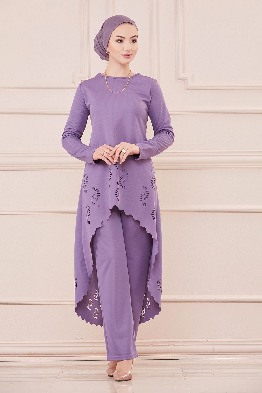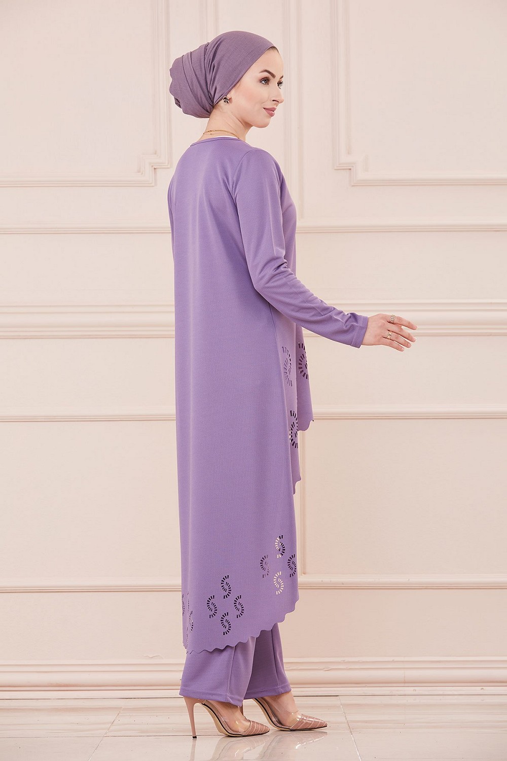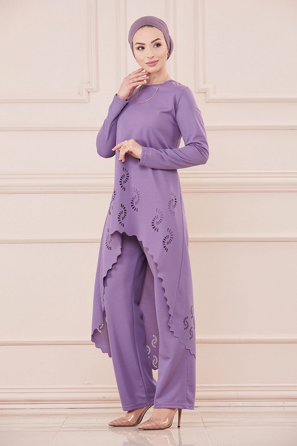 Ensemble découpé au laser : Tunique et pantalon assorti pour femme (Vêtement hijab habillé) - Couleur lilas Vetement & Accessoire