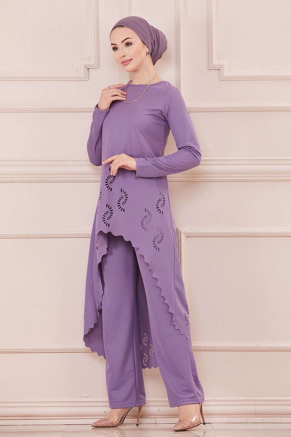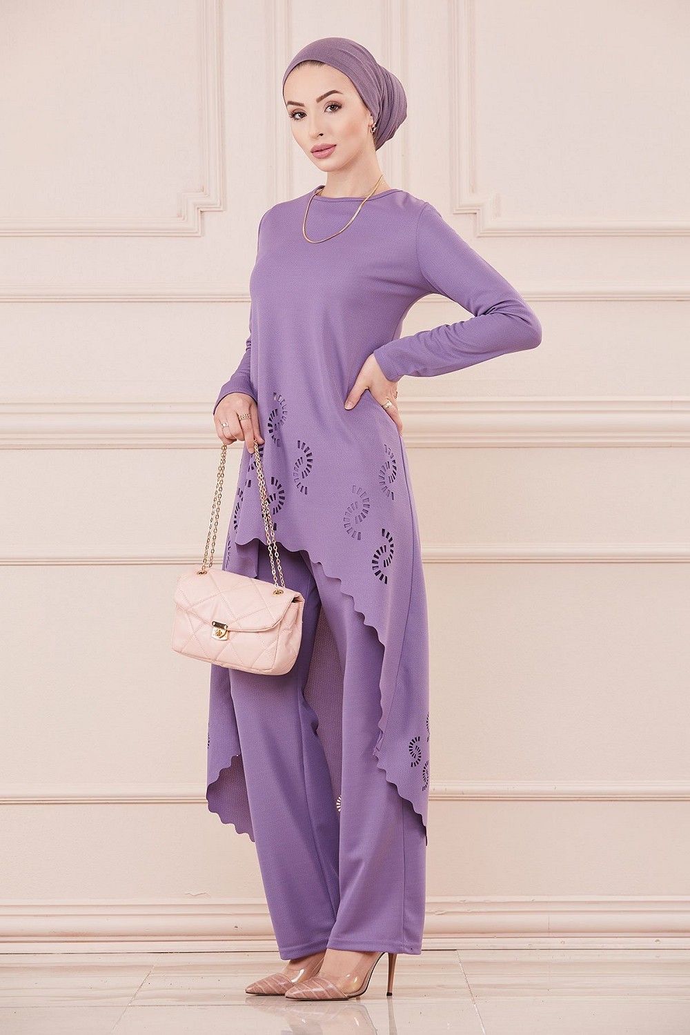 Ensemble decoupe au laser : Tunique et pantalon assorti pour femme (Vetement hijab habille) - Couleur lilas