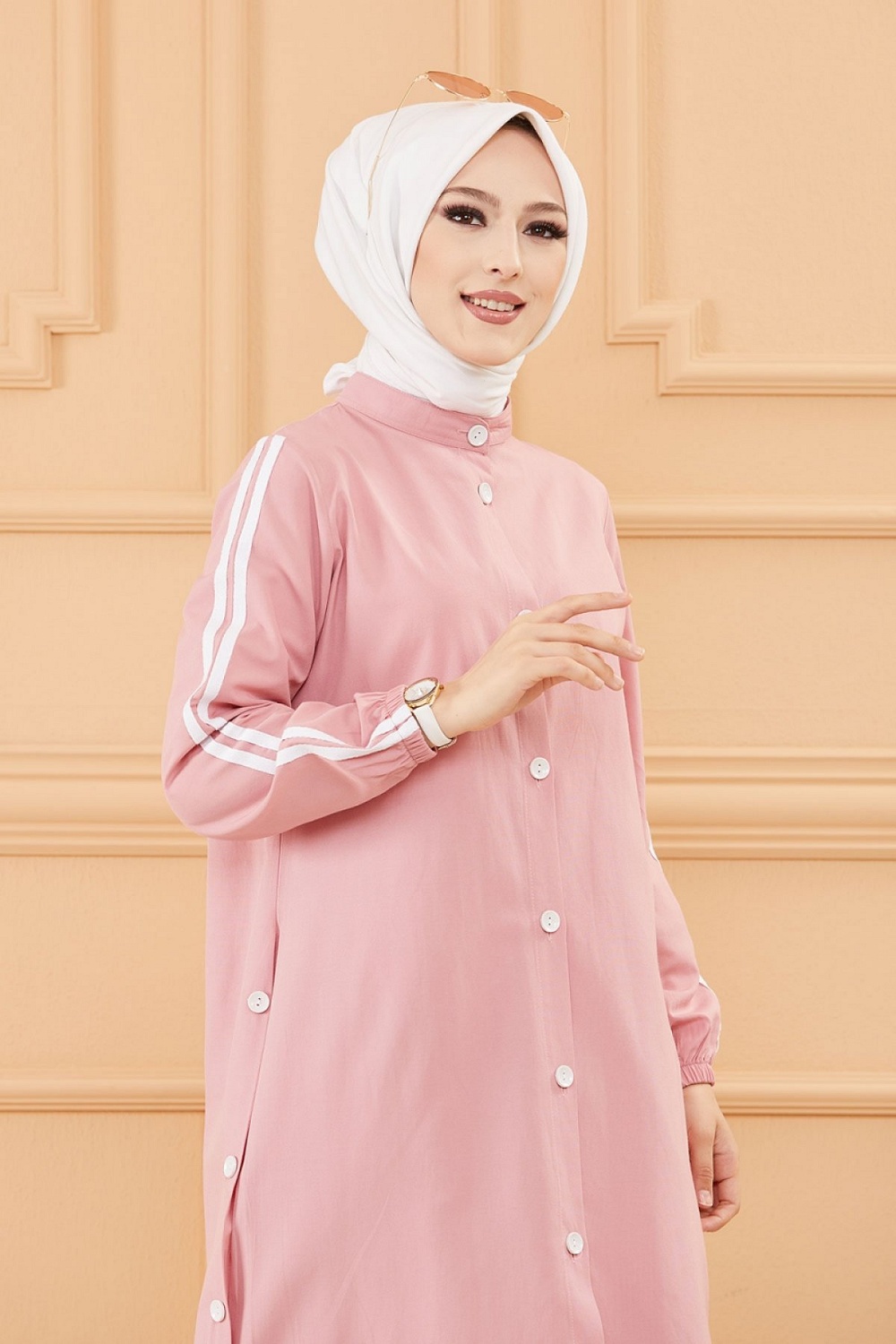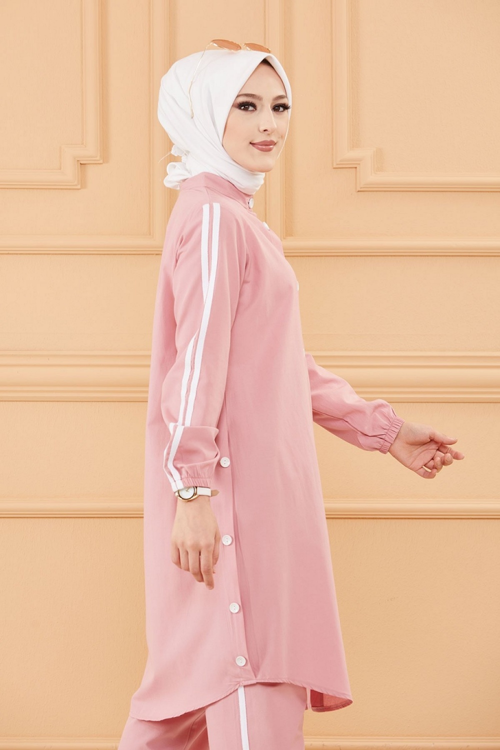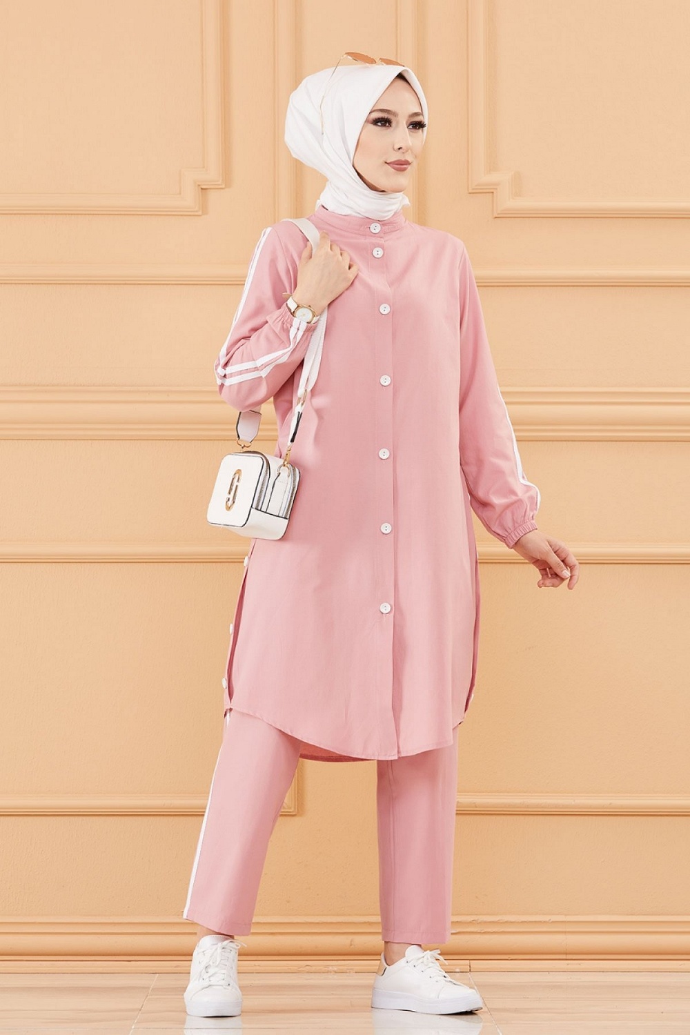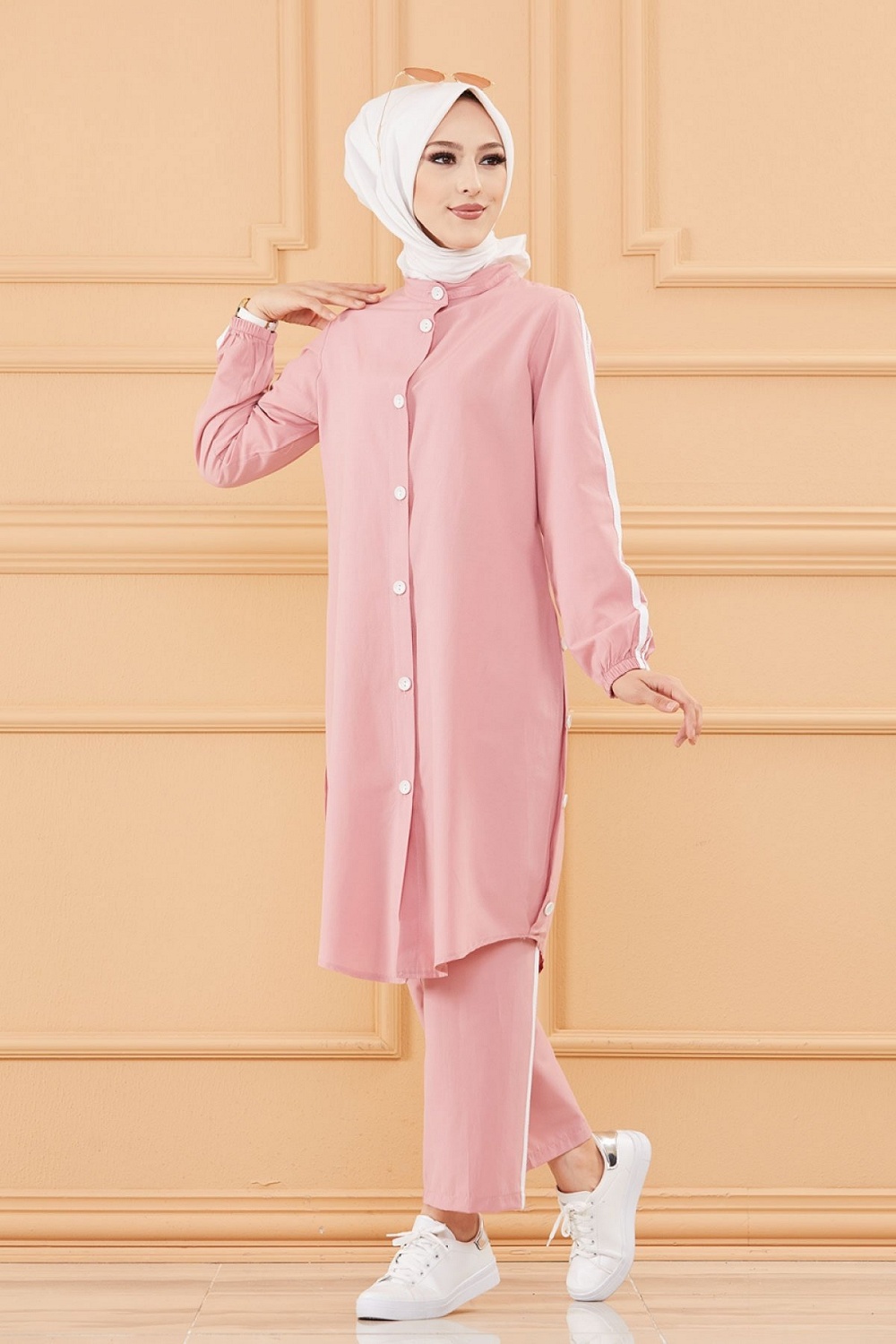 Ensemble casual : Tunique boutonnée -chemise longue- et son pantalon pour femme (Vêtement Hijab moderne) - Couleur rose poudré Vetement & Accessoire