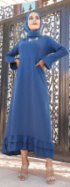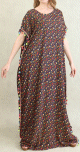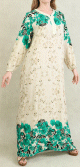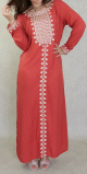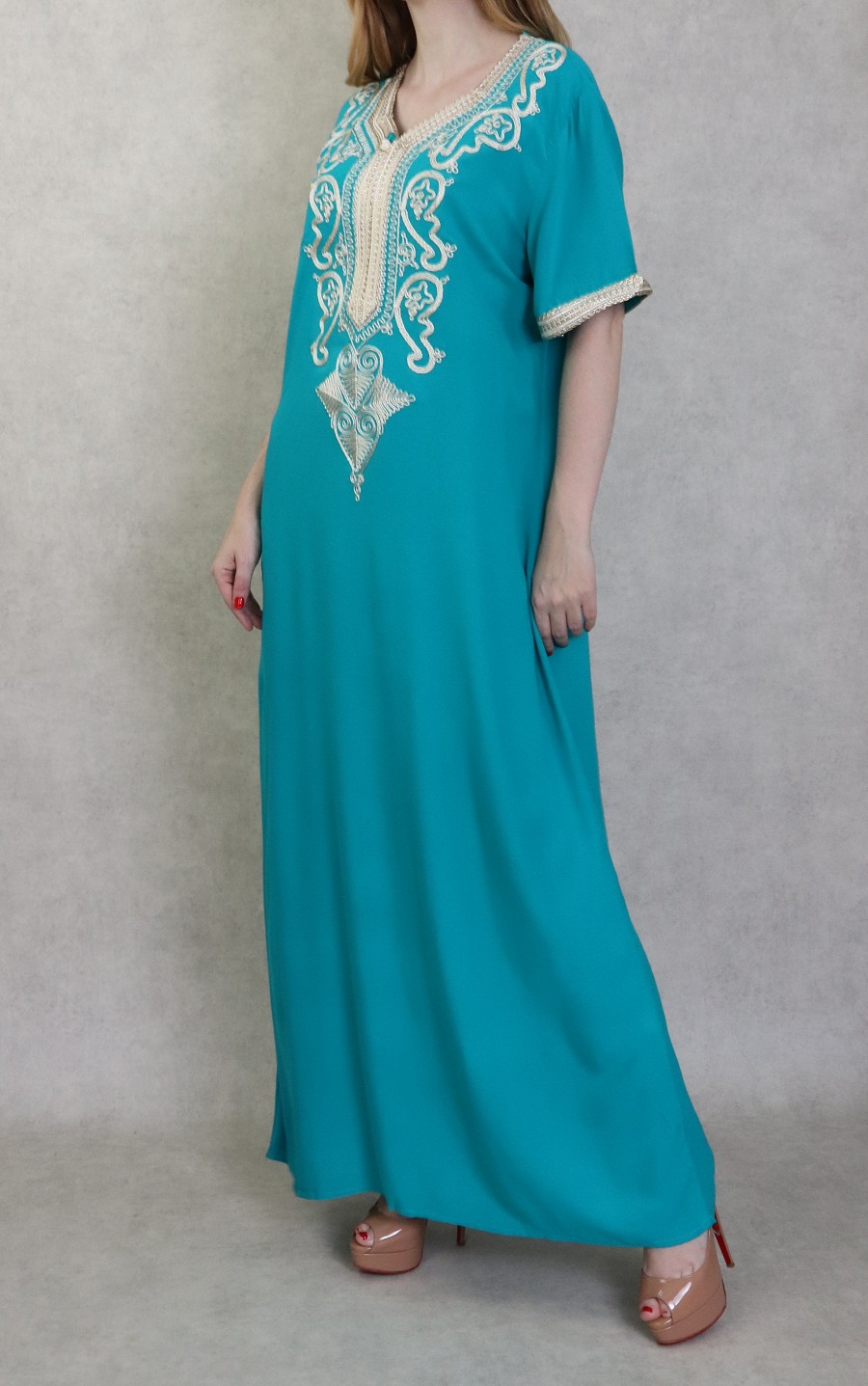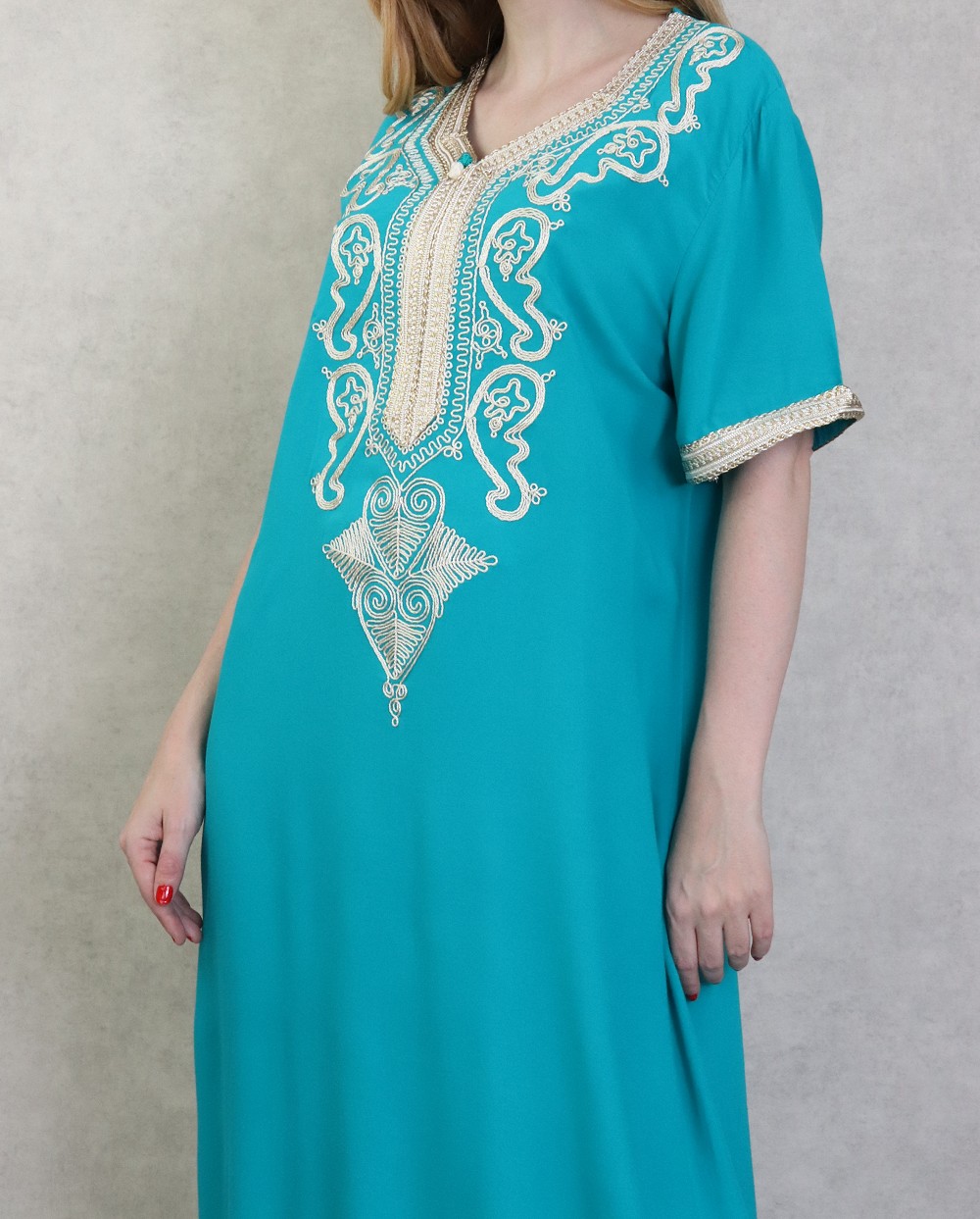 Robe longue, col en V, manches courtes, décorées de broderies sur tout le buste. Coupe droite, tissu doux et fluide