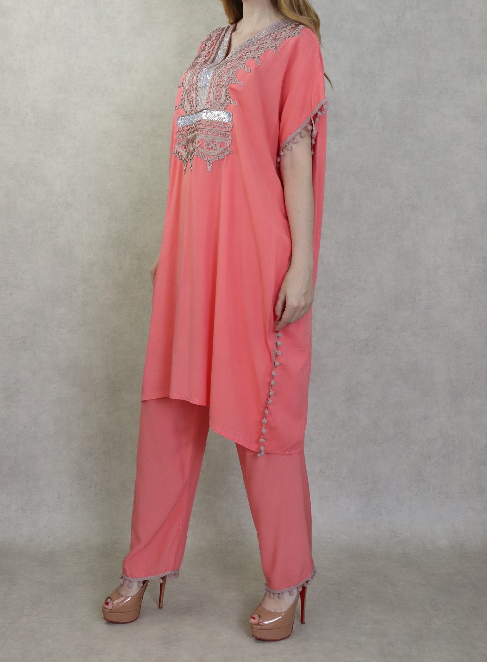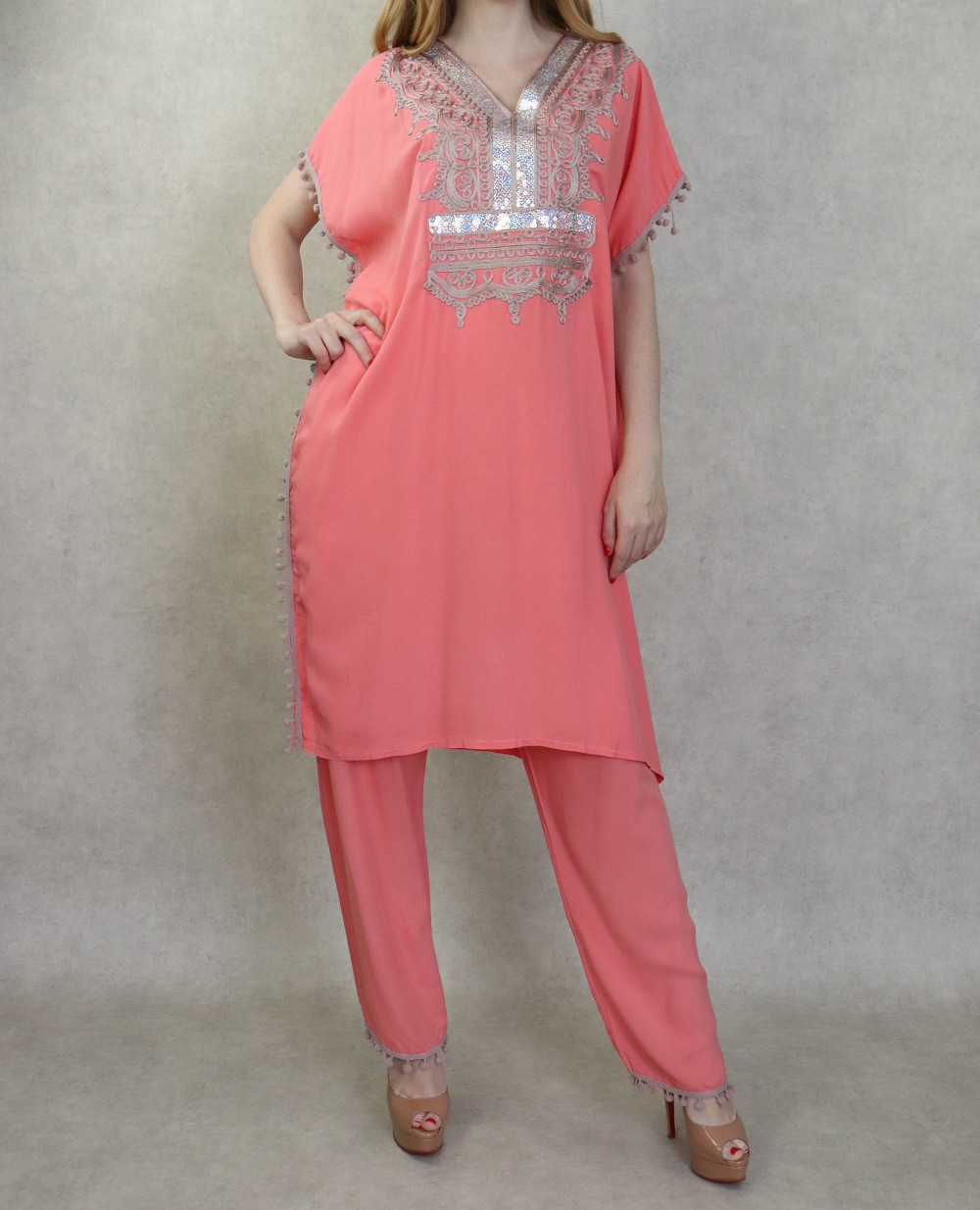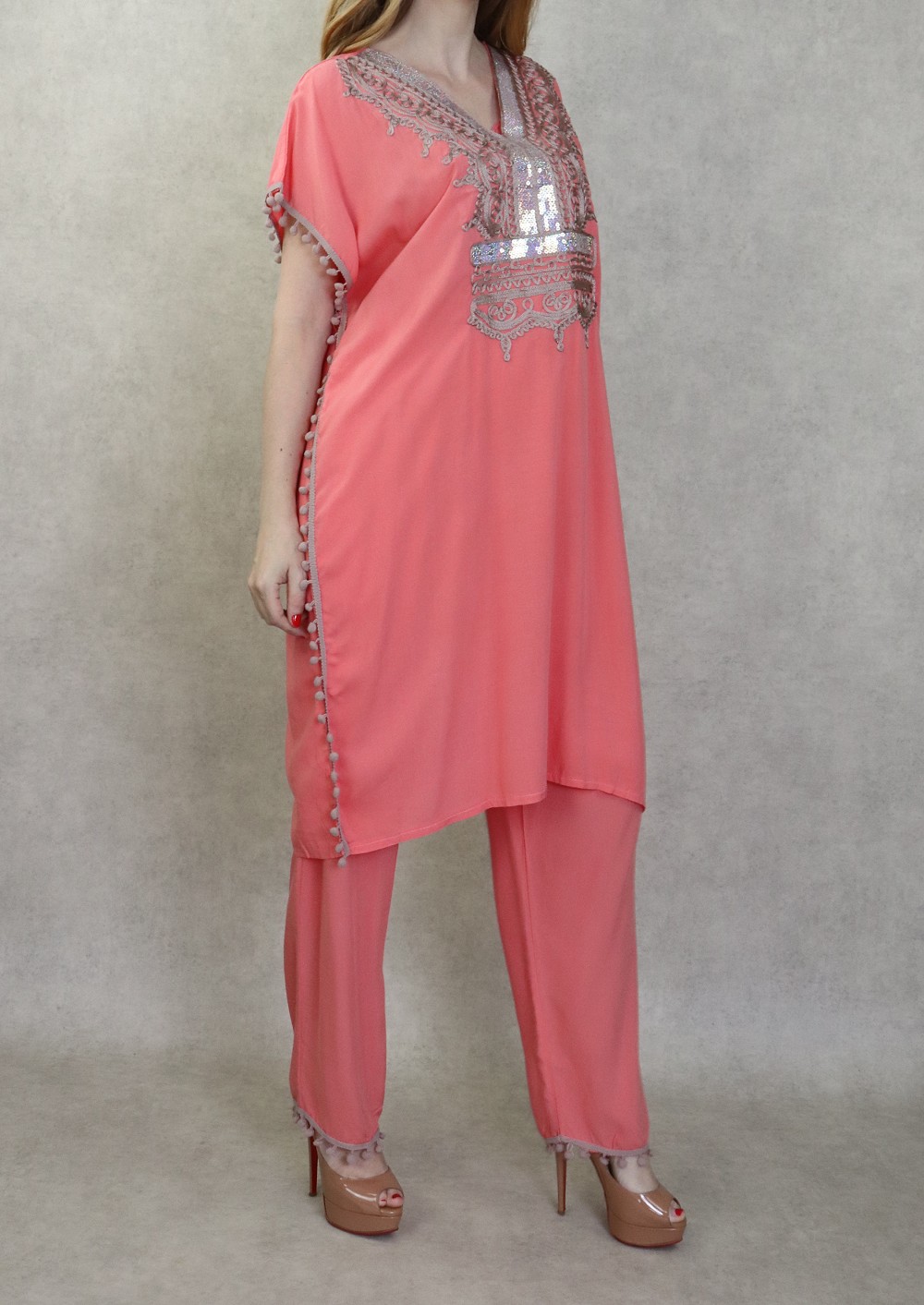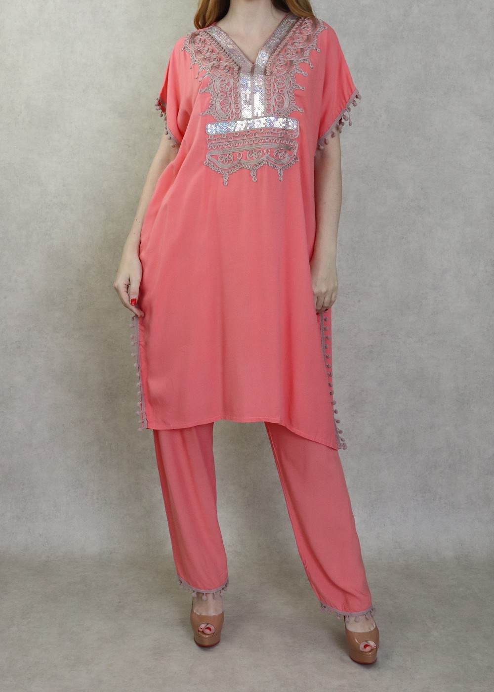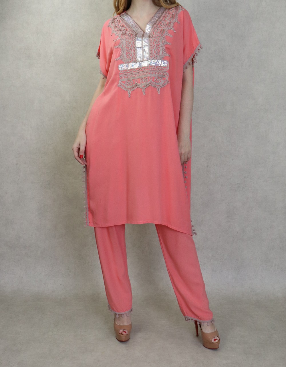 Ensemble style Jabador femme composé d’une tunique avec broderie et des petits pompons assortis sur les manches ainsi que sur la fin de pantalon, Col en V, il donne un effet très habillé et peut se porter aussi bien ample que cintré grâce à 2 liens intérieurs de serrage, et son pantalon assorti avec ceinture élastique, deux poches latérales, coupe droite.