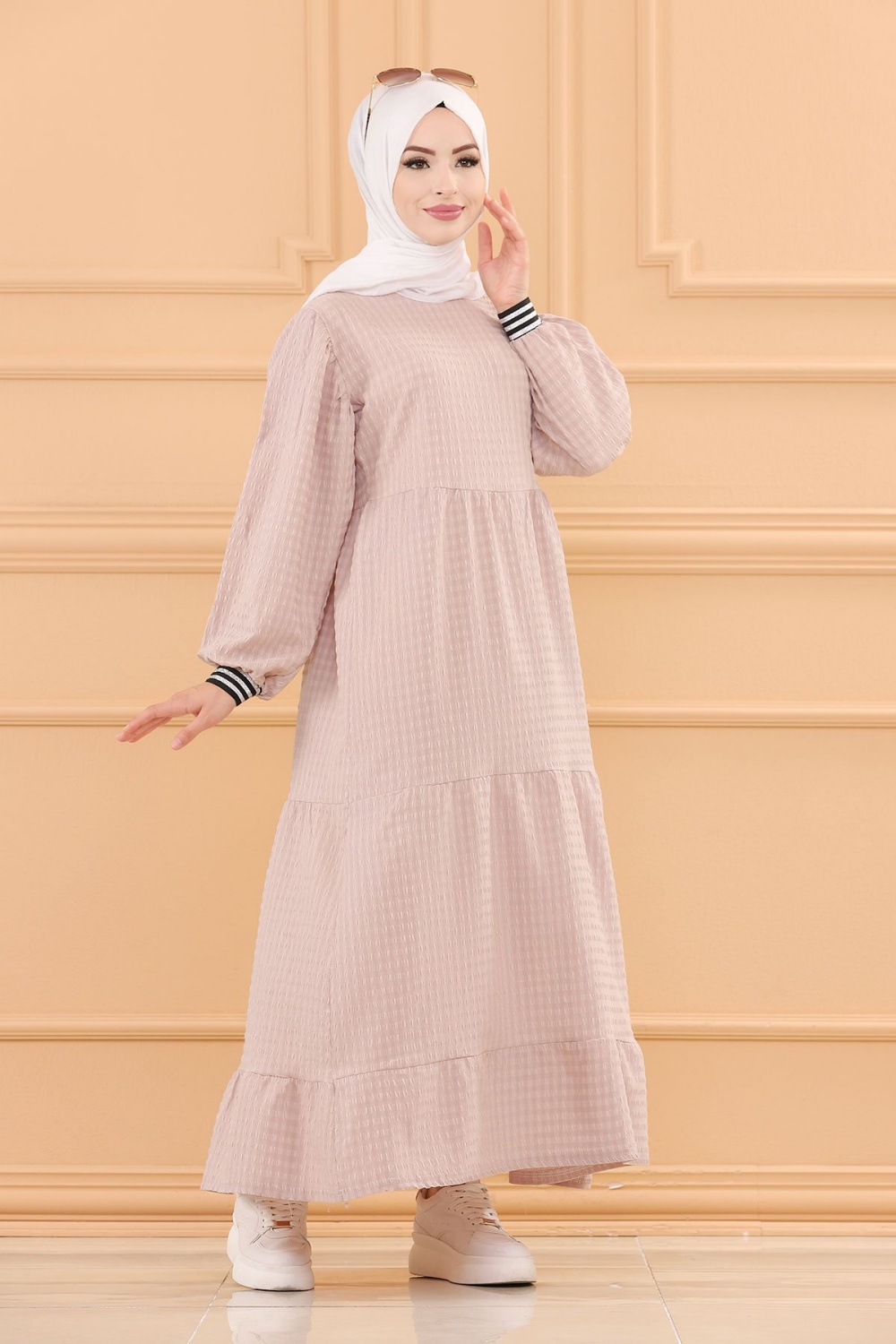 Robe longue habillée avec ceinture pour femme (Vêtement chic pour hijab) - Couleur beige clair - REF. 36617 (32.00 €)