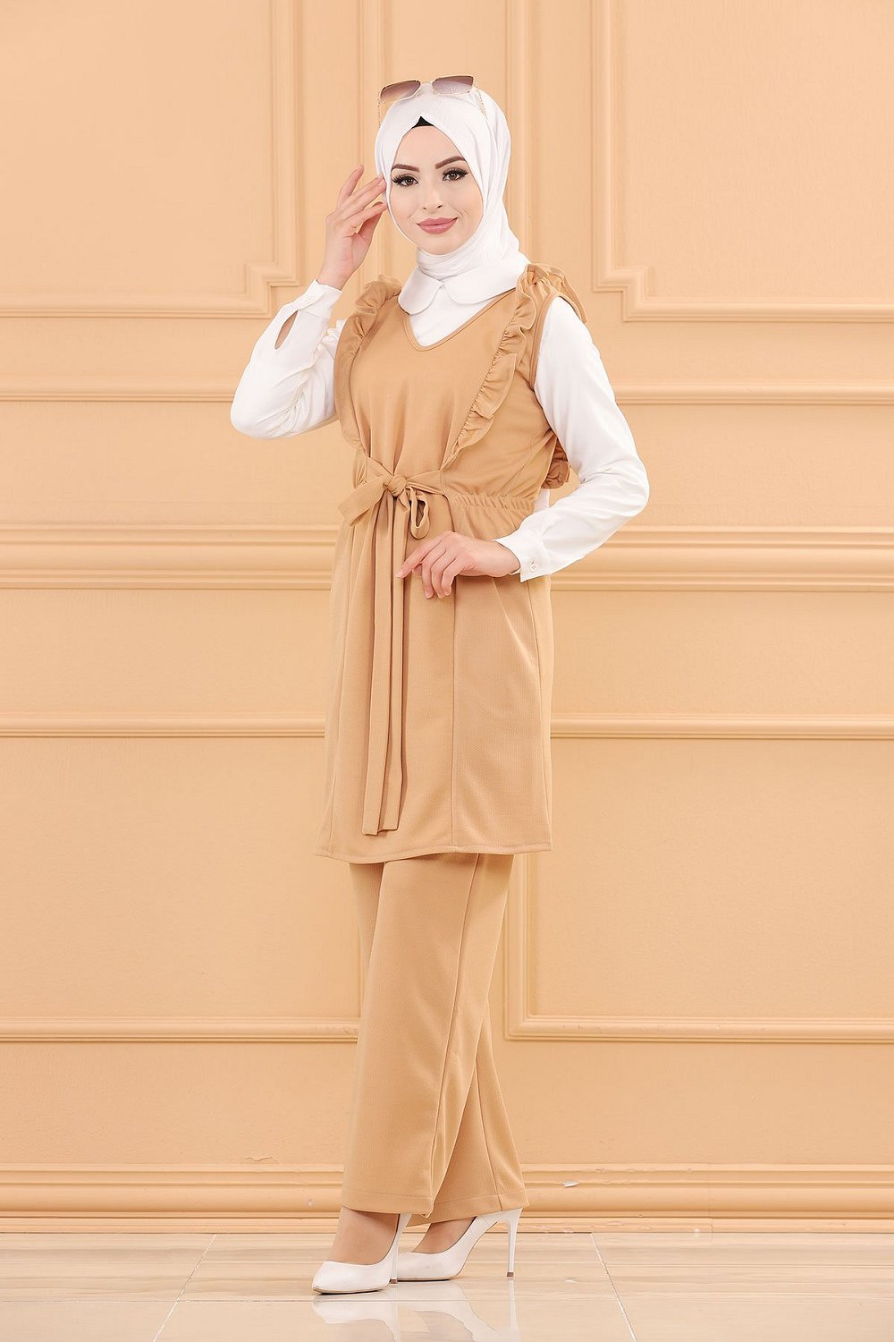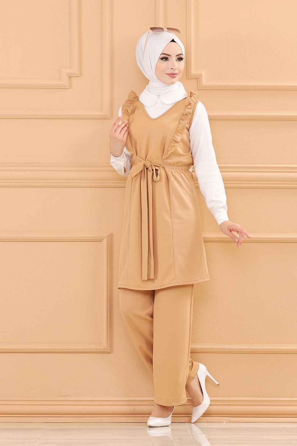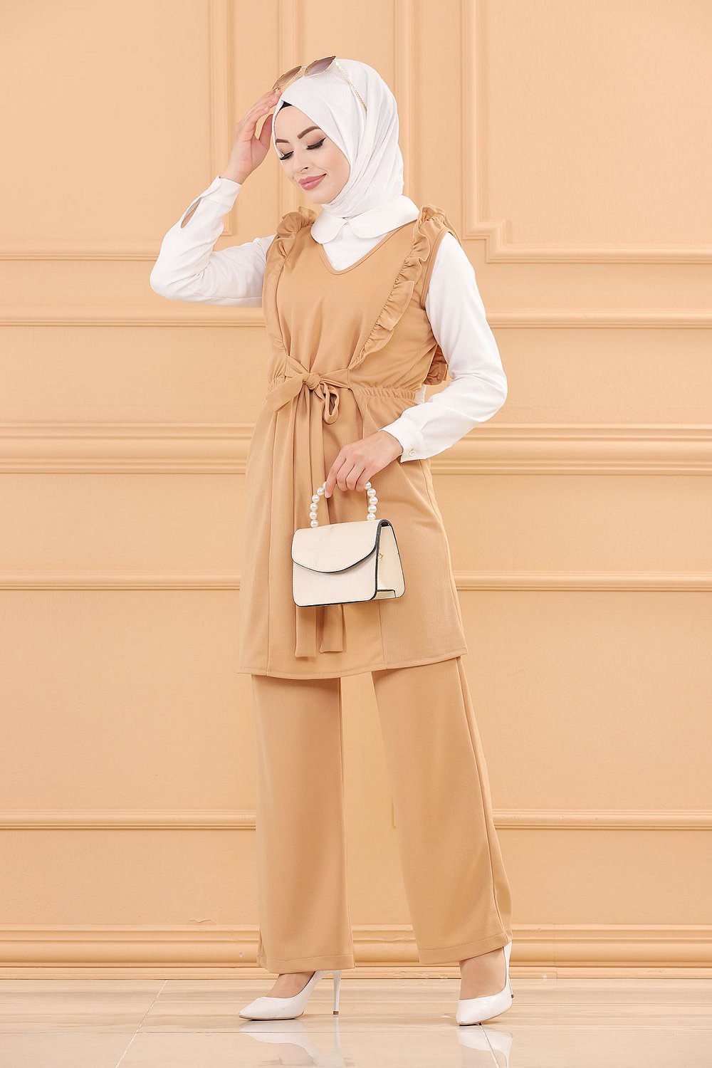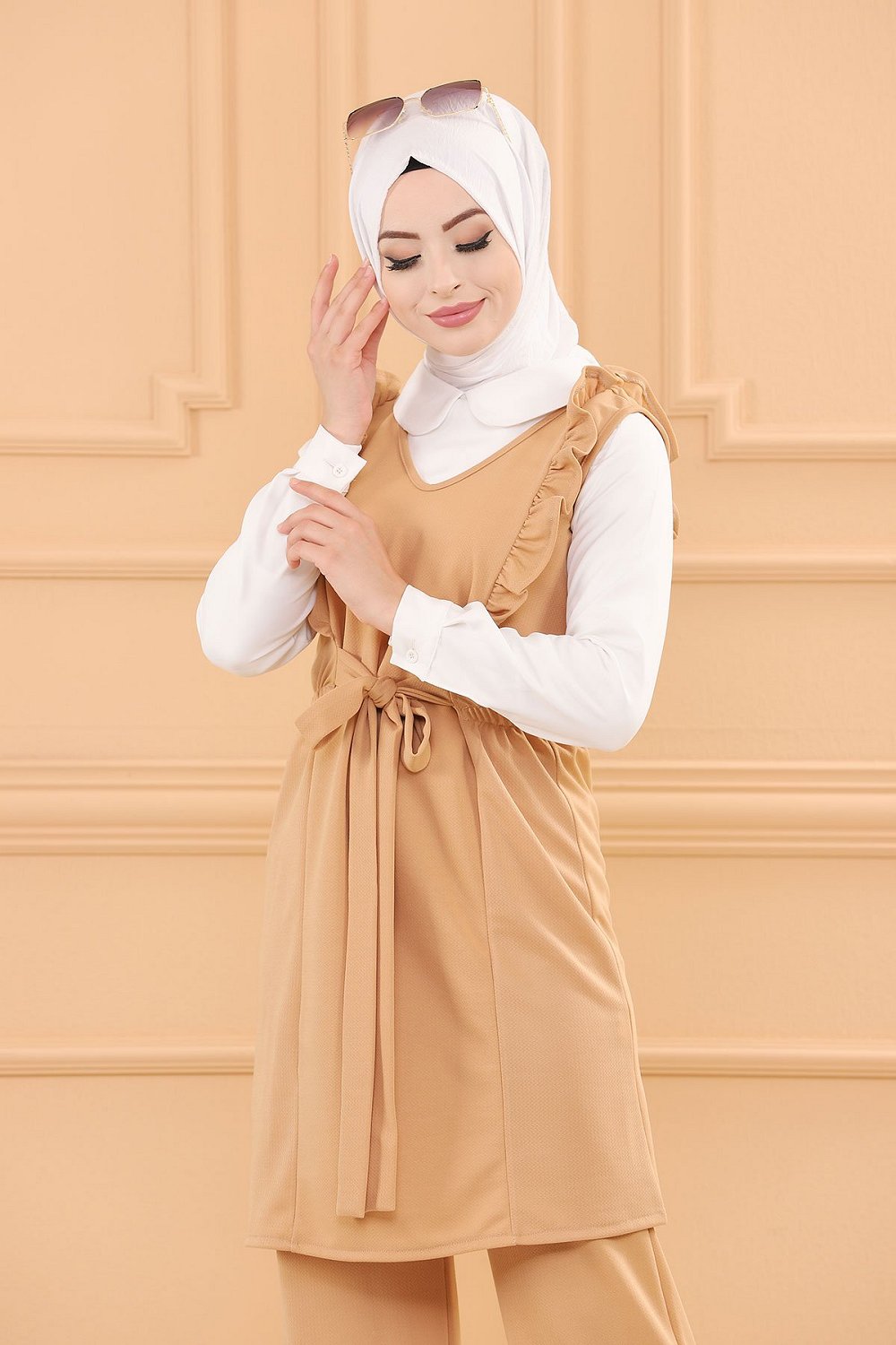Ensemble habillé deux pièces tunique et pantalon (Tenue chic pour Hijab) - Couleur beige Vetement & Accessoire