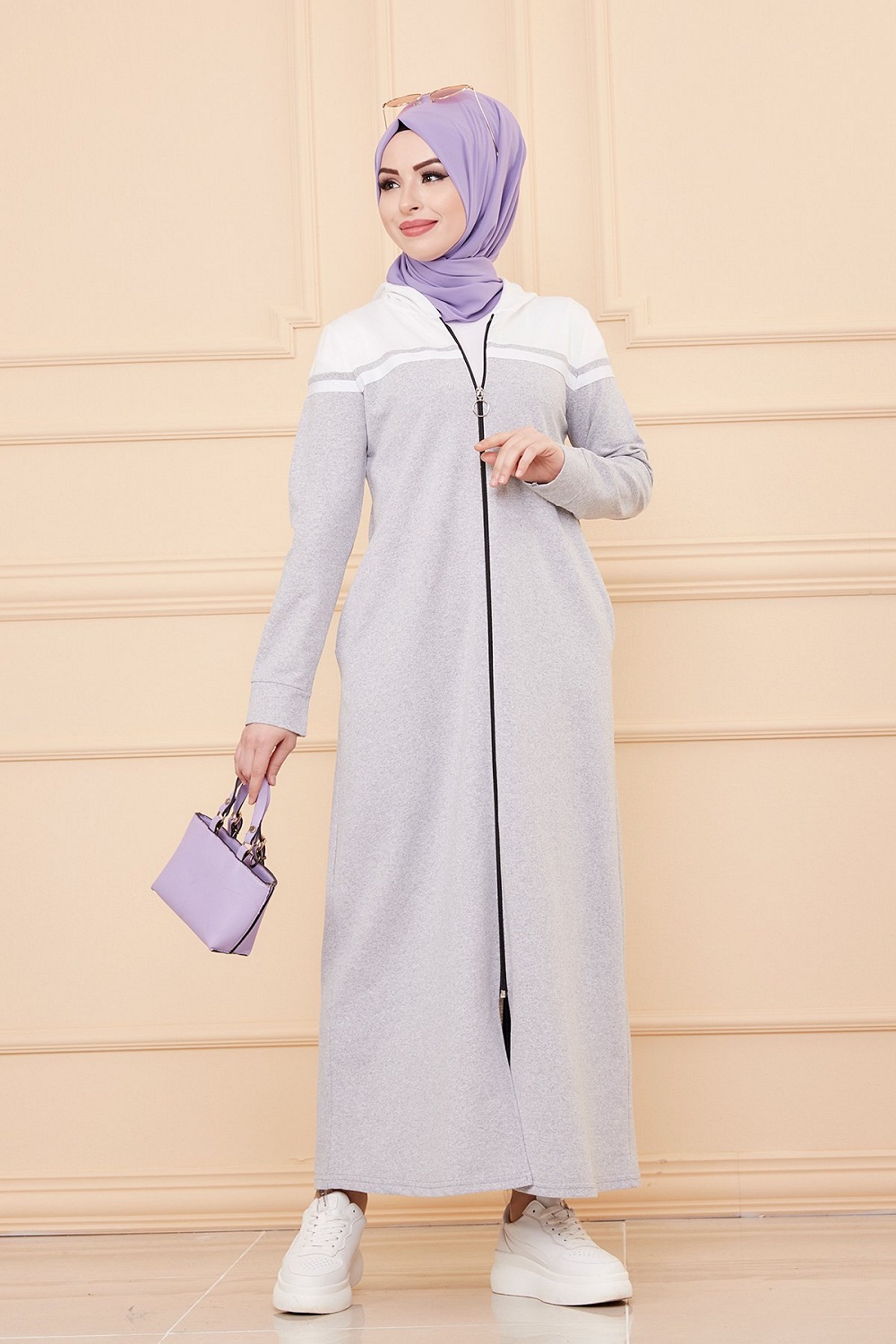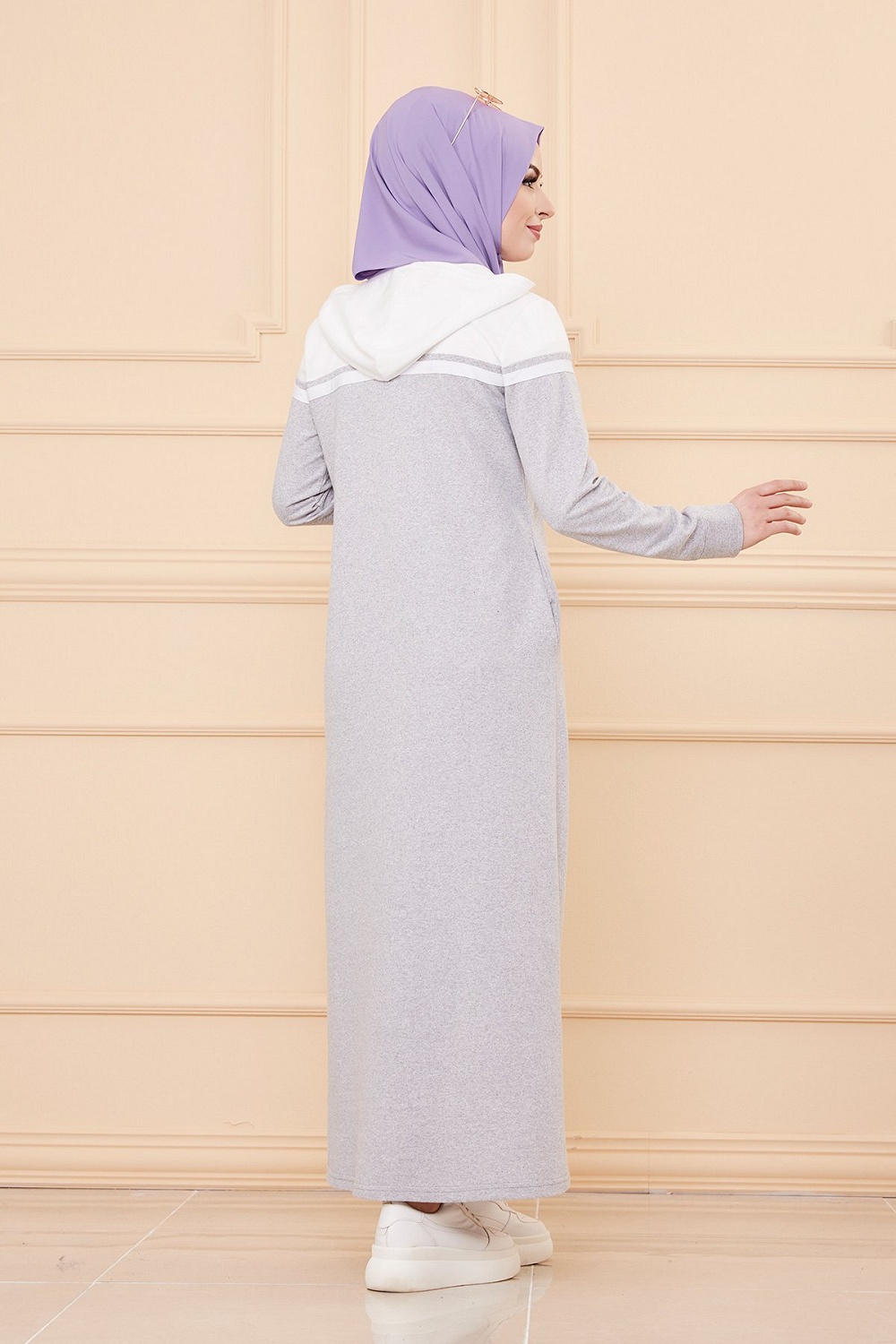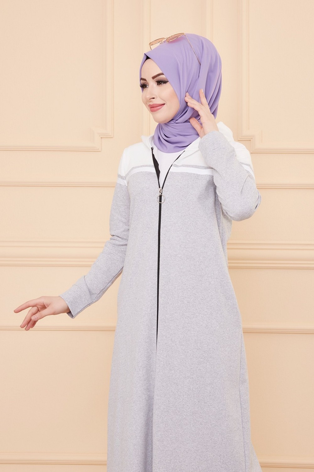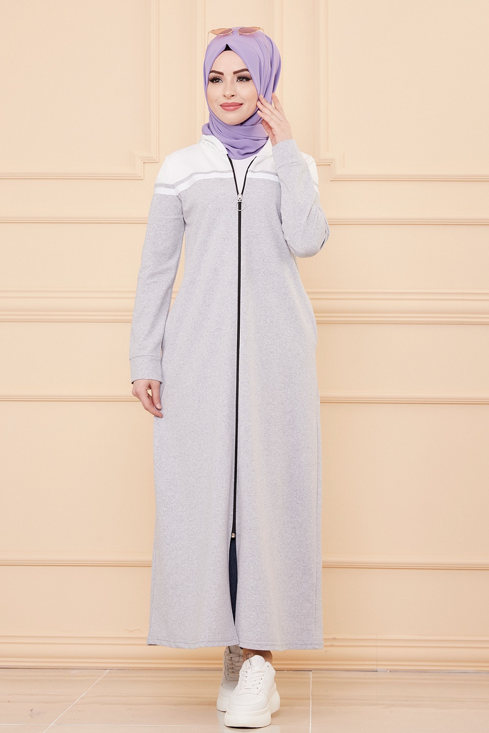 Robe longue à capuche fermeture zip (Boutique Mode Musulmane pour femmes voilées) - Couleur gris écru Vetement & Accessoire