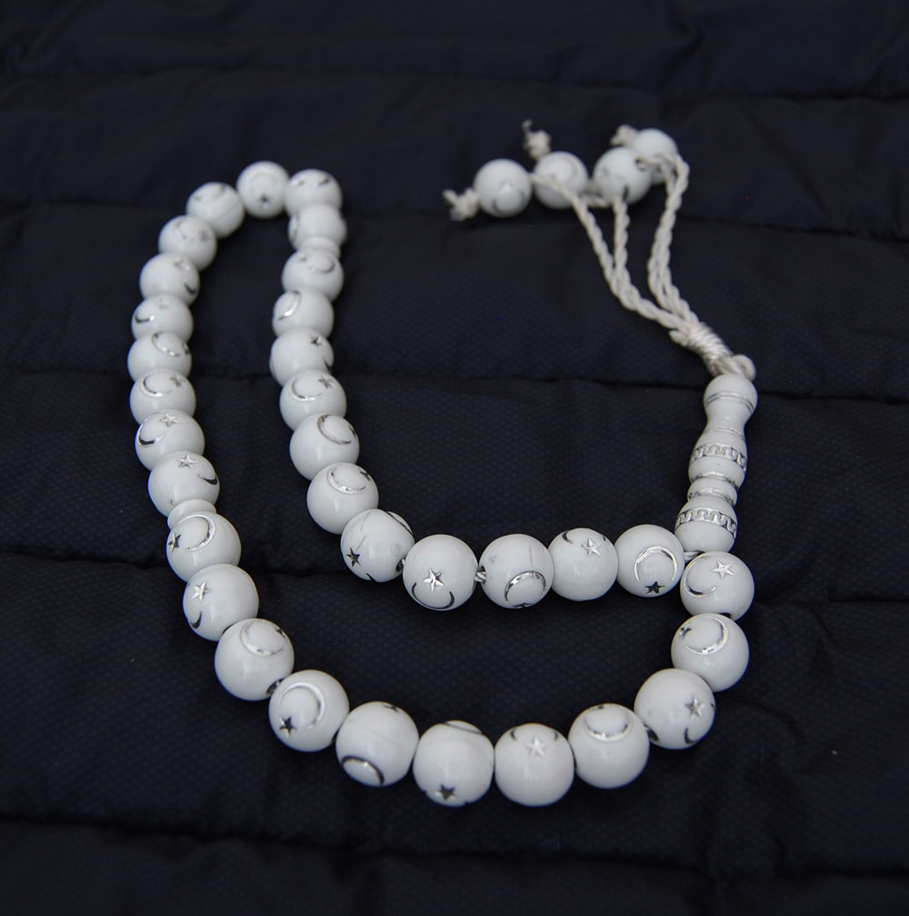 Chapelet "Sebha" blanc ultra-résistant à 33 grains avec décorations argentées et séparation tous les 11 grains.
