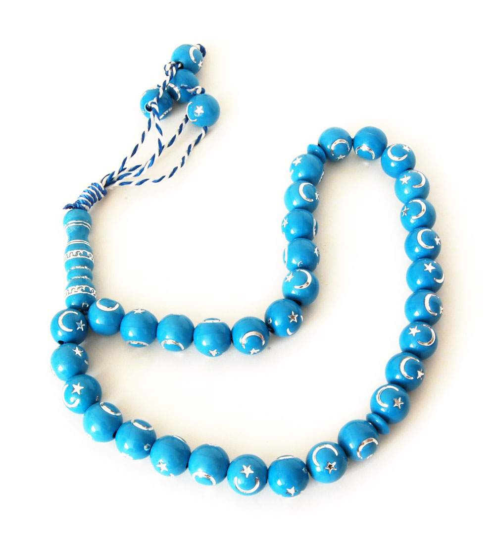 Joli chapelet de luxe de couleur bleu avec motifs argentés variés. Les motifs peuvent varier quelque peut en fonction du stock.