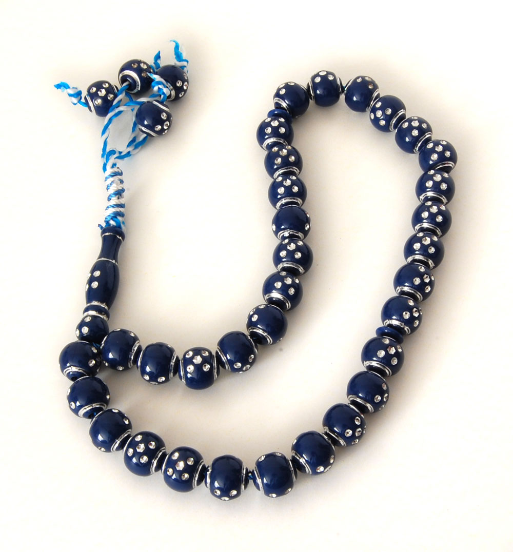 Joli chapelet de luxe de couleur bleu foncé avec motifs argentés variés. Les motifs peuvent varier quelque peut en fonction du stock.