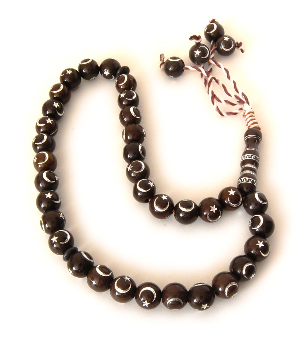 Chapelet "Sebha" marron à 33 gros grains avec motifs argentés - croissant lunaire & étoile