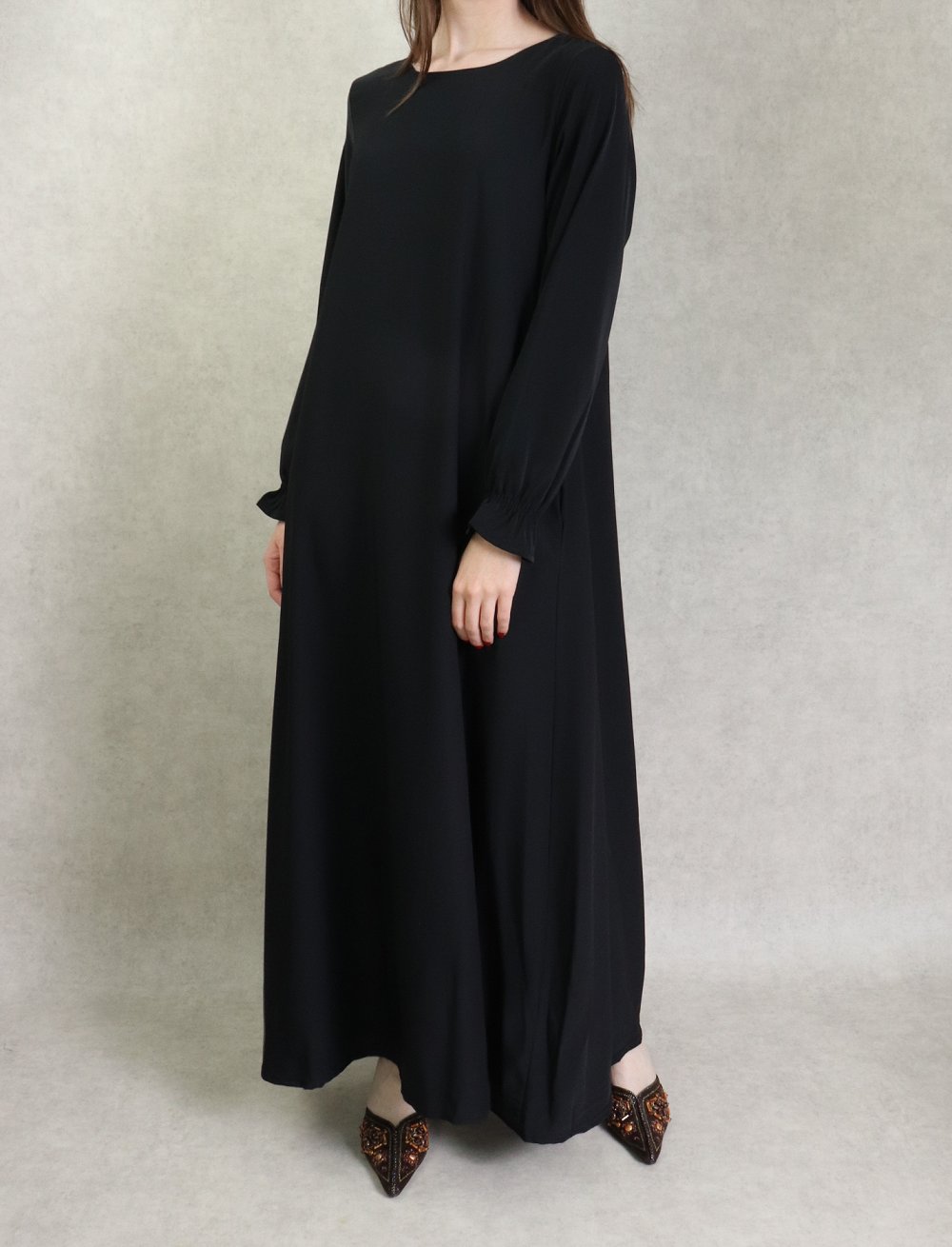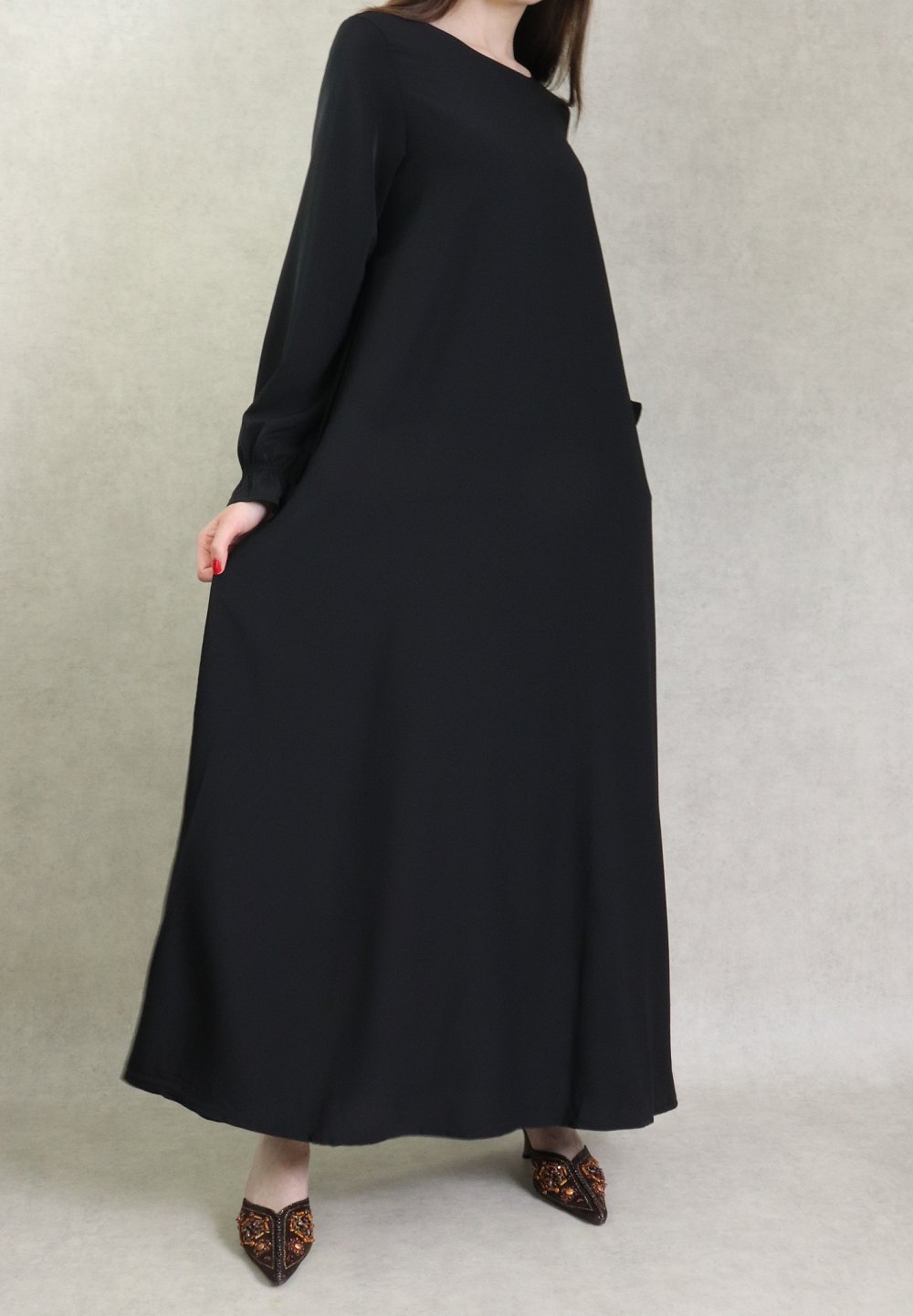 Jolie robe Abaya longue, col rond, coupe évasée, deux poches latérales, tissu nidah noir opaque. Beau tombé et très agréable à porter. Intemporel, il se porte en toutes saisons, en toutes occasions.