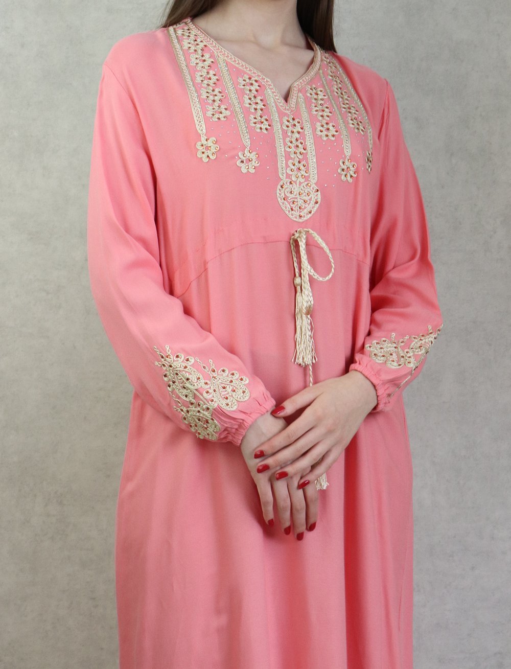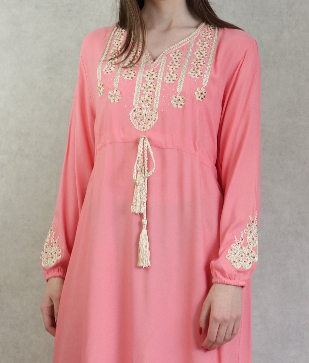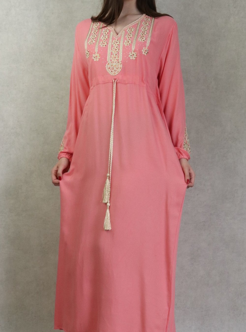 Robe longue, élégante avec strass et broderie, tissu épais (non transparent), col semi ouvert, taille à ajuster avec un jolie lien de serrage à pompons, manches longues brodées finition élastiques aux poignets.