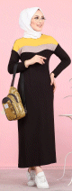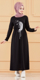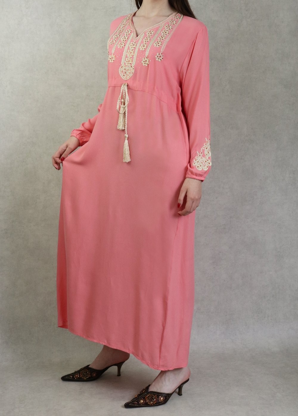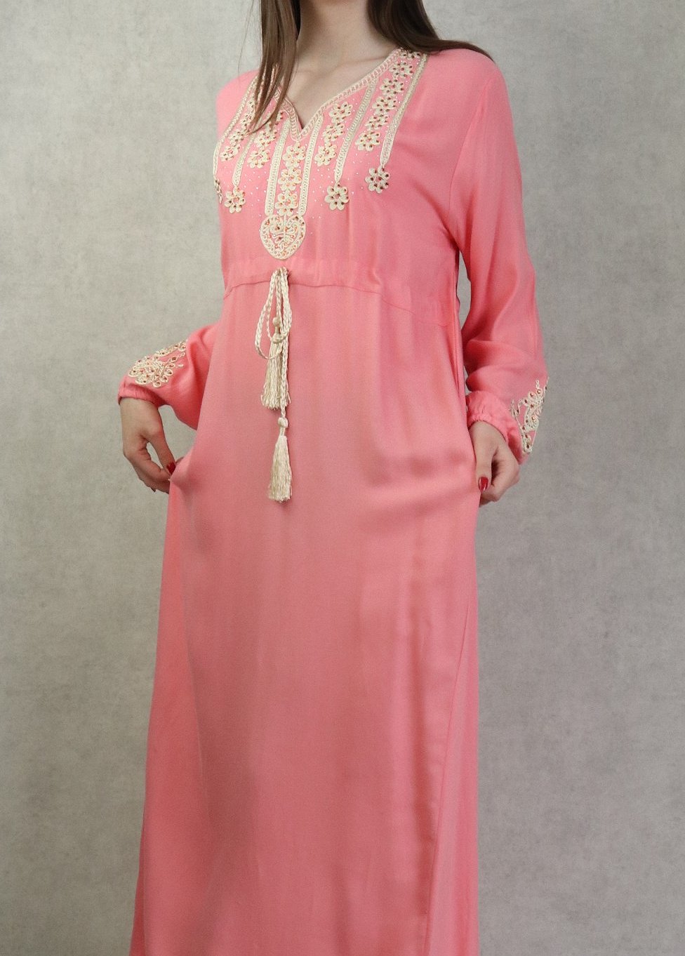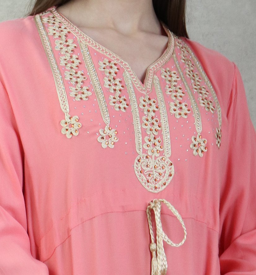 Robe longue, élégante avec strass et broderie, tissu épais (non transparent), col semi ouvert, taille à ajuster avec un jolie lien de serrage à pompons, manches longues brodées finition élastiques aux poignets.