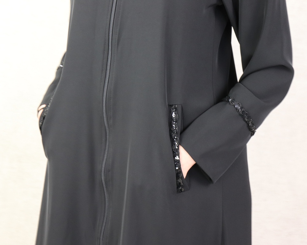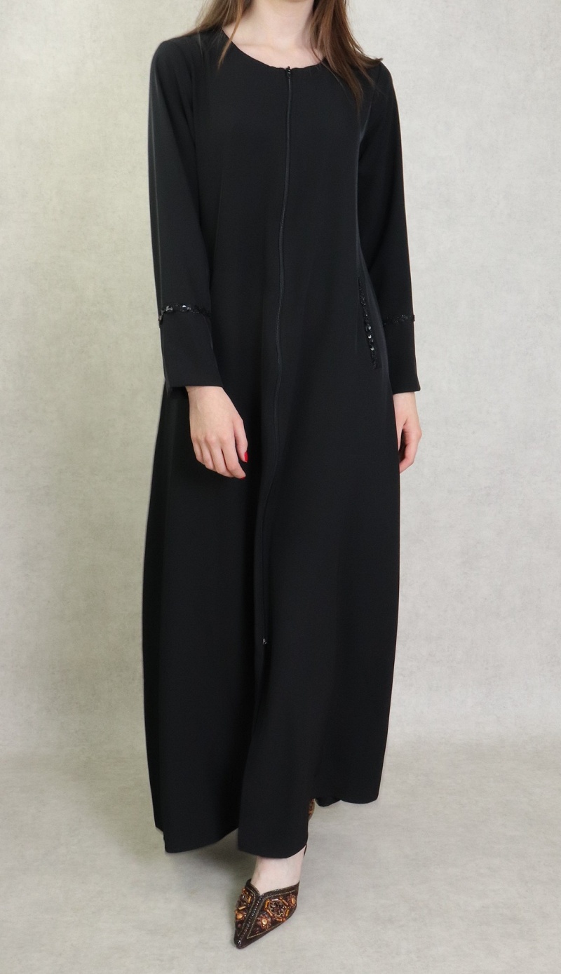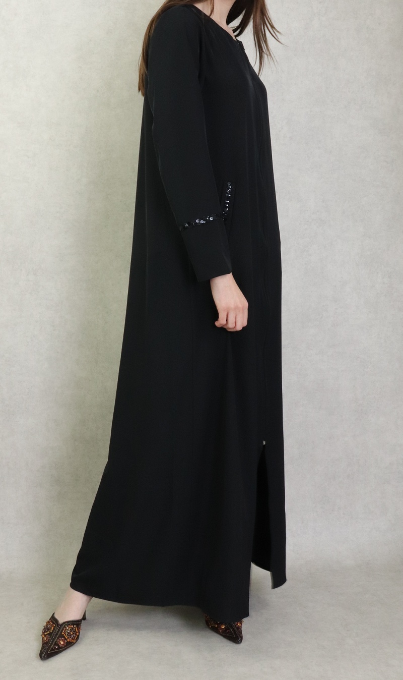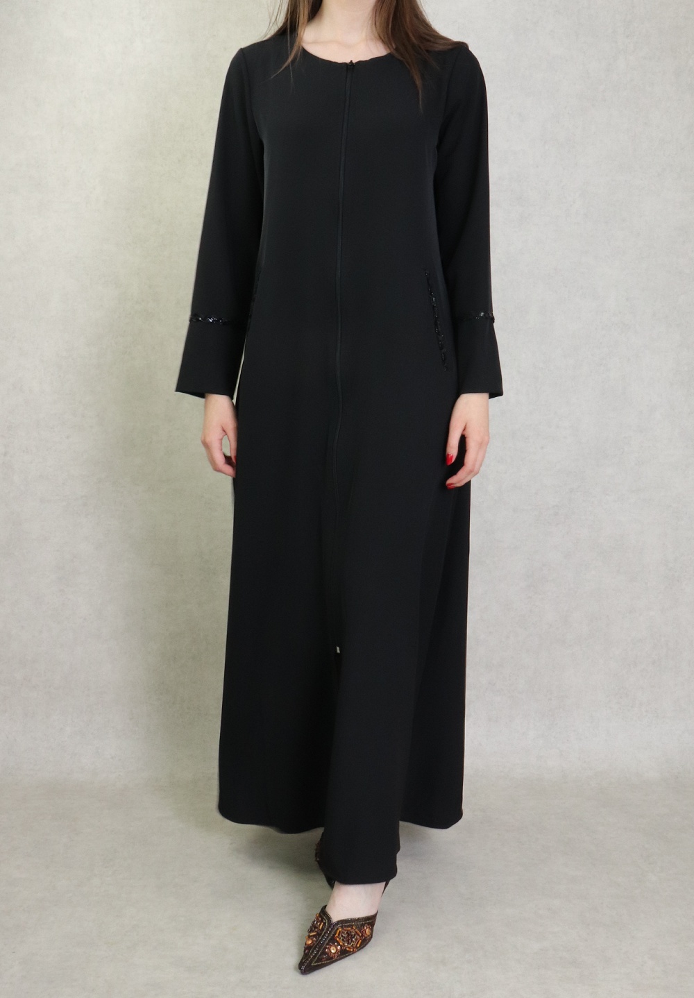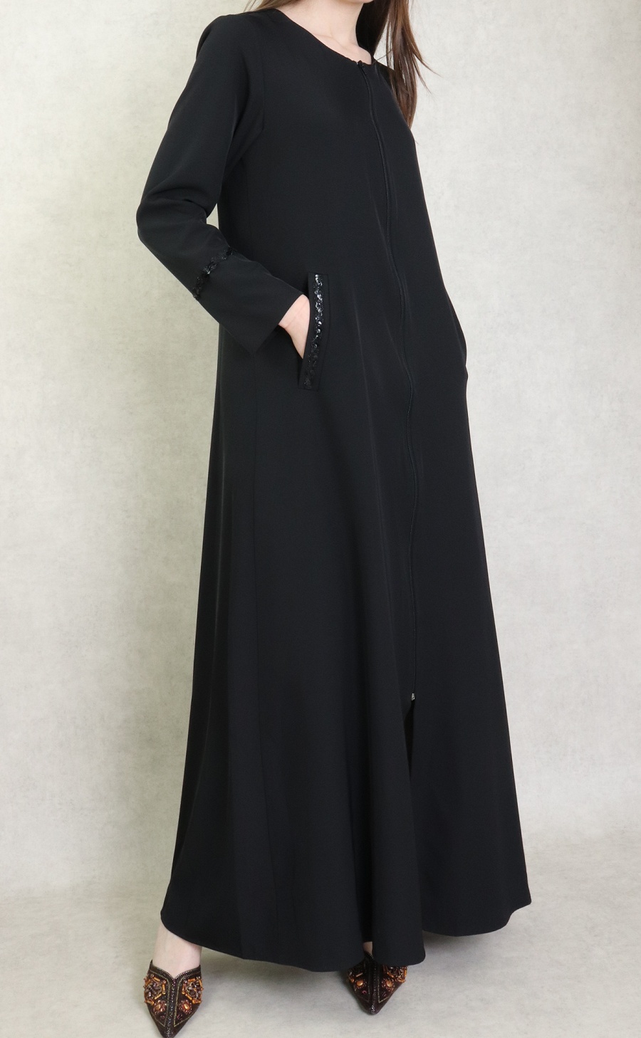 Belle Robe Abaya ouverte sur tout le devant avec fermeture zip. Sobre et évasée avec col rond. Deux poches décorée d'une fine broderie noir et ainsi que sur les manches. Beau tombé et très agréable à porter. Légèrement ouverte en bas... S'enfile rapidement sur d'autres vêtements ou un chemisier.
