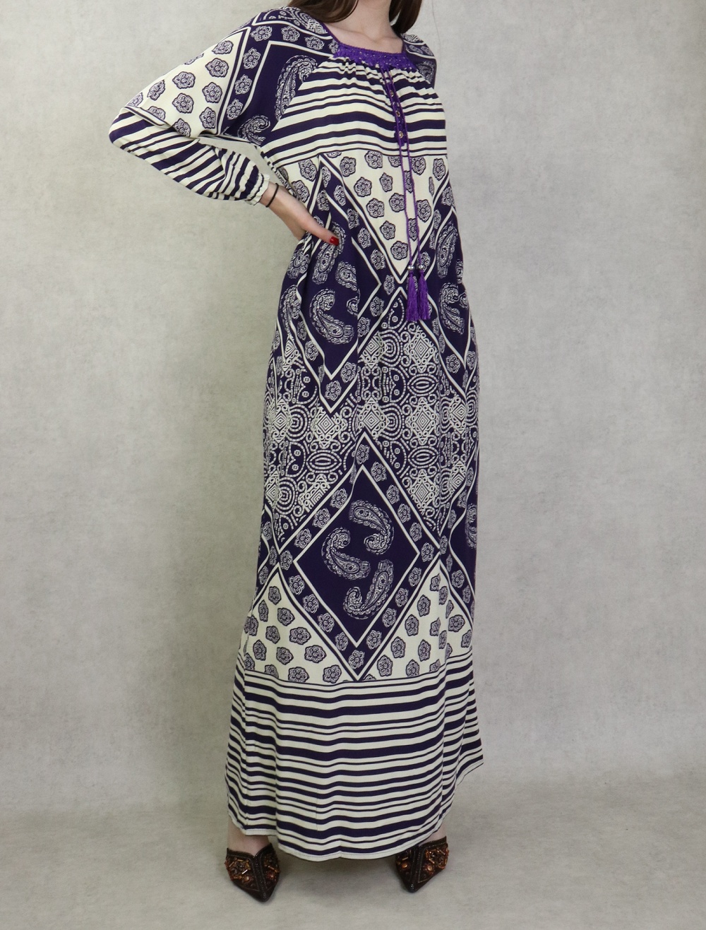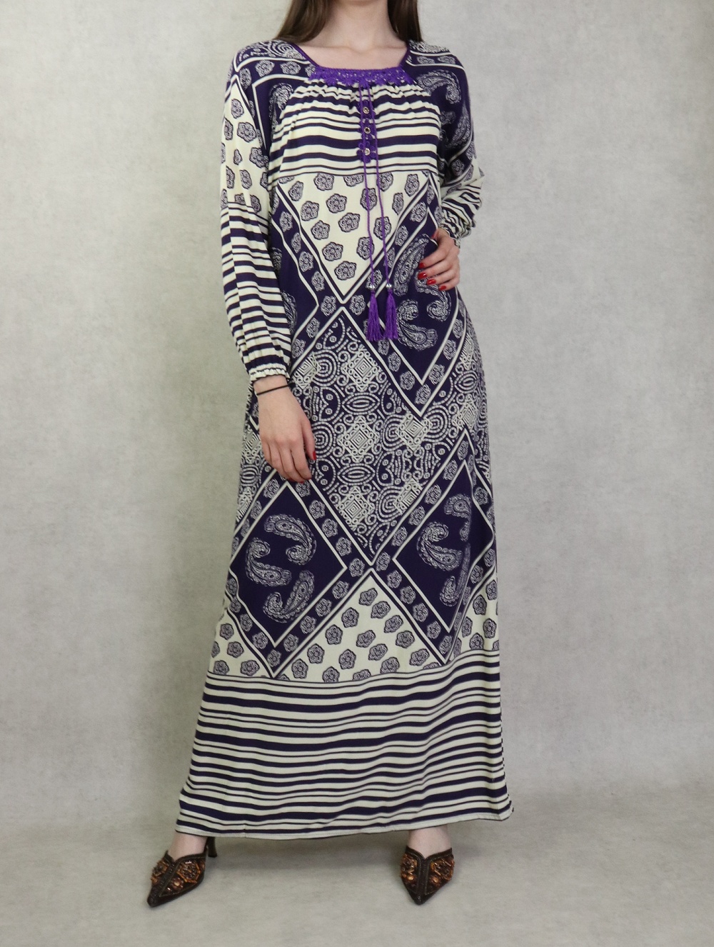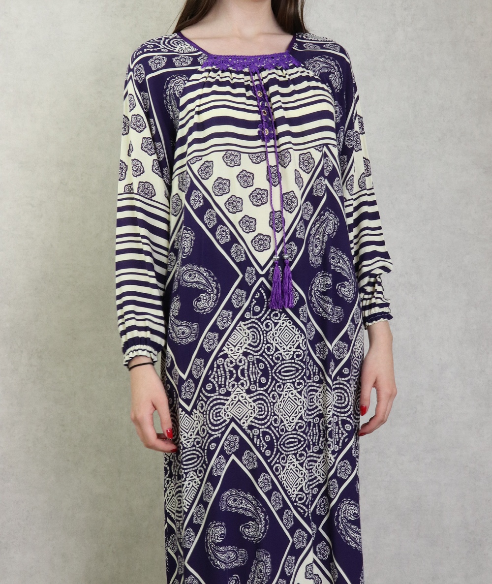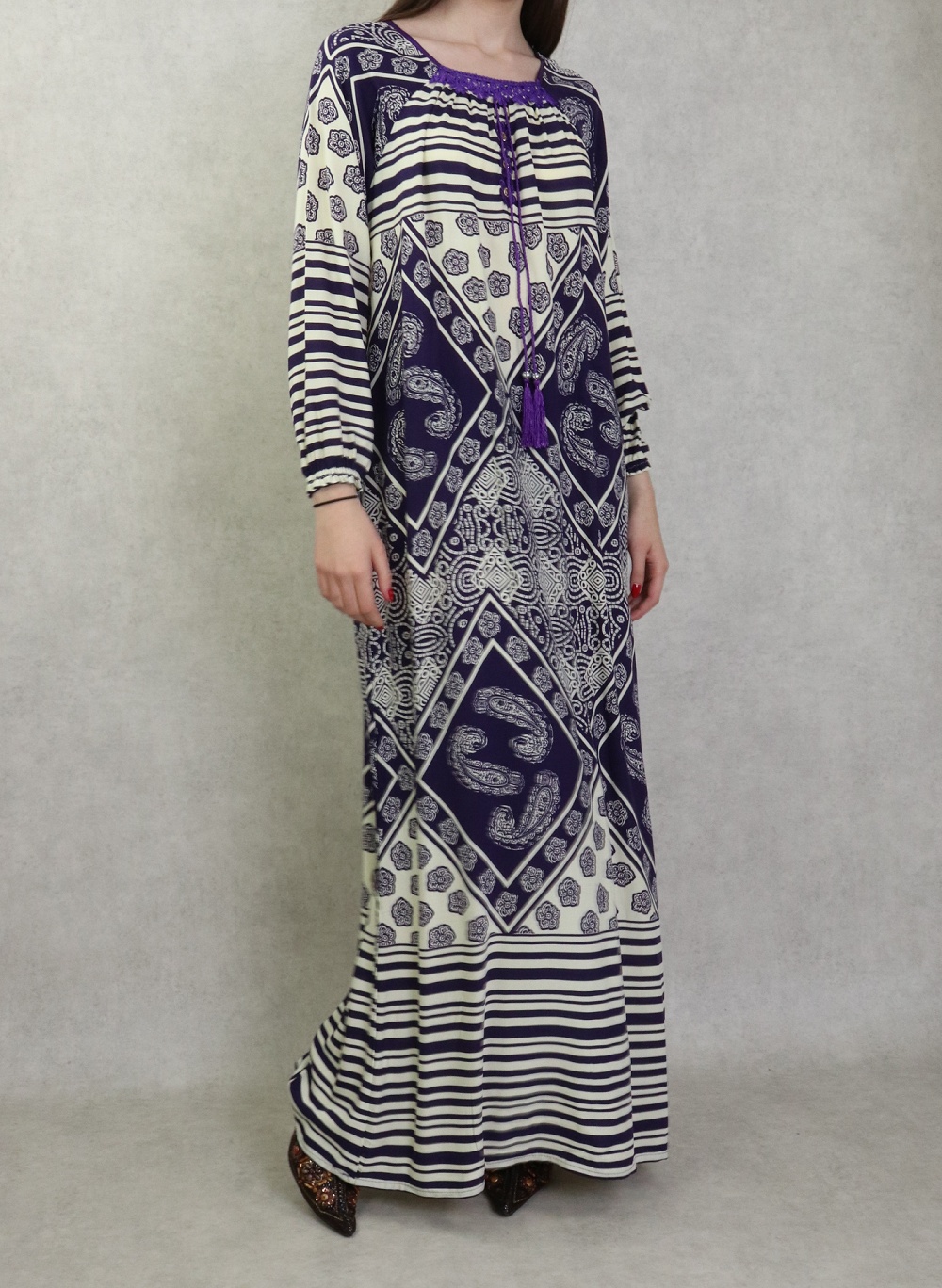 Robe d’intérieur avec motifs sur un fond crème. Col dégagé avec broderie et pompon, manches longues finition élastiques aux poignets, elle est douce et agréable à porter.