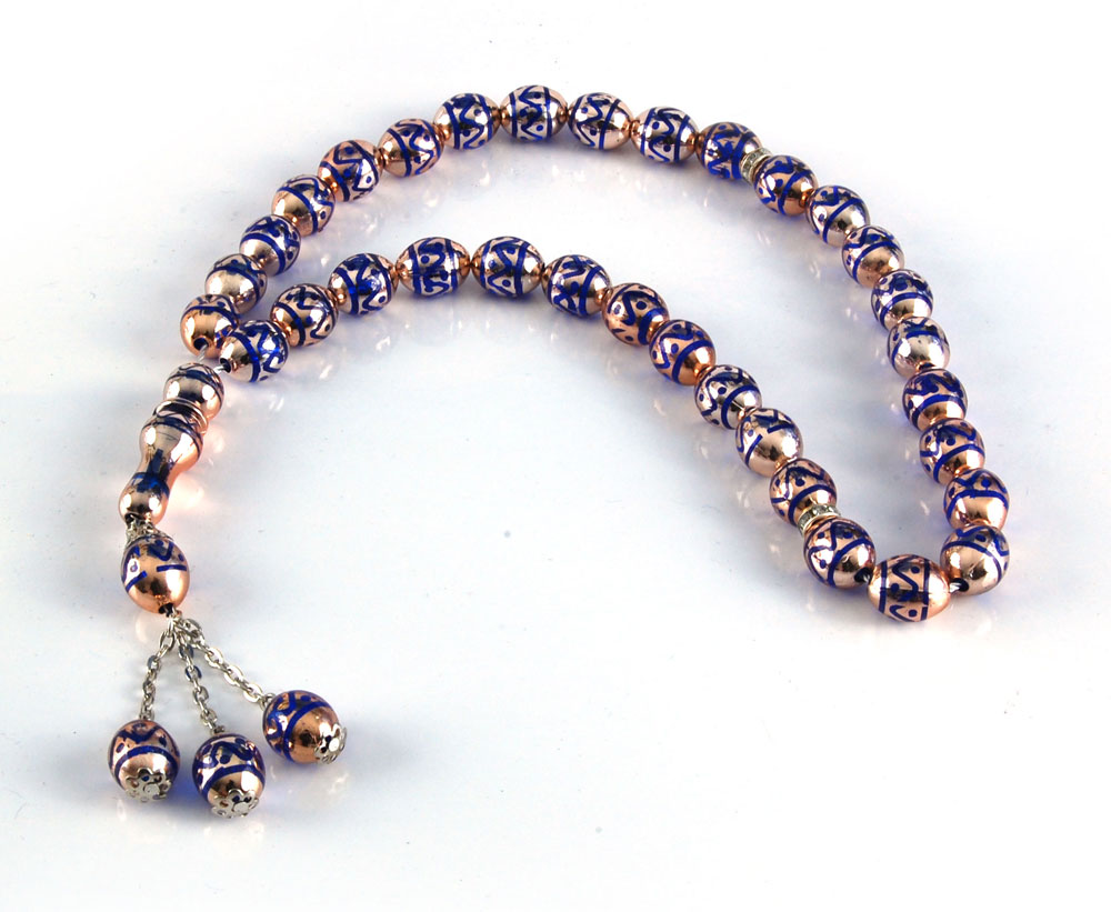 Chapelet (sebha) à 33 perles bleues dorées. Avec séparateur toutes les 11 perles.