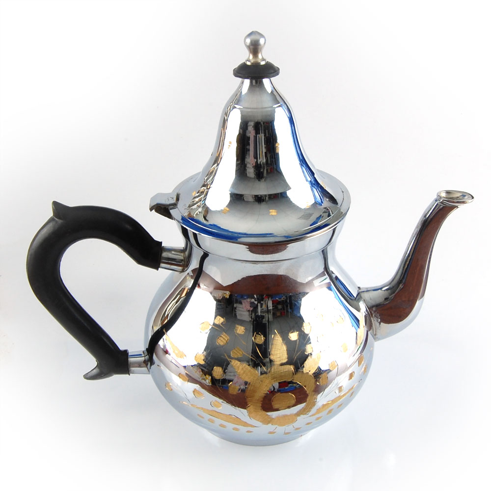 Jolie théière chromée de grande taille avec des motifs floraux gravés. La capacité de la théière est d'environ 16 tasses de thé.