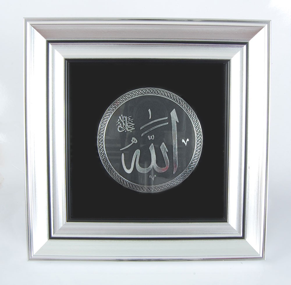 Tableau en bois argenté avec inscription ALLAH. position posé sur un meuble.