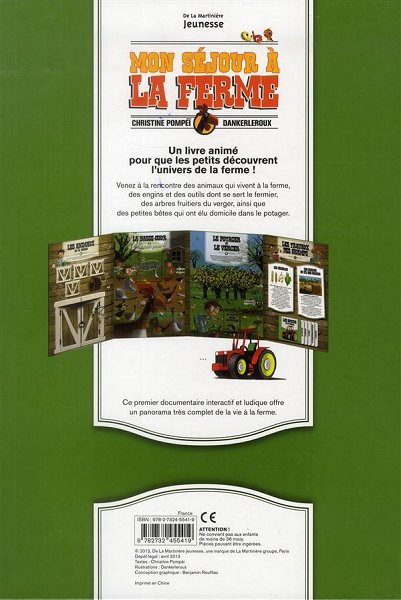 Voici un ouvrage qui vous fera découvrir toutes les facettes de la ferme de manière résolument originale. La démarche est active et pleine de surprises ! Quand on ouvre le livre, on découvre 4 volets avec une multitude de choses à faire : 1er volet : les animaux de la ferme. Un grand corps de ferme avec 5 flaps qui s’ouvrent sur l’écurie, l’étable, la porcherie, le clapier et la niche / Un grand flap de jeux des 7 familles (famille cheval, vache, poule, chien, etc.) 2e volet : la basse-cour.