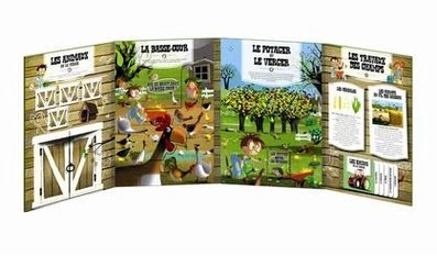 Un mini-livre qui indique les cris des différents animaux de la basse-cour / un grand flap en forme de tête de coq et dessous, des infos sur le coq. 3e volet : le potager et le verger. 6 flaps qui représentent 6 arbres / un dépliant de 4 volet (recto : les petites bêtes du potager / verso : les outils pour jardiner). 4e volet : les travaux des champs. Un encadré sur les céréales / un encadré sur les travaux des champs au fil des saisons / 5 flaps qui représentent les engins de la ferme.