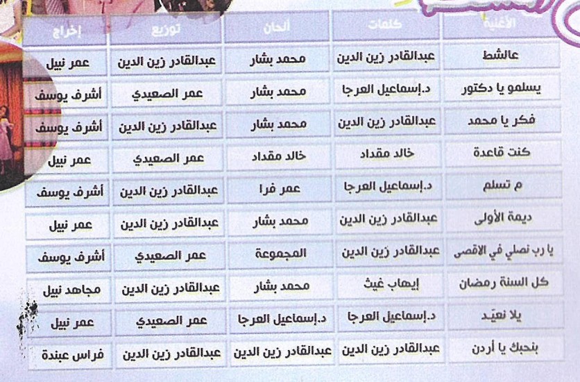 عالشط - يسلمو يا دكتور - فكر يا محمد - كنت قاعدة - م تسلم - ديمة الأولى - يارب نصلي - كل السنة رمضان - يلا نعيد - بنجك ياأردن