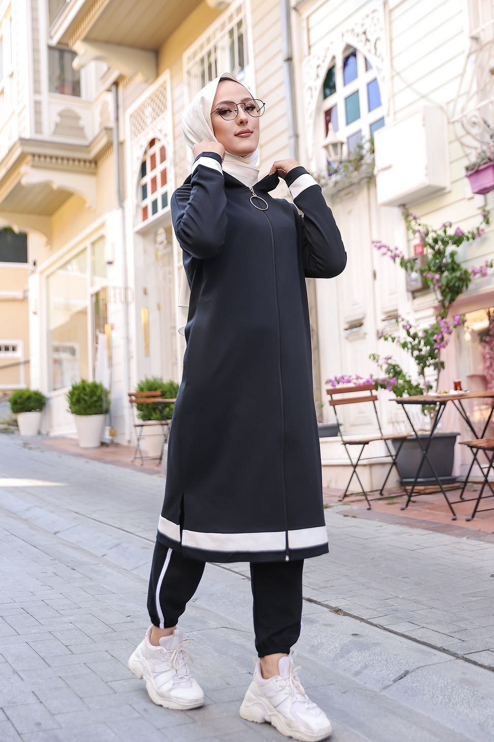 Tunique moderne décontractée et sport avec capuche (Tenue Sportswear Hijab Urban Muslima Wear) - Couleur noir et bleu - REF. 33118 (19.90 €)