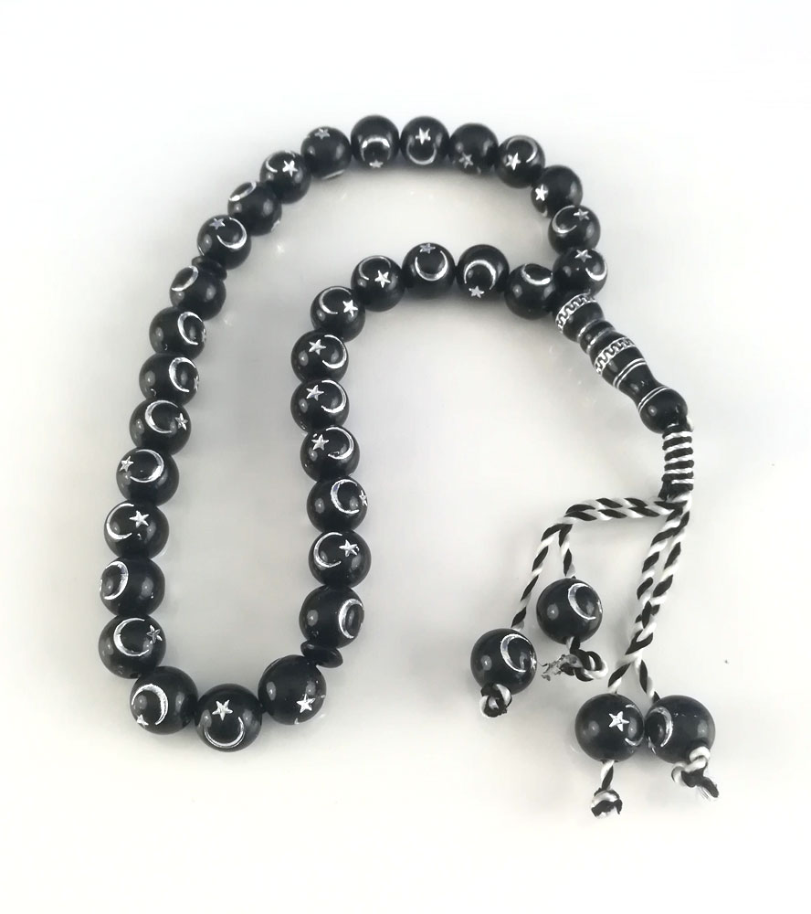 Chapelet "Sebha" à 33 grains en plastique de couleur noir avec motif argenté en forme de croissant et d'étoile.