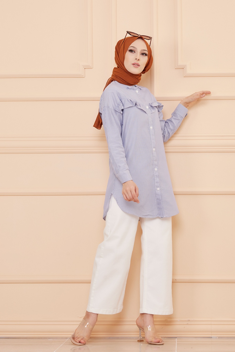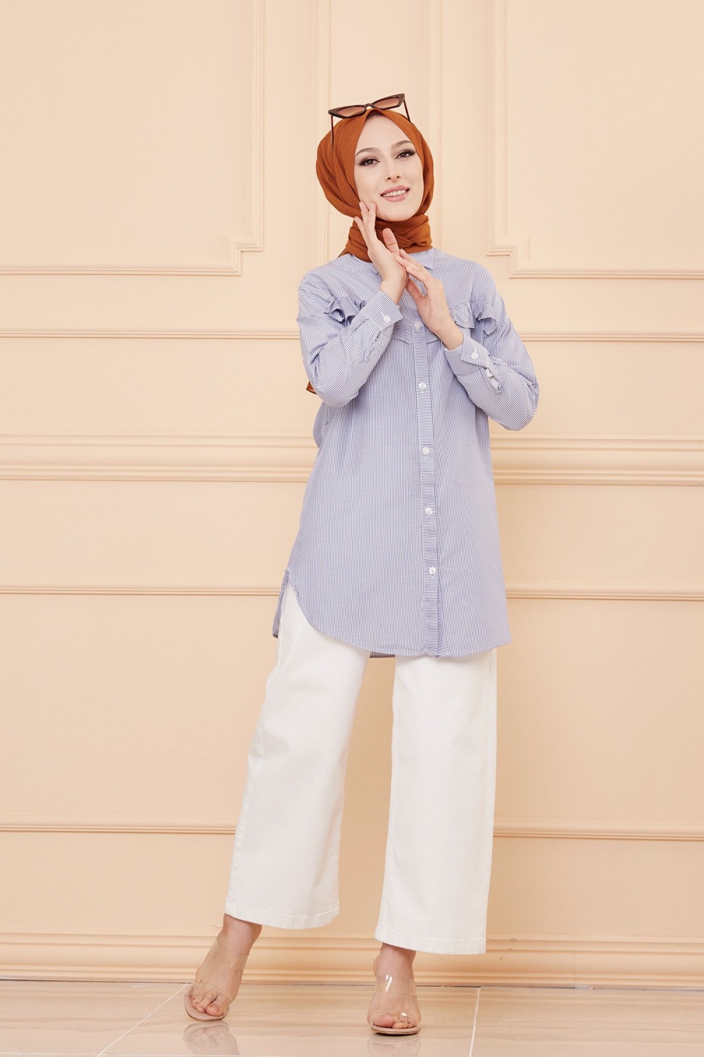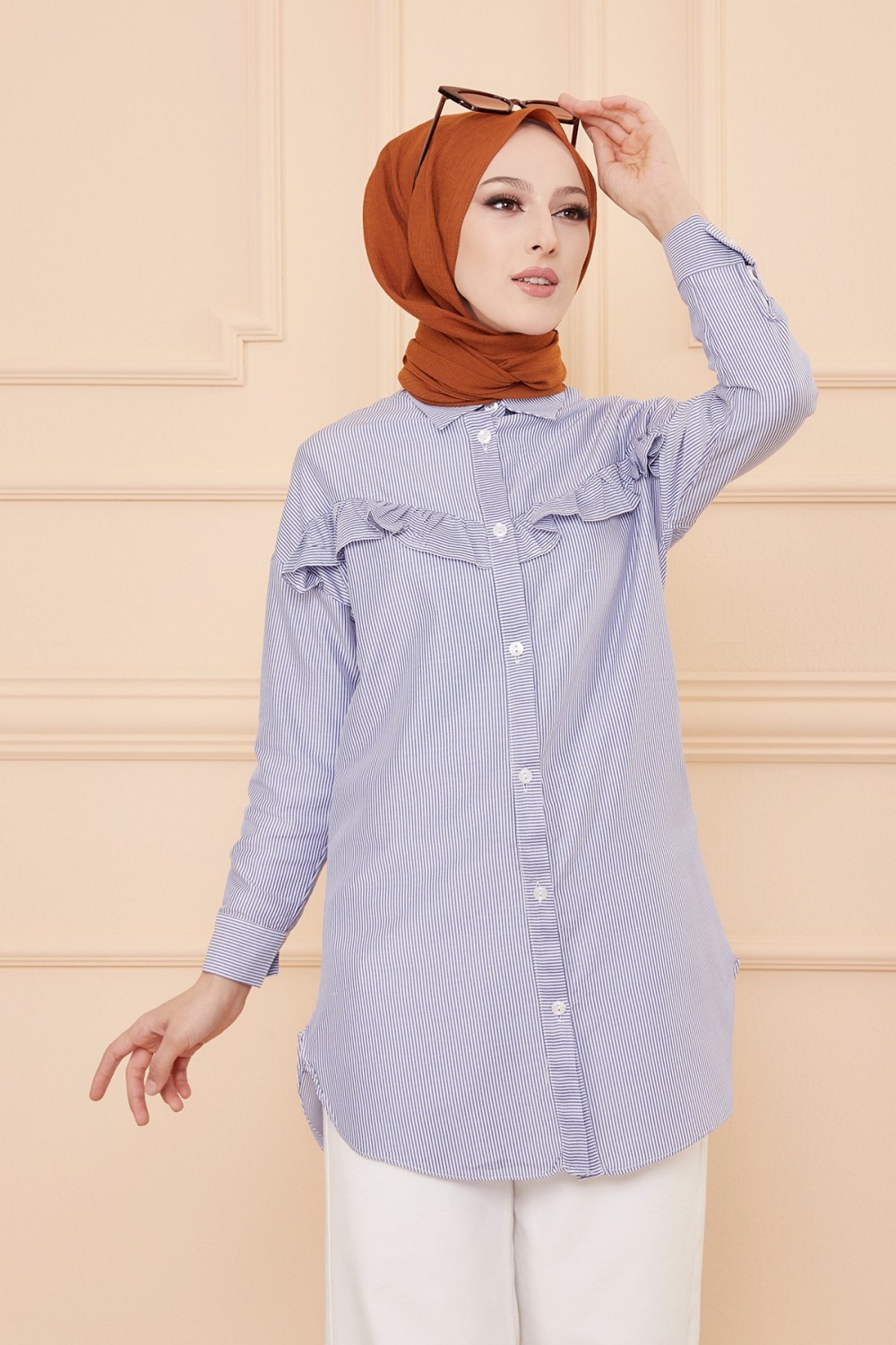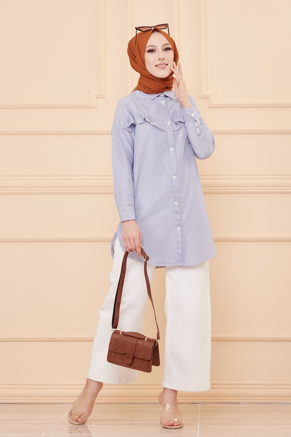 Tunique a froufrous pour femme (Tenue Hidjab) - Rayures couleur bleu