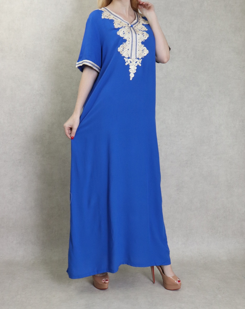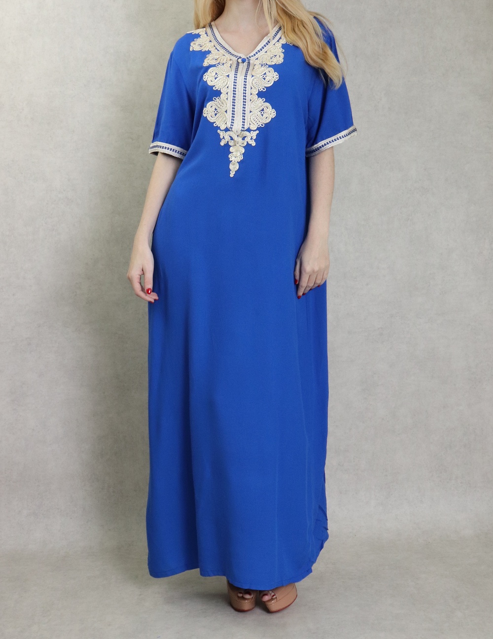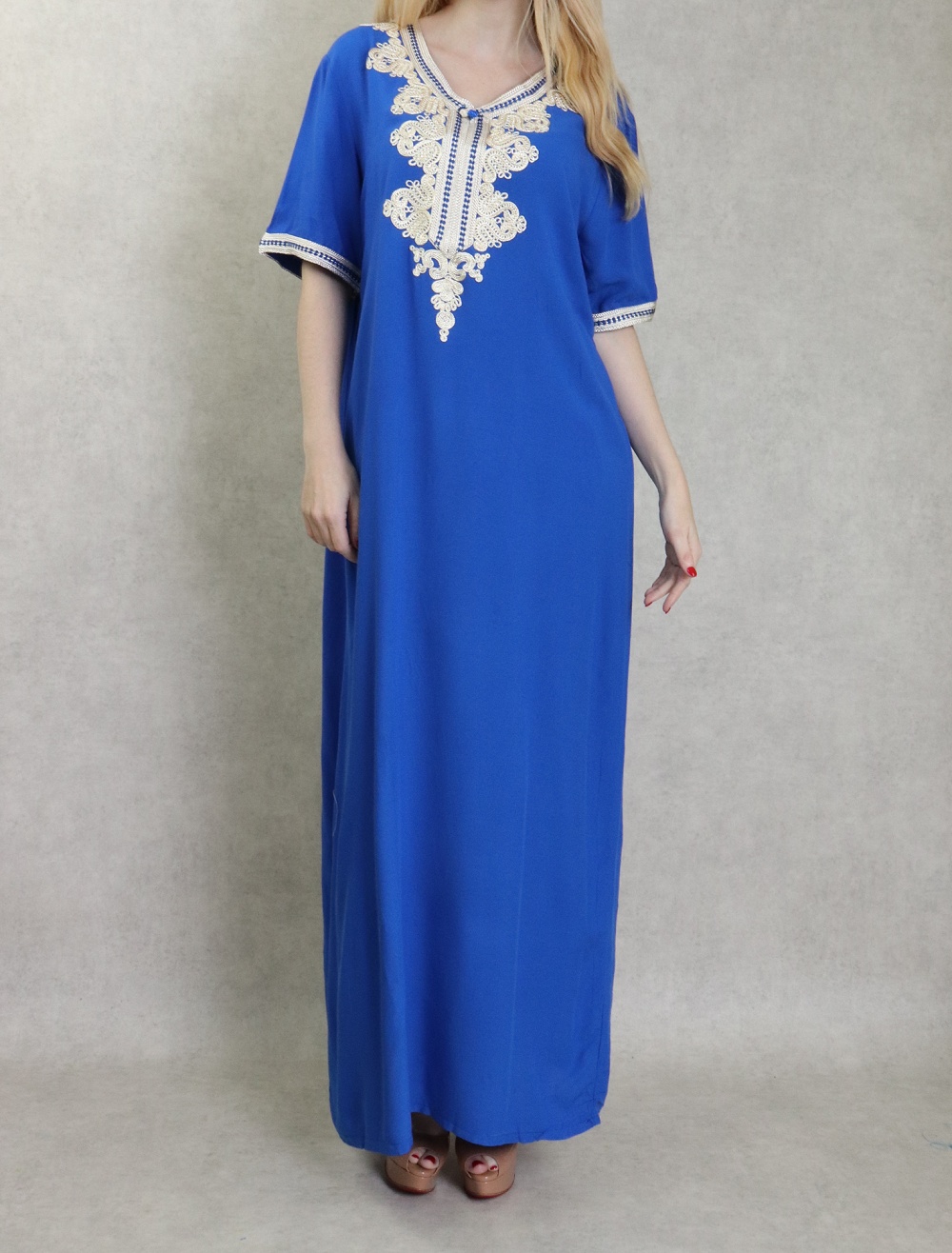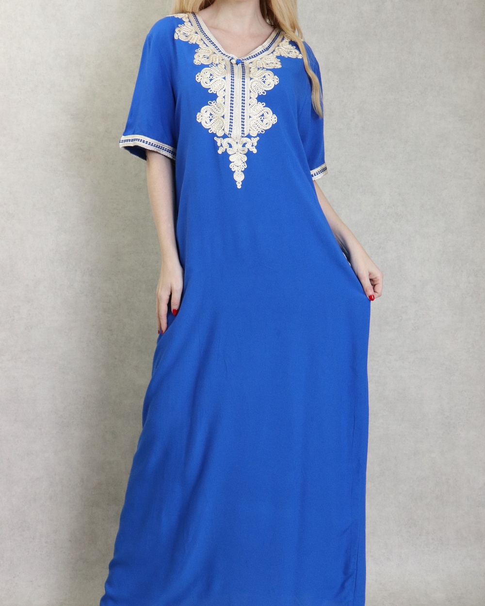 Robe orientale longue brodée manches courtes et décontractée pour femme - Couleur bleu roi Vetement & Accessoire