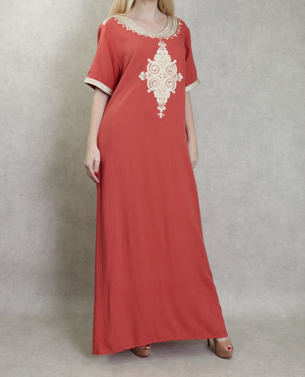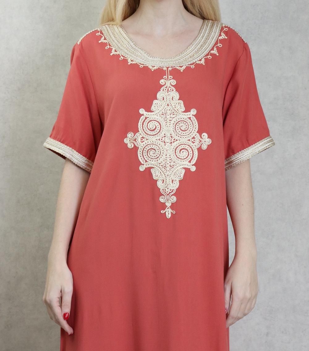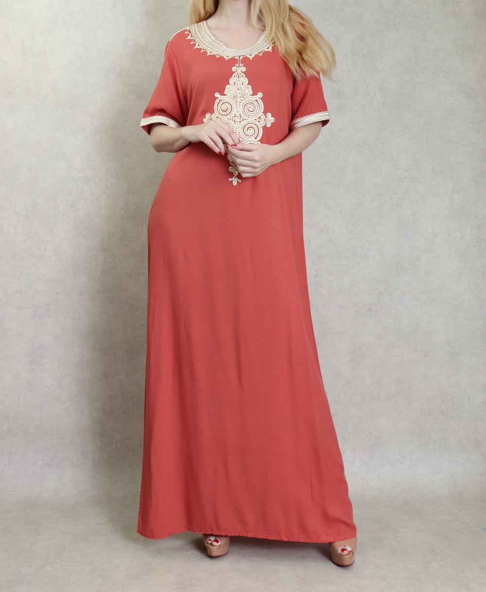 Robe tunisienne d'été longue manches courtes avec broderies - Couleur Rouille Vetement & Accessoire