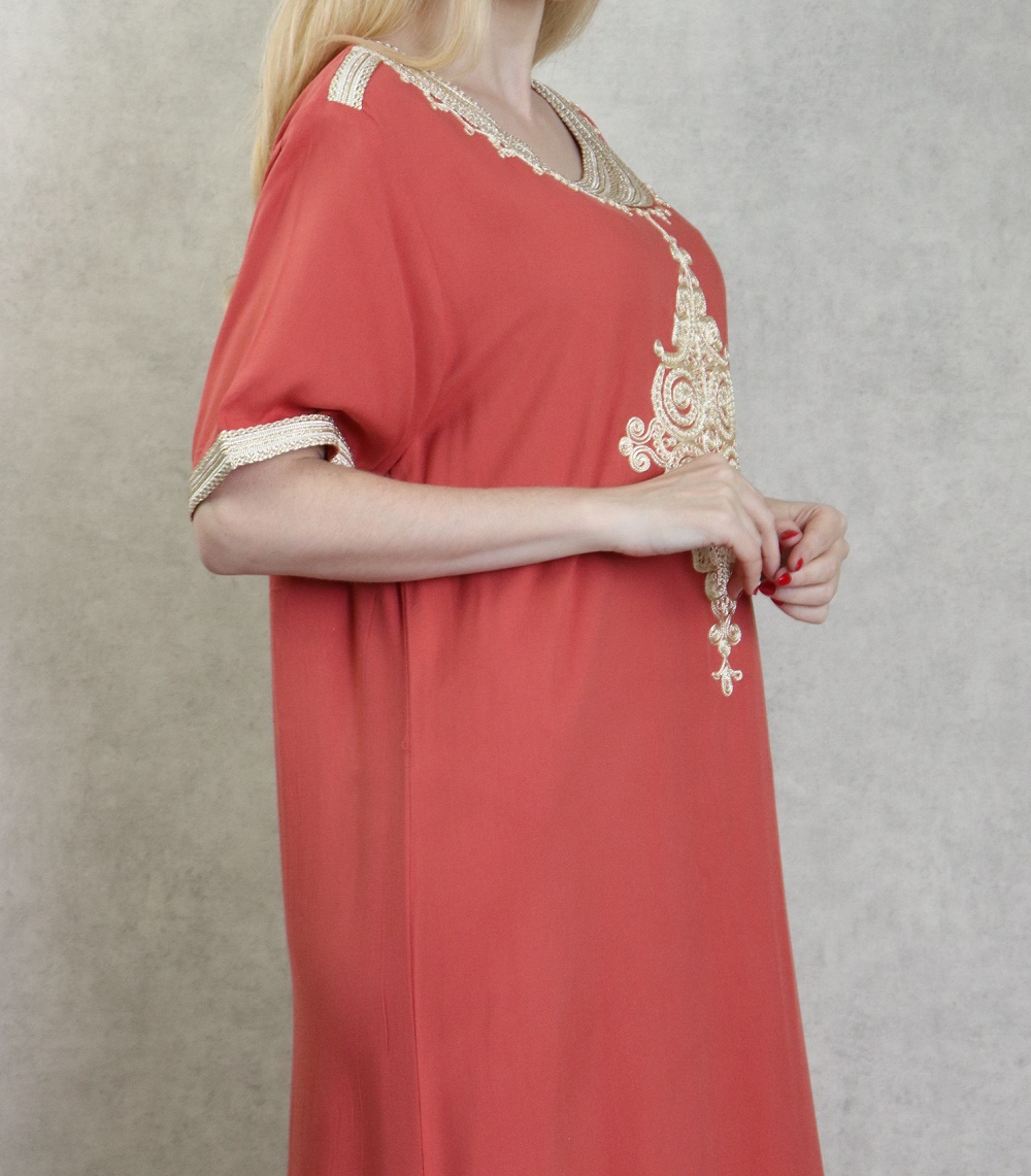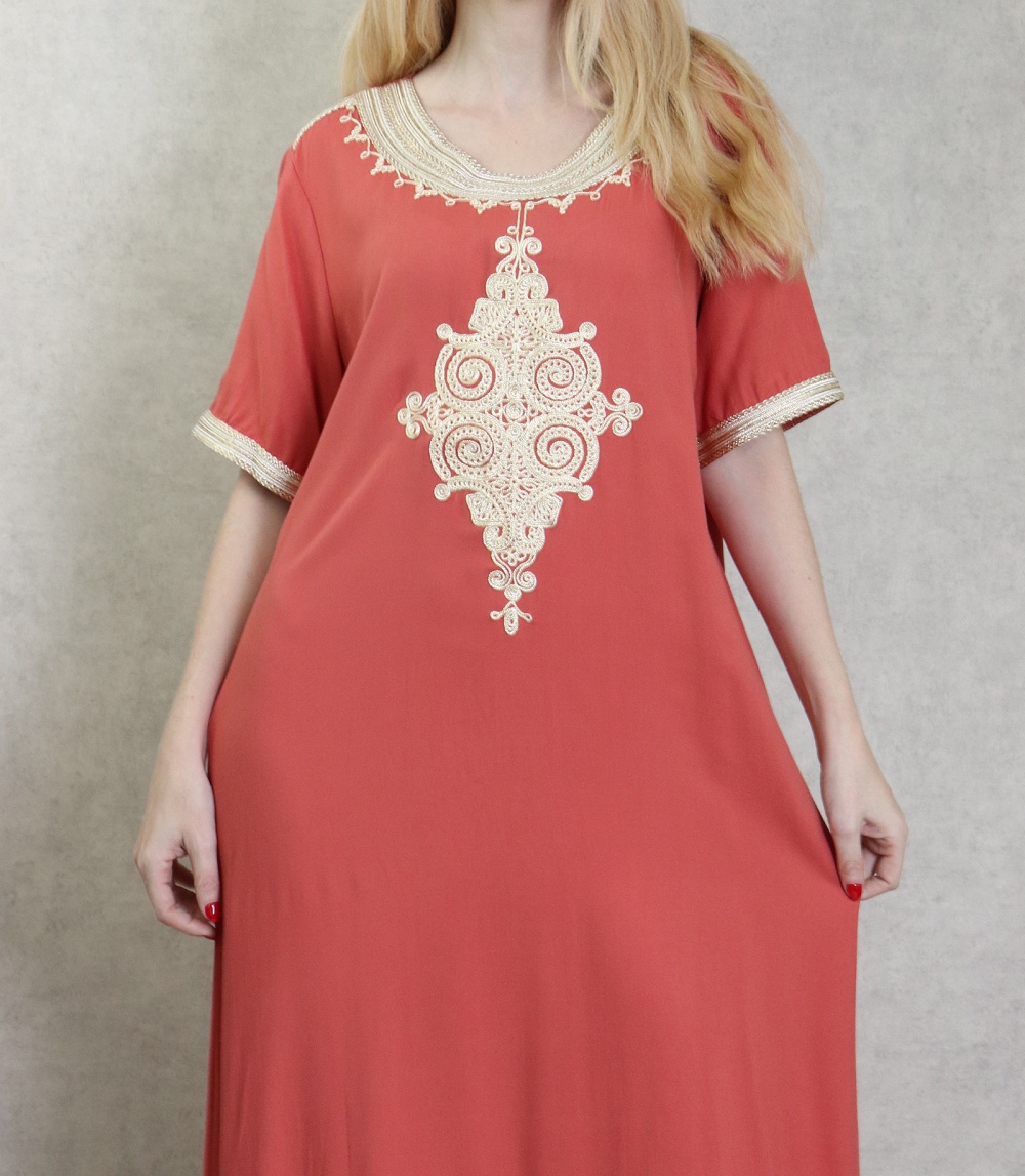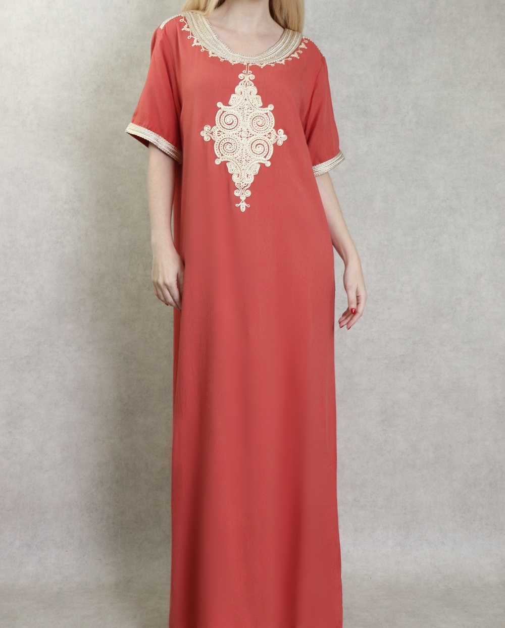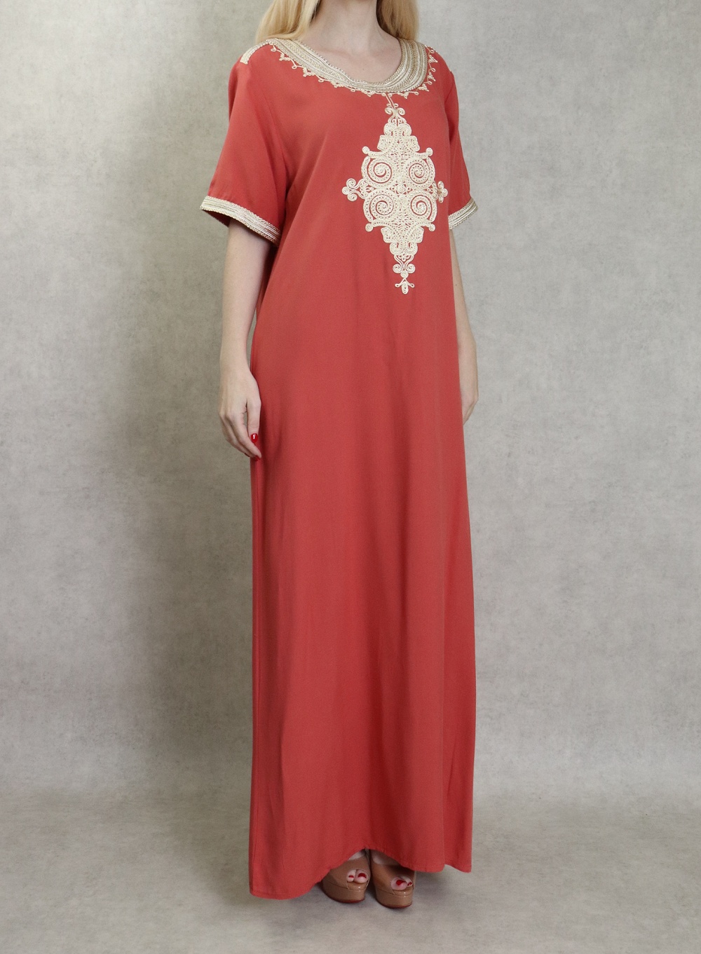 Robe tunisienne d'été longue manches courtes avec broderies - Couleur Rouille Vetement & Accessoire