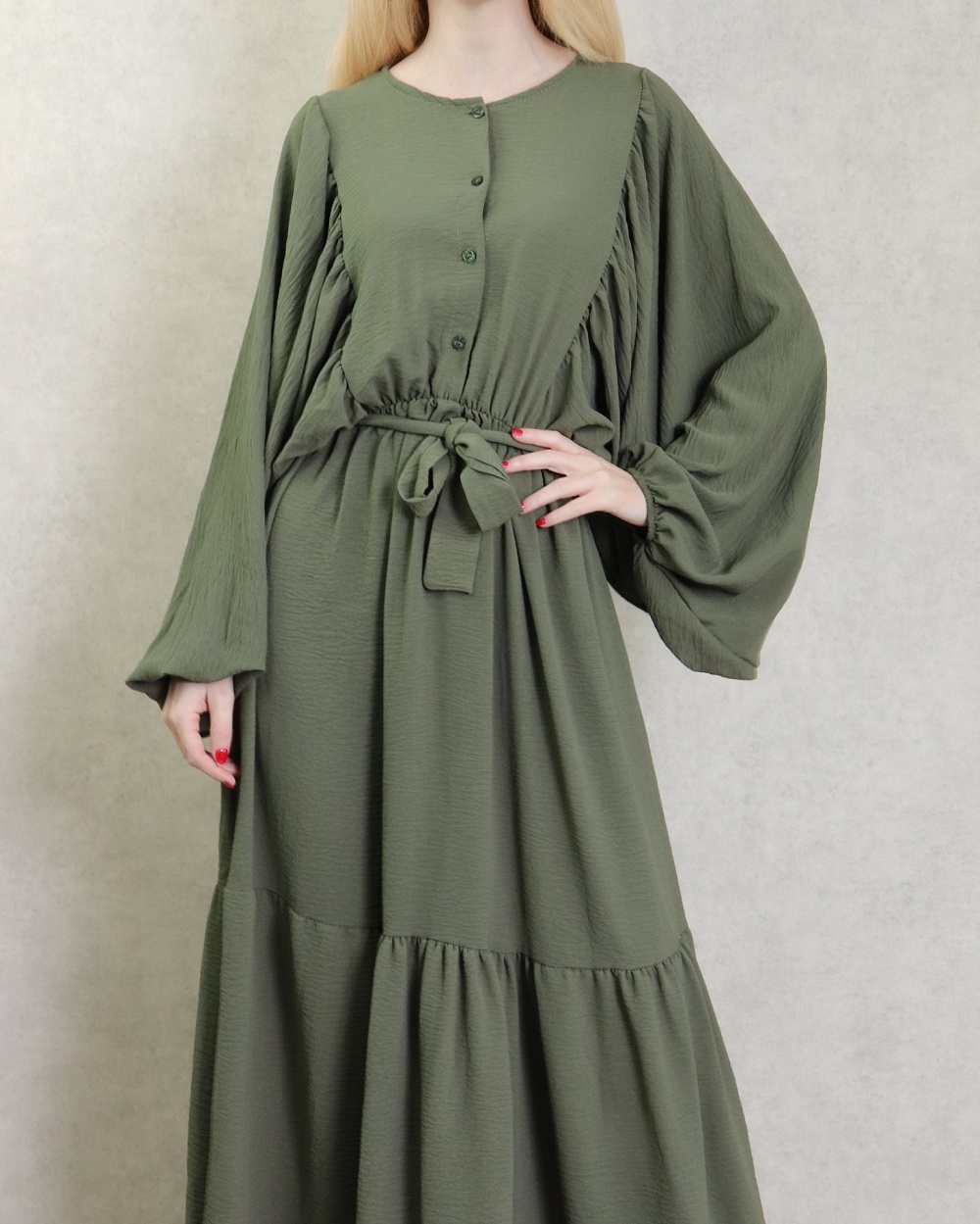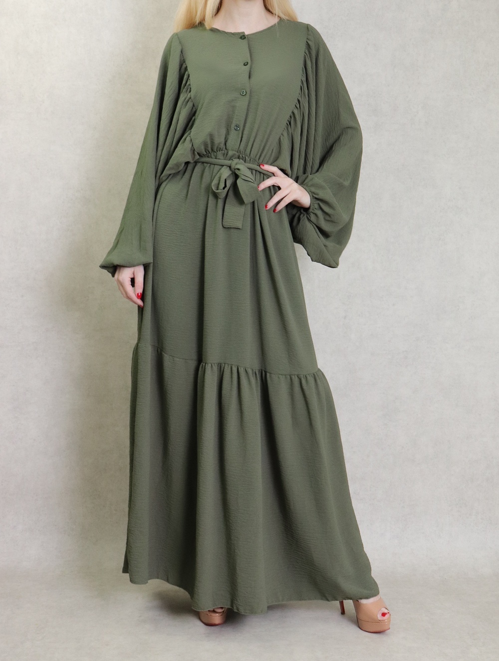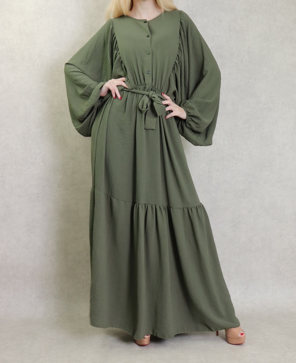 Robe longue, col rond, fermeture boutons sur le buste, taille élastique munie d'une ceinture, tissu fluide, léger et opaque. Manches longues amples esprit chauve-souris resserrées aux poignets.