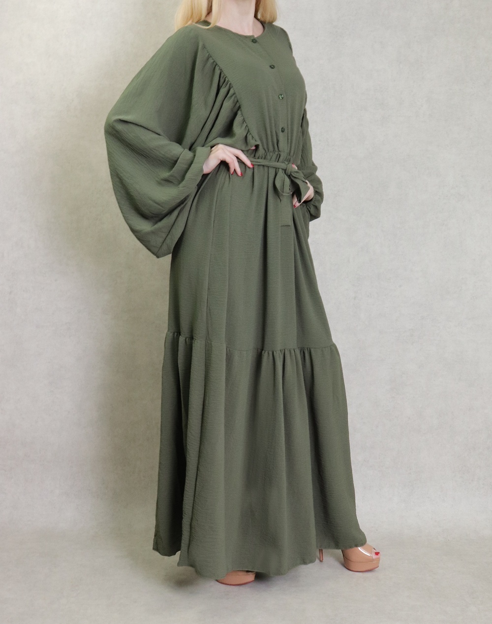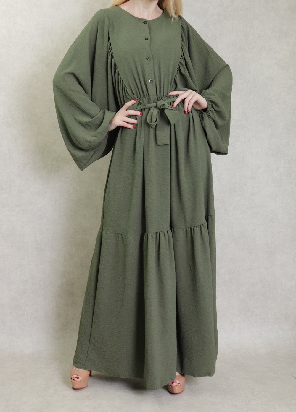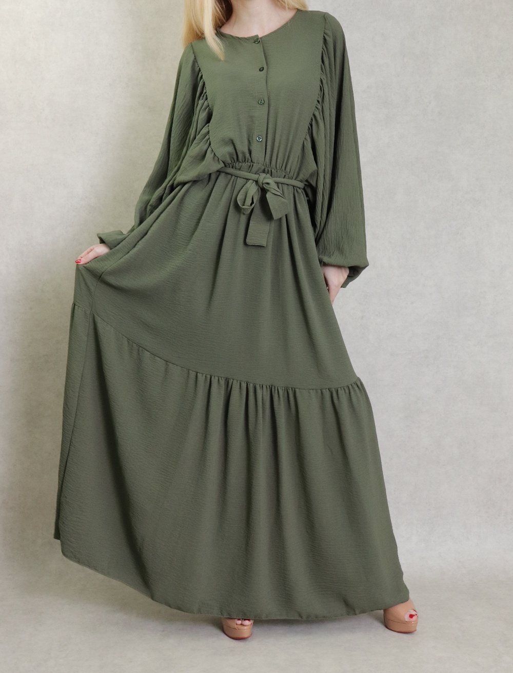 Robe longue, col rond, fermeture boutons sur le buste, taille élastique munie d'une ceinture, tissu fluide, léger et opaque. Manches longues amples esprit chauve-souris resserrées aux poignets.