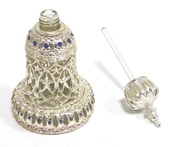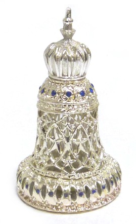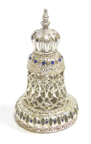 Parfum Musc d'Or "Al-Quds" pour hommes dans jolie bouteille métallique argentée décorée de perles bleues.