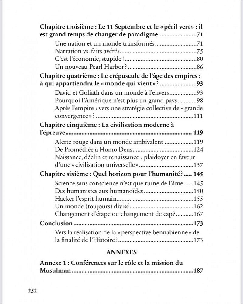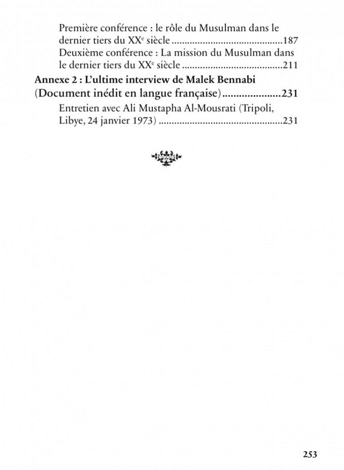 «Dans la succession d'idées que j’ai exposées dans la conférence précédente, j’étais parvenu à une conclusion majeure posant un point d'interrogation aussi bien sur le destin de l'humanité tout entière que sur le rôle du musulman dans le dernier tiers du XXe siècle. J'avais en effet affirmé à la fin de cette conférence que l'Europe avait accompli des miracles dans le monde des découvertes et dans celui des sciences. Mais qu'elle a perdu en son for intérieur cette dimension qui lui procurait réconfort, décontraction et soutien dans l'adversité, car la rattachant à l'existence de Dieu. Si le musulman veut combler ce vide, il lui faudrait d'abord élever son niveau . Je dis toutes ces paroles en tant que testament que je laisse...».
