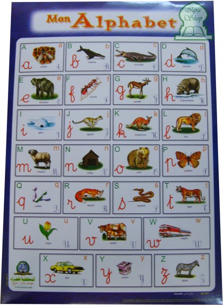 Pour apprendre aux enfants l'alphabet français. Grand poster (70 x 40 cm) + Boite contenant les 26 lettres avec les mêmes illustrations que le poster.