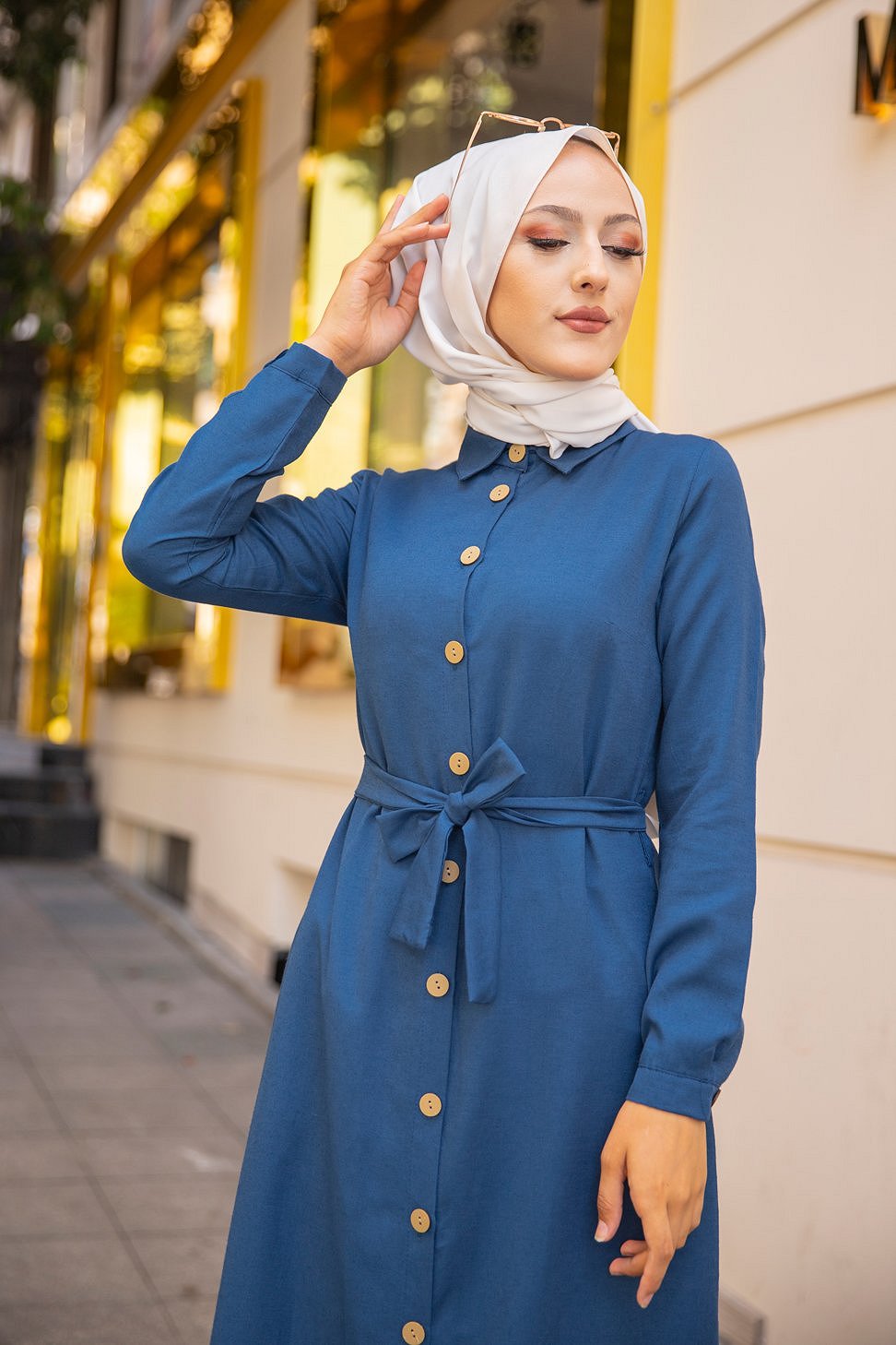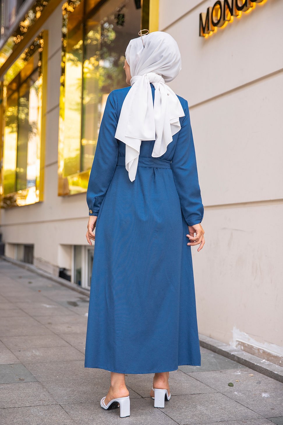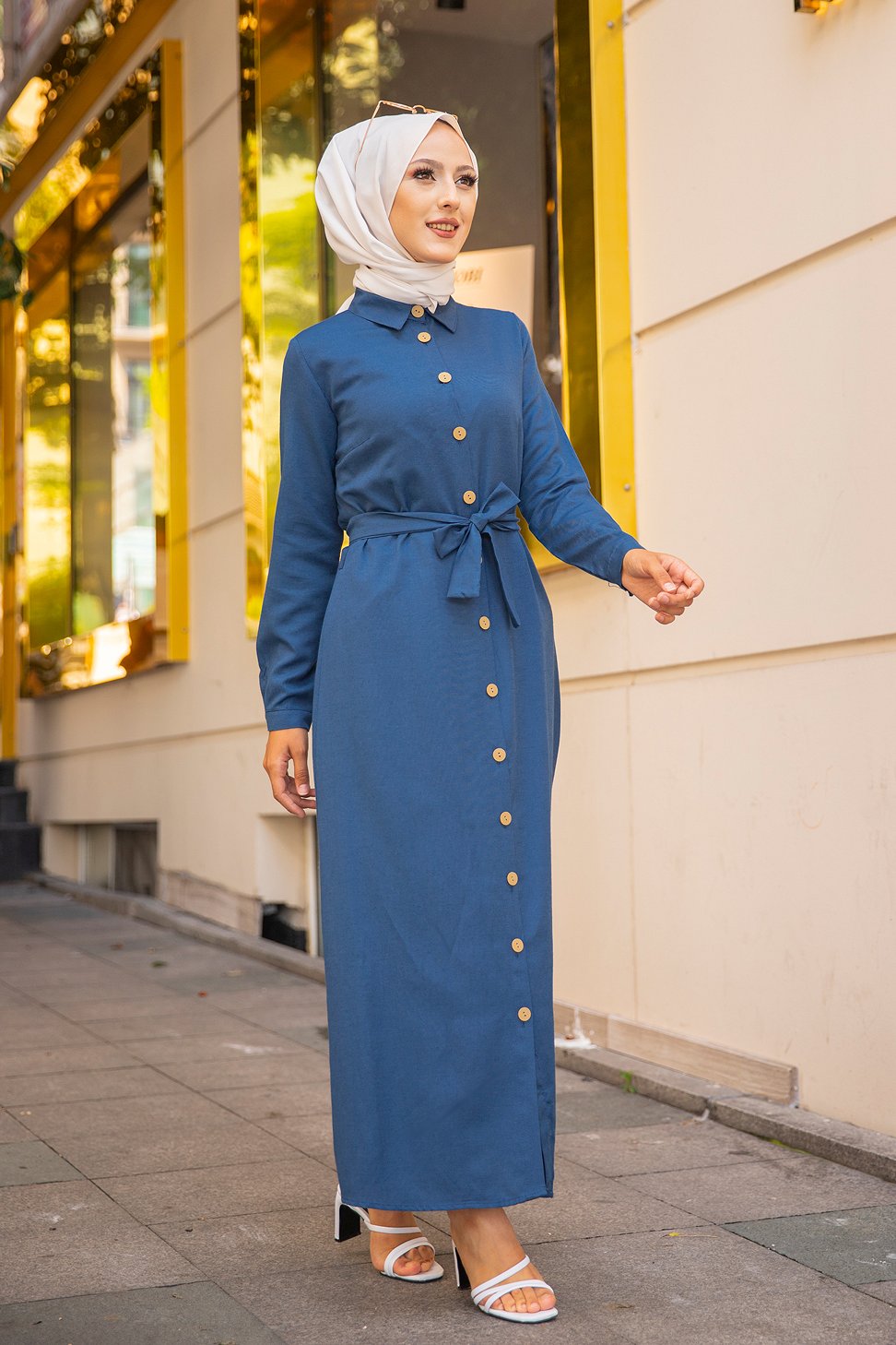 Robe boutonnée avec ceinture assortie pour femme (Tenue de ville chic pour hijab) - Couleur bleu pétrole Vetement & Accessoire