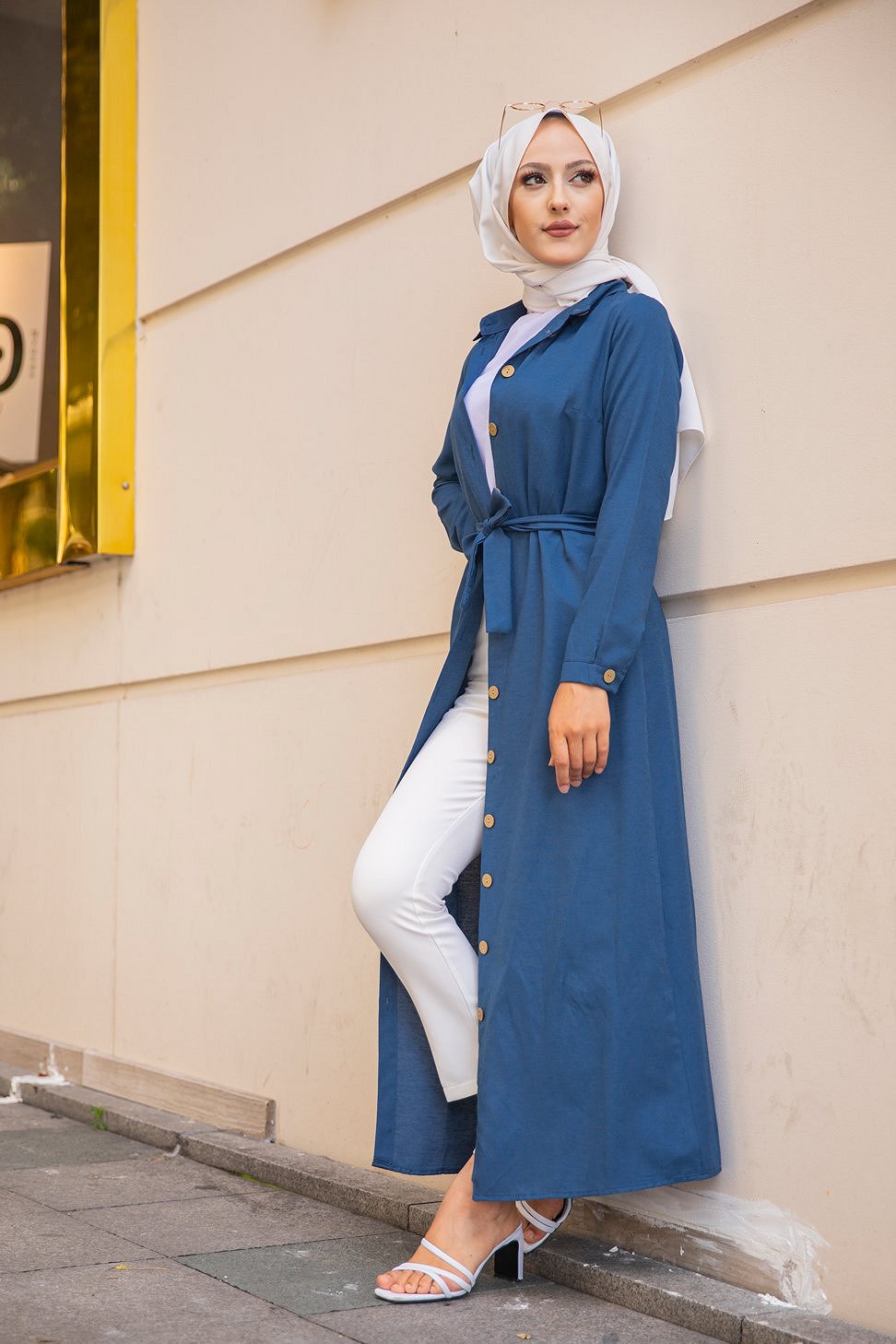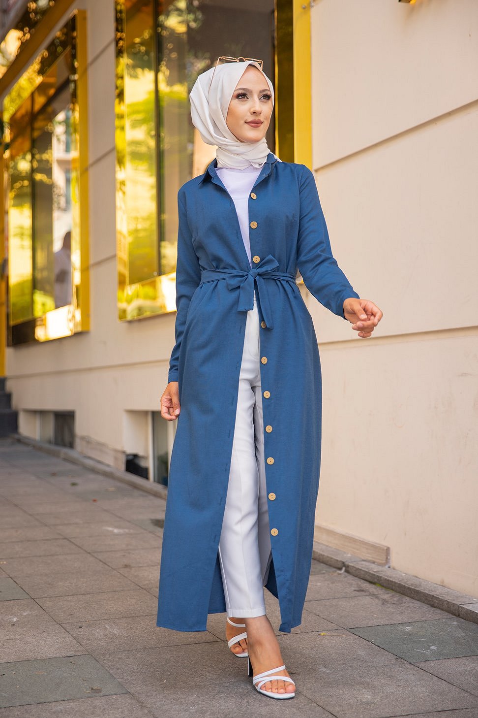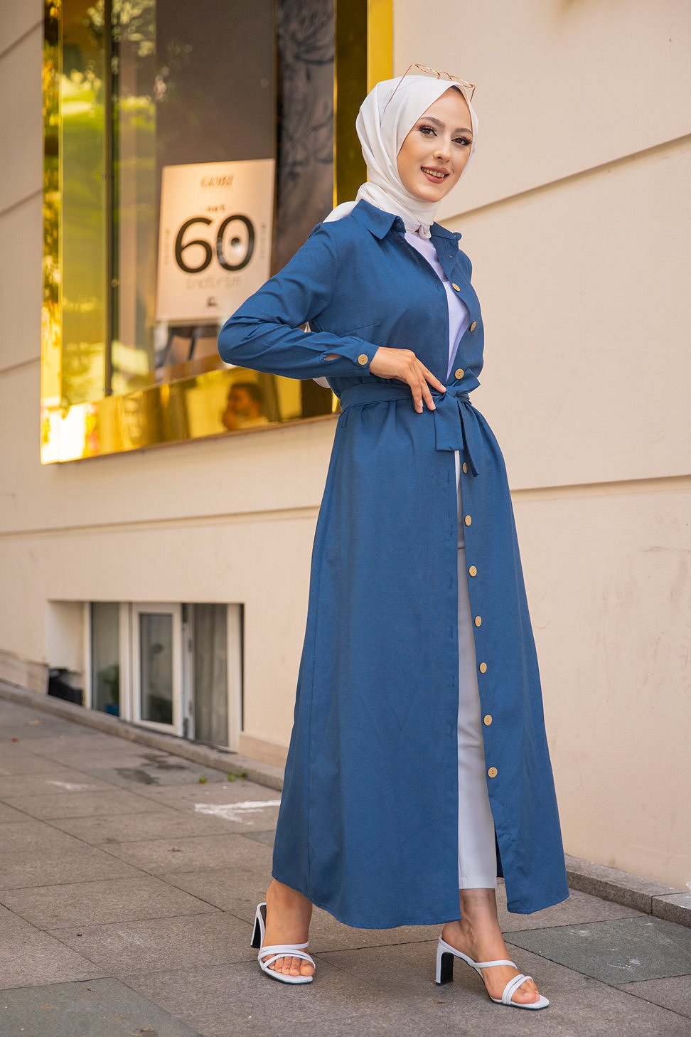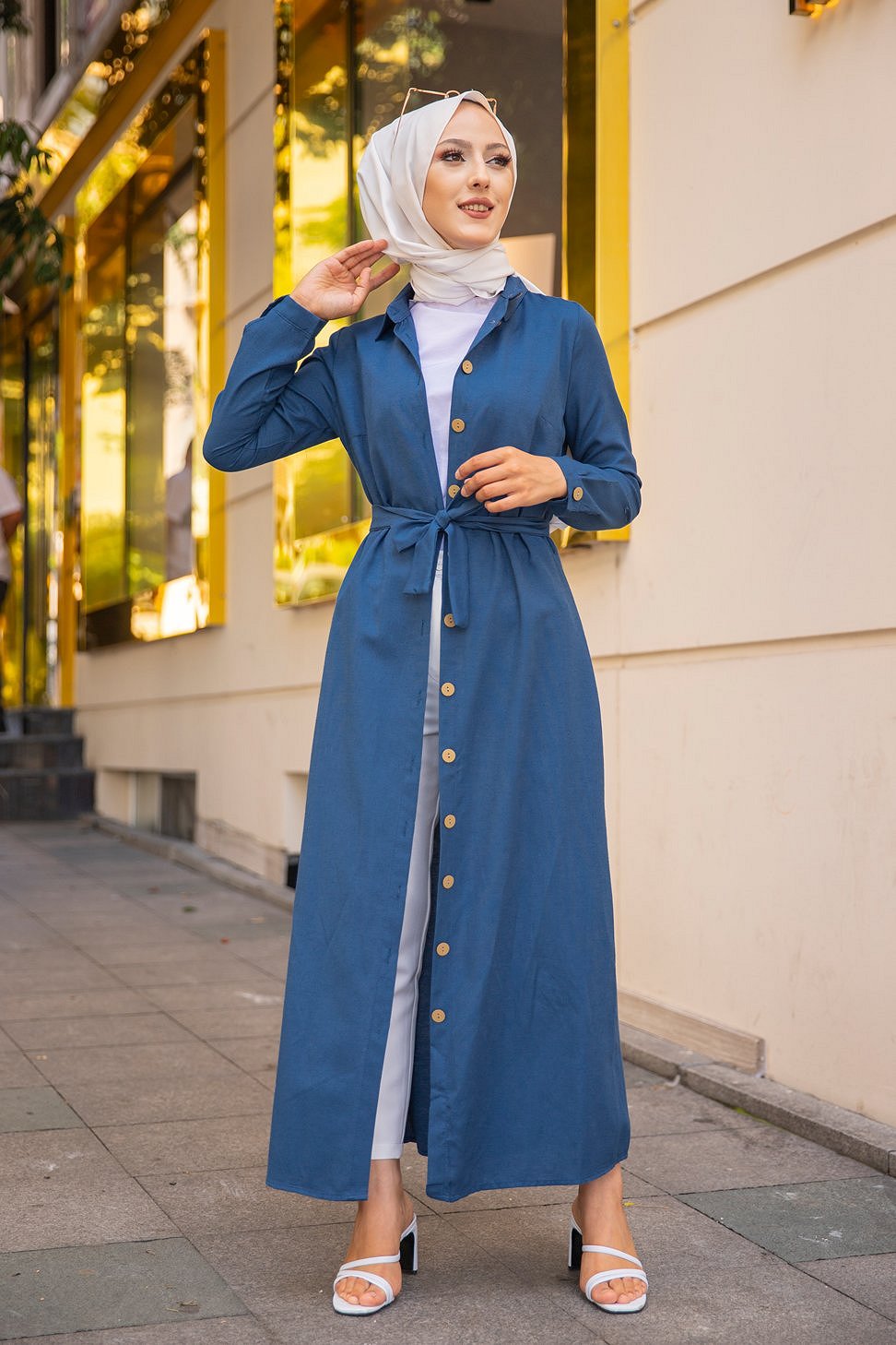 Robe boutonnée avec ceinture assortie pour femme (Tenue de ville chic pour hijab) - Couleur bleu pétrole Vetement & Accessoire